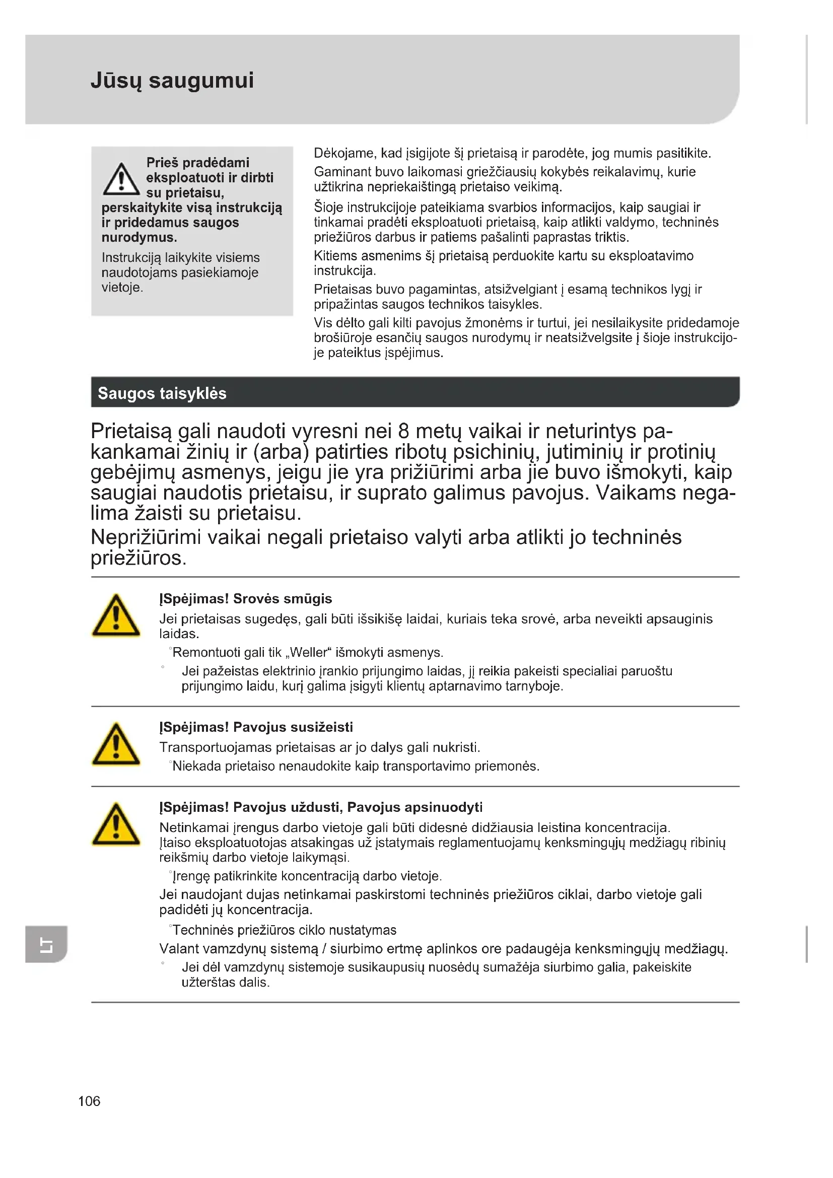 Jūsų saugumui Prieš pradėdami eksploatuoti ir dirbti su prietaisu, perskaitykite visą instrukciją ir pridedamus saugos nurodymus. Instrukcijąlaikykitevisiems naudotojams pasiekiamoje vietoje. Dėkojame,kadįsigijotešįprietaisąirparodėte,jogmumispasitikite. Gaminantbuvolaikomasigriežčiausiųkokybėsreikalavimų,kurie užtikrinanepriekaištingąprietaisoveikimą. Šiojeinstrukcijojepateikiamasvarbiosinformacijos,kaipsaugiaiir tinkamaipradėtieksploatuotiprietaisą,kaipatliktivaldymo,techninės priežiūrosdarbusirpatiemspašalintipaprastastriktis. Kitiemsasmenimsšįprietaisąperduokitekartusueksploatavimo instrukcija. Prietaisasbuvopagamintas,atsižvelgiantįesamątechnikoslygįir pripažintassaugostechnikostaisykles. Visdėltogalikiltipavojusžmonėmsirturtui,jeinesilaikysitepridedamoje brošiūrojeesančiųsaugosnurodymųirneatsižvelgsiteįšiojeinstrukcijo- jepateiktusįspėjimus. Saugos taisyklės Prietaisągalinaudotivyresninei8metųvaikaiirneturintyspa- kankamaižiniųir(arba)patirtiesribotųpsichinių,jutiminiųirprotinių gebėjimųasmenys,jeigujieyraprižiūrimiarbajiebuvoišmokyti,kaip saugiainaudotisprietaisu,irsupratogalimuspavojus.Vaikamsnega- limažaistisuprietaisu. Neprižiūrimivaikainegaliprietaisovalytiarbaatliktijotechninės priežiūros. Spėjimas! Srovės smūgis Jeiprietaisassugedęs,galibūtiišsikišęlaidai,kuriaistekasrovė,arbaneveiktiapsauginis laidas. ˚ Remontuotigalitik„Weller“išmokytiasmenys. ˚ Jeipažeistaselektrinioįrankioprijungimolaidas,jįreikiapakeistispecialiaiparuoštu prijungimolaidu,kurįgalimaįsigytiklientųaptarnavimotarnyboje. Spėjimas! Pavojus susižeisti Transportuojamasprietaisasarjodalysgalinukristi. ˚ Niekadaprietaisonenaudokitekaiptransportavimopriemonės. Spėjimas! Pavojus uždusti, Pavojus apsinuodyti Netinkamaiįrengusdarbovietojegalibūtididesnėdidžiausialeistinakoncentracija. Įtaisoeksploatuotojasatsakingasužįstatymaisreglamentuojamųkenksmingųjųmedžiagųribinių reikšmiųdarbovietojelaikymąsi. ˚ Įrengępatikrinkitekoncentracijądarbovietoje. Jeinaudojantdujasnetinkamaipaskirstomitechninėspriežiūrosciklai,darbovietojegali padidėtijųkoncentracija. ˚ Techninėspriežiūrosciklonustatymas Valantvamzdynųsistemą/siurbimoertmęaplinkosorepadaugėjakenksmingųjųmedžiagų. ˚ Jeidėlvamzdynųsistemojesusikaupusiųnuosėdųsumažėjasiurbimogalia,pakeiskite užterštasdalis.107