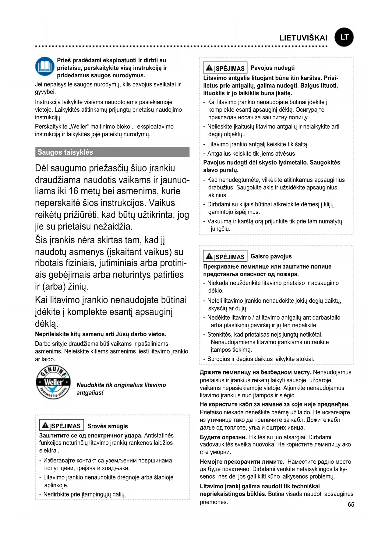Prieš pradėdami eksploatuoti ir dirbti su prietaisu, perskaitykite visą instrukciją ir pridedamus saugos nurodymus. Jei nepaisysite saugos nurodymų, kils pavojus sveikatai ir gyvybei. Instrukciją laikykite visiems naudotojams pasiekiamoje vietoje. Laikykitės atitinkamų prijungtų prietaisų naudojimo instrukcijų. Perskaitykite „Weller“ maitinimo bloko „“ eksploatavimo instrukciją ir laikykitės joje pateiktų nurodymų. Saugos taisyklės Dėl saugumo priežasčių šiuo įrankiu draudžiama naudotis vaikams ir jaunuo- liams iki 16 metų bei asmenims, kurie neperskaitė šios instrukcijos. Vaikus reikėtų prižiūrėti, kad būtų užtikrinta, jog jie su prietaisu nežaidžia. Šis įrankis nėra skirtas tam, kad jį naudotų asmenys (įskaitant vaikus) su ribotais ziniais, jutiminiais arba protini
