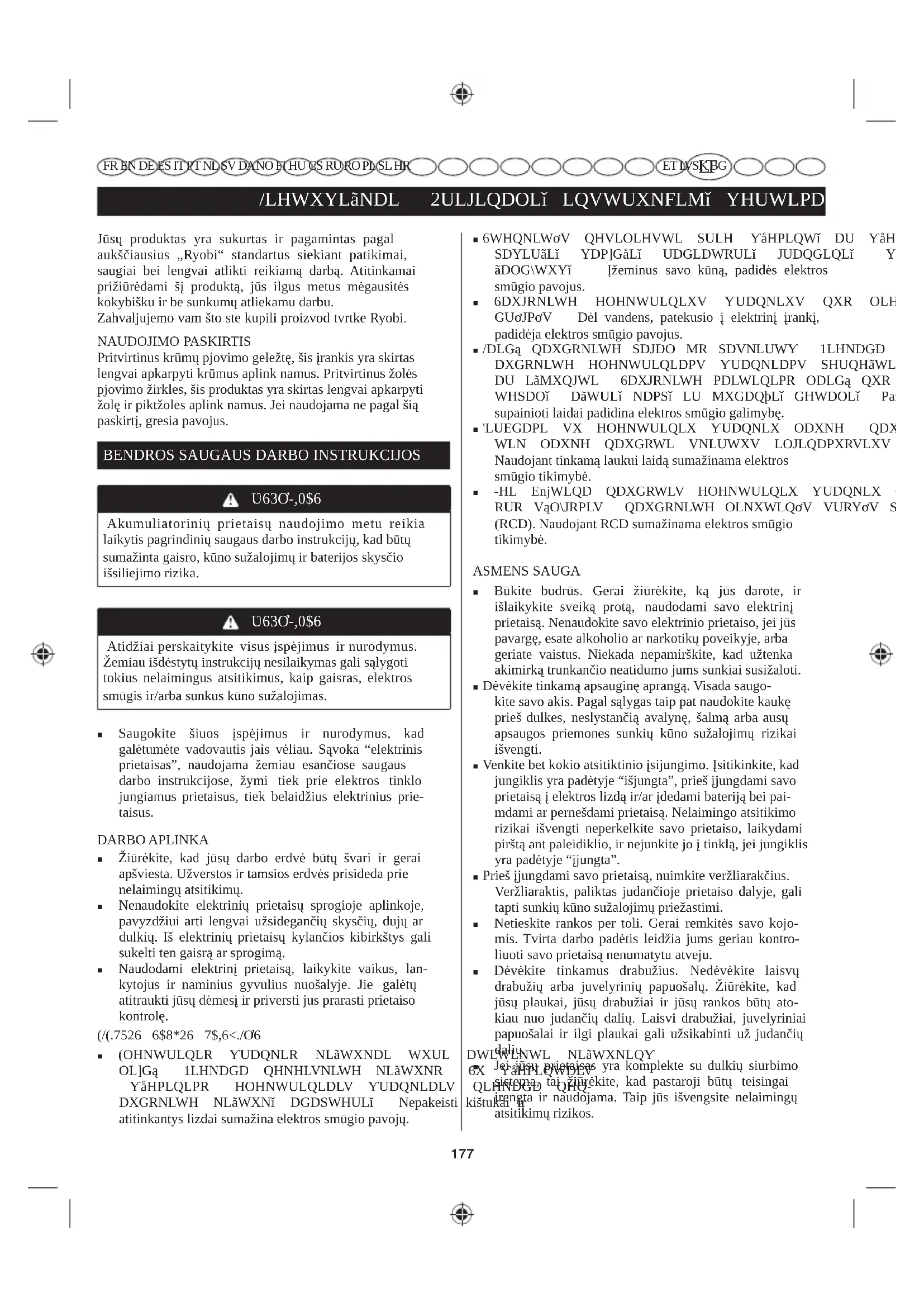 ET LV SK BG (/(.75,1,Ǐ35,(7$,6Ǐ1$8'2-,0$6,57(&+1,1,6 APTARNAVIMAS ■ Neforsuokite prietaiso. Naudokite prietaisą, skirtą darbui, kurį jūs norite atlikti. Jūsų elektrinis prietaisas bus efektyvesnis ir saugesnis, jei jūs naudosite jį jam skirtame režime. ■ Nenaudokite elektrinio prietaiso, jei jungiklis neleidžia jo įjungti ir išjungti. Prietaisas, kurio negalima teisingai įjungti ir išjungti, yra pavojingas, ir jį reikia būtinai pataisyti. ■ Išjunkite savo prietaisą iš tinklo arba išimkite bateriją prieš imdamiesi reguliavimo, priedų pakeitimo ar saugojimo. Taip jūs sumažinsite atsitiktinio prietaiso įsijungimo riziką. ■ Laikykite savo elektrinius prietaisus vaikams nepriei- namoje vietoje. Neleiskite žmonėms, nežinantiems šio prietaiso arba nesusipažinusiems su saugaus darbo instrukcijomis, naudoti šio prietaiso. Elektriniai prietai- sai yra pavojingi nepatyrusių asmenų rankose. ■ Rūpestingai prižiūrėkite savo prietaisus. Patikrinkite judančiųjų dalių centravimą. Patikrinkite, ar kuri nors dalis nėra sugedusi. Patikrinkite surinkimą ir visas kitas dalis, galinčias paveikti prietaiso veikimą. Jei kurios nors dalys yra sugedusios, tai prieš naudo- jant jūsų įrankį tegul jos bus pataisytos. Daugelis nelaimingų atsitikimų įvyksta dėl blogo techninio prietaisų aptarnavimo. ■ Žiūrėkite, kad jūsų prietaisai būtų švarūs ir išgaląsti. Jei pjovimo prietaisas yra gerai išgaląstas ir švarus, tai yra mažiau rizikos, kad jis užsiblokuos, ir jūs galėsite geriau išlaikyti jo kontrolę. ■ Laikykitės šių saugaus darbo instrukcijų, naudodami savo prietaisą, priedus, antgalius ir t.t., atsižvelkite į savo prietaiso ypatumus, savo darbo erdvę ir atliktiną darbą. Kad išvengtumėte pavojingų situacijų, naudo- kite savo elektrinį prietaisą tik darbams, kuriems jis yra skirtas. 6$8*$86 '$5%2 ,16758.&,-26 6.,5726 %(/$,'ä,$0635,(7$,6$06 ■ Įkraukite savo prietaiso bateriją, naudodami tik gamin- tojo nurodytą įkroviklį. Įkroviklis, skirtas tam tikram baterijos tipui, gali sukelti gaisrą, jeigu jis naudojamas su kito tipo baterija. ■ Su akumuliatoriniu prietaisu reikia naudoti tik ypatingą baterijos tipą. Bet kokios kitos baterijos naudojimas gali sukelti gaisrą. ■ Kai baterija nenaudojama, laikykite ją atokiau nuo tokių metalinių daiktų kaip sąvaržėlės, monetos, rak- tai, varžtai, vinys, ar bet kokio kito daikto, galinčio sujungti jos kontaktus. Baterijos kontaktų trumpasis sujungimas gali tapti nudegimo ar gaisro priežastimi. ■ Venkite bet kokio kontakto su baterijos skysčiu bateri- jos skysčio išsiliejimo dėl neteisingo naudojimo atveju. Jei tai įvyksta, gausiai praplaukite paveiktą odą švariu vandeniu. Jei jūsų akys yra paveiktos, tai taip pat pasitarkite su gydytoju. Iš baterijos išmestas skystis gali sukelti dirginimą arba nudegimą. TECHNINIS APTARNAVIMAS ■ Reikia, kad taisymus atliktų kvalifikuotas specialistas, naudodamas tik originalias atsargines dalis. Taip jūs galėsite naudoti savo elektrinį prietaisą visai saugiai. Ʋ63Ơ-,0$6 Ilgai naudojant įrankį, galima susižaloti arba pakenkti sveikatai. Ilgai naudodami kokį nors įrankį, reguliariai darykite pertraukas. 35,(â 1$8'2'$0, âƲ 35,(7$,6Ą 3(56.$,7<.,7( VISAS SAUGAUS DARBO INSTRUKCIJAS. ■ Atidžiai perskaitykite visas saugaus darbo instrukcijas. Susipažinkite su savo prietaiso taikymo sritimis ir su jo veikimu. ■ Nenaudokite šio prietaiso, jei jūs pavargę, sergate, esate alkoholio ar narkotikų poveikyje, arba geriate vaistus. ■ Prieš naudodami savo prietaisą, patikrinkite jo būklę. Pakeiskite sugedusias dalis. Įsitikinkite, kad nėra bate- rijos skysčio išsiliejimo. ■ Nenaudokite elektrinių prietaisų sprogimo atžvilgiu pavojingoje aplinkoje, pavyzdžiui arti lengvai užsidegančių skysčių, dujų ar dulkių. ■ Įsitikinkite, kad visi fiksatoriai ir apsauginės priemonės yra savo vietoje ir teisingai pritvirtinti. Pakeiskite bet kokius ašmenis ar kita įtrūkusią, ištrupėjusią ar sugedusią dalį. Įsitikinkite, kad ašmenys yra teisingai įrengti ir gerai pritvirtinti. Šių nurodymų nesilaikymas sukelia sunkių kūno sužalojimų riziką vartotojui arba lankytojams ir prietaiso sugadinimo riziką. ■ Naudokite tinkamą prietaisą. Naudokite savo prietaisą tiktai taikymo sritims, kurioms jis yra skirtas. ■ Nenaudokite savo prietaiso, jei jungiklis neleidžia jo teisingai įjungti ir išjungti. Prietaisas, kurio negalima teisingai įjungti ir išjungti, yra pavojingas, ir jį reikia būtinai pataisyti. ■ Prieš naudodami savo prietaisą, išvalykite pjovimo plotą. Pašalinkite lynus, elektros laidus, kabelius, virveles ir kitus daiktus, kurie galėtų užsikabinti už ašmenų. ■ Reikia laikyti vaikus, lankytojus ir naminius gyvu- lius nuošalyje nuo darbo vietos. Laikykite vaikus, lankytojus ir gyvulius bent 15 m atstumu, kadangi pjovimo metu gali atšokti daiktai. Patartina, kad lanky- tojai naudotų apsauginius akinius. Jei kažkoks asmuo prisiartins prie jūsų pjovimo metu, tai nedelsdami išjunkite savo prietaisą. ■ Kad išvengtumėte elektros smūgio rizikos, saugokite179 /LHWXYLãNDL2ULJLQDOLǐLQVWUXNFLMǐYHUWLPDV FR EN DE ES IT PT NL SV DA NO FI HU CS RU RO PL SL HR