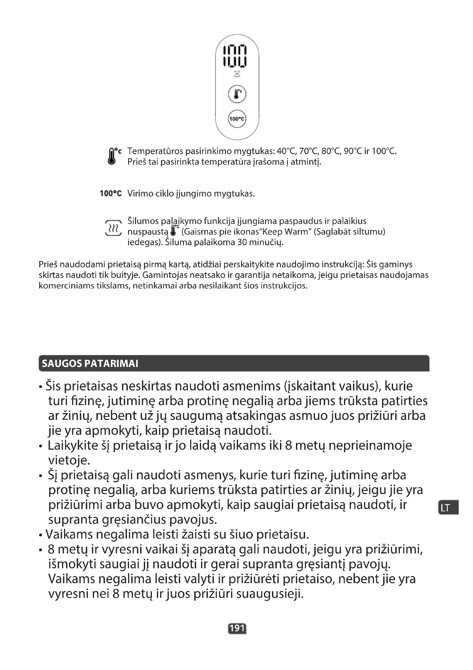 Temperatūros pasirinkimo mygtukas: 40°C, 70°C, 80°C, 90°C ir 100°C. Prieš tai pasirinkta temperatūra įrašoma į atmintį. Virimo ciklo įjungimo mygtukas. Šilumos palaikymo funkcija įjungiama paspaudus ir palaikius nuspaustą (Gaismas pie ikonas“Keep Warm” (Saglabāt siltumu) iedegas). Šiluma palaikoma 30 minučių.192