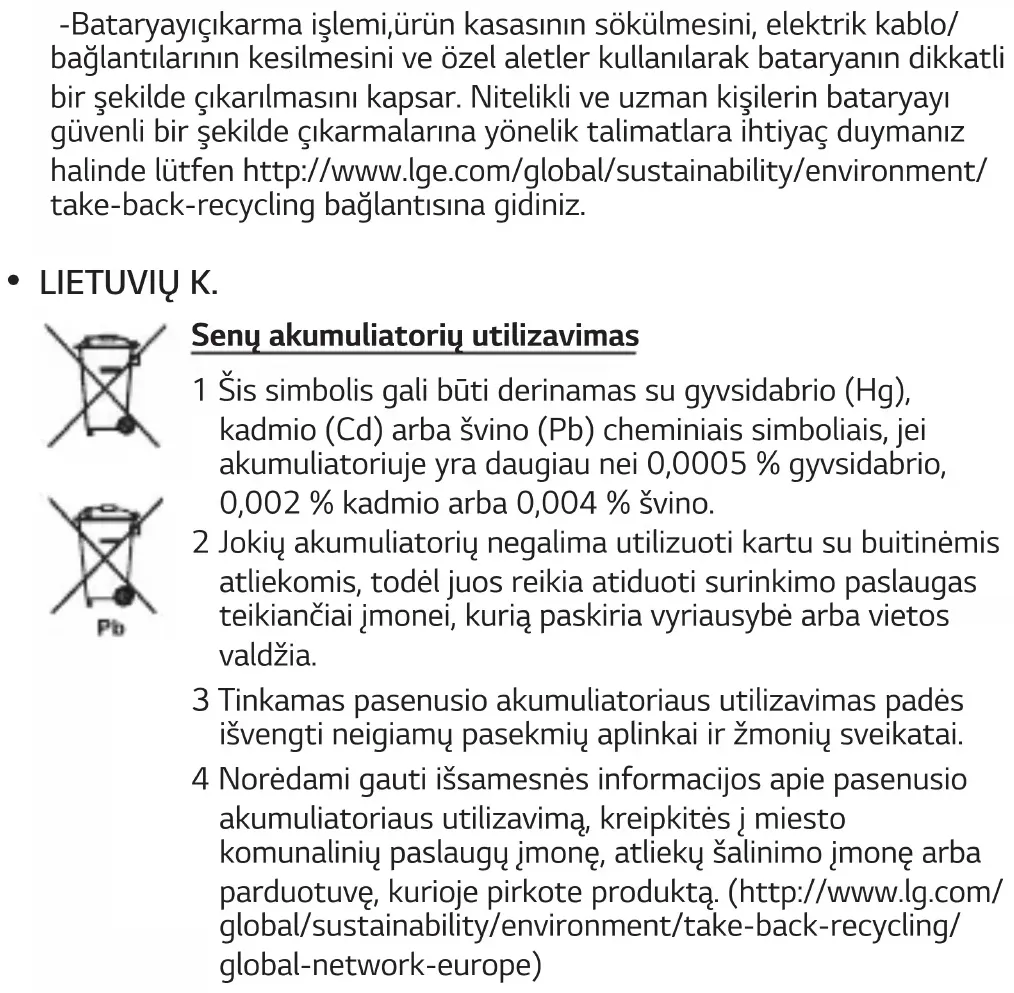 LIETUVIŲ K. Senų akumuliatorių utilizavimas 1 Šis simbolis gali būti derinamas su gyvsidabrio (Hg), kadmio (Cd) arba švino (Pb) cheminiais simboliais, jei akumuliatoriuje yra daugiau nei 0,0005 % gyvsidabrio, 0,002 % kadmio arba 0,004 % švino. 2 Jokių akumuliatorių negalima utilizuoti kartu su buitinėmis atliekomis, todėl juos reikia atiduoti surinkimo paslaugas teikiančiai įmonei, kurią paskiria vyriausybė arba vietos valdžia. 3 Tinkamas pasenusio akumuliatoriaus utilizavimas padės išvengti neigiamų pasekmių aplinkai ir žmonių sveikatai. 4 Norėdami gauti išsamesnės informacijos apie pasenusio akumuliatoriaus utilizavimą, kreipkitės į miesto komunalinių paslaugų įmonę, atliekų šalinimo įmonę arba parduotuvę, kurioje pirkote produktą. (http://www.lg.com/ global/sustainability/environment/take-back-recycling/ global-network-europe)Baterijų ir akumuliatorių atliekų pašalinimas (TIK produktams su integruotu akumuliatoriumi) -Jei šiame produkte įmontuotas akumuliatorius, kurio tiesioginis naudotojas lengvai pašalinti negali, „LG“ rekomenduoja kad akumuliatorių, jo keitimo atveju arba perdirbimo produkto tarnavimo laiko pabaigoje, pašalintų tik kvalikuoti specialistai. Siekiant apsaugoti įrenginį nuo apgadinimo ir jūsų pačių saugumui, naudotojai neturėtų bandyti patys pašalinti akumuliatoriaus ir norėdami gauti patarimų turėtų susisiekti su „LG“ Paslaugų pagalbos linija ar kitais nepriklausomais paslaugų tiekėjais. -Akumuliatoriaus pašalinimas apima produkto korpuso išardymą, elektrinių kabelių/kontaktų atjungimą ir atsargų akumuliatoriaus elemento išėmimą naudojant specialius įrankius. Jei jums reikia kvalikuotiems specialistams skirtų instrukcijų kaip saugiai pašalinti akumuliatorių, prašome apsilankyti http://www.lge.com/global/ sustainability/environment/take-back-recycling.