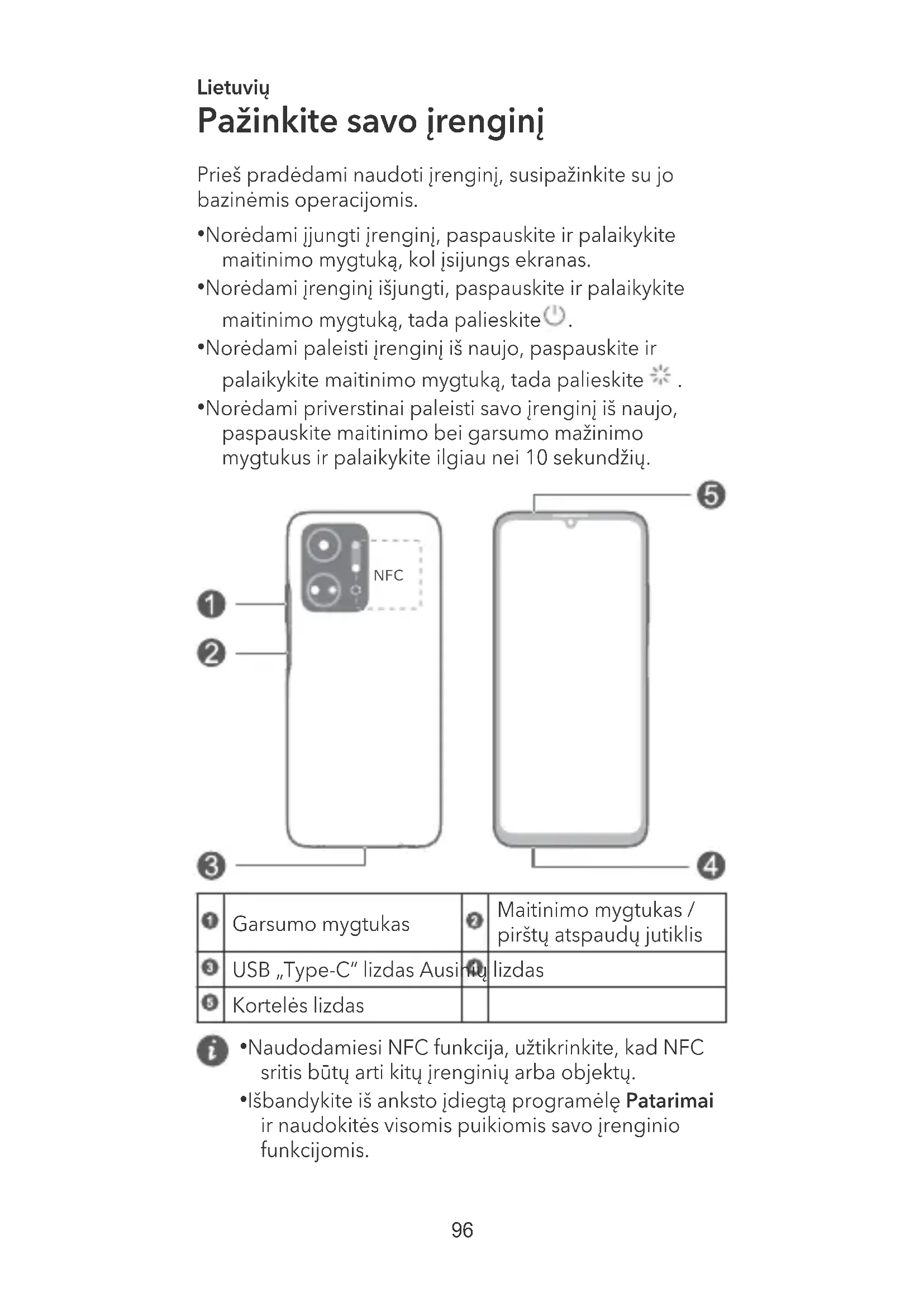 - Norėdami priverstinai paleisti savo įrenginį iš naujo, paspauskite maitinimo bei garsumo mažinimo mygtukus ir palaikykite ilgiau nei 10 sekundžių. NFC Garsumo mygtukas Maitinimo mygtukas / pirštų atspaudų jutiklis USB „Type-C“ lizdas Ausinių lizdas Kortelės lizdas