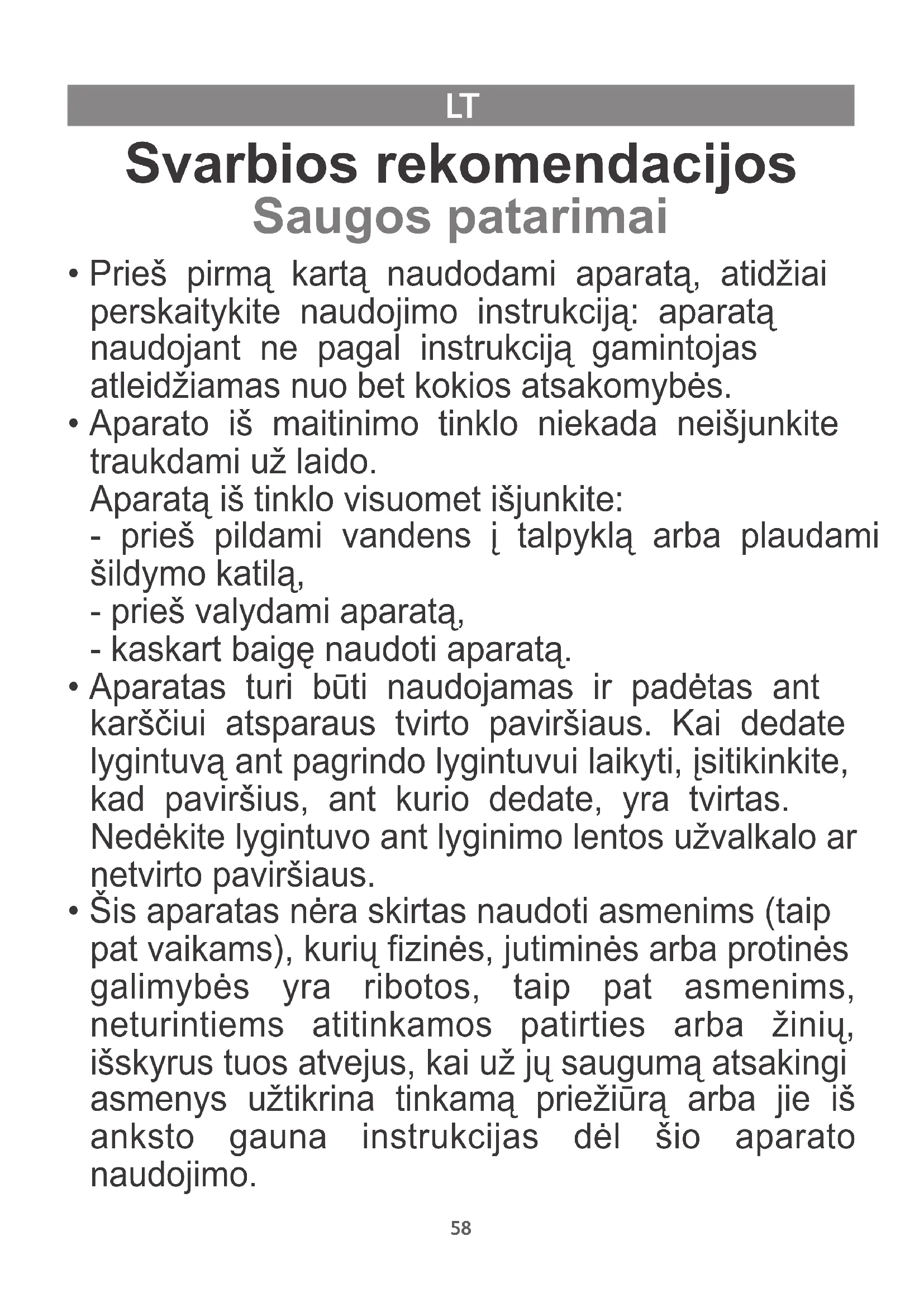 - 8 metų ir vyresni vaikai, asmenys, neturintys atitinkamos patirties ir žinių, arba asmenys, kurių fizinės, jutiminės arba protinės galimybės yra ribotos, šį aparatą gali naudoti, jeigu yra išmokyti naudoti aparatą saugiai ir žino keliamą riziką. Vaikai neturi žaisti su aparatu. Vaikai negali valyti ir prižiūrėti aparato, nebent yra 8 metų bei vyresni ir yra prižiūrimi. Aparatą ir jo laidą laikykite jaunesniems negu 8 metų vaikams nepasiekiamoje vietoje.