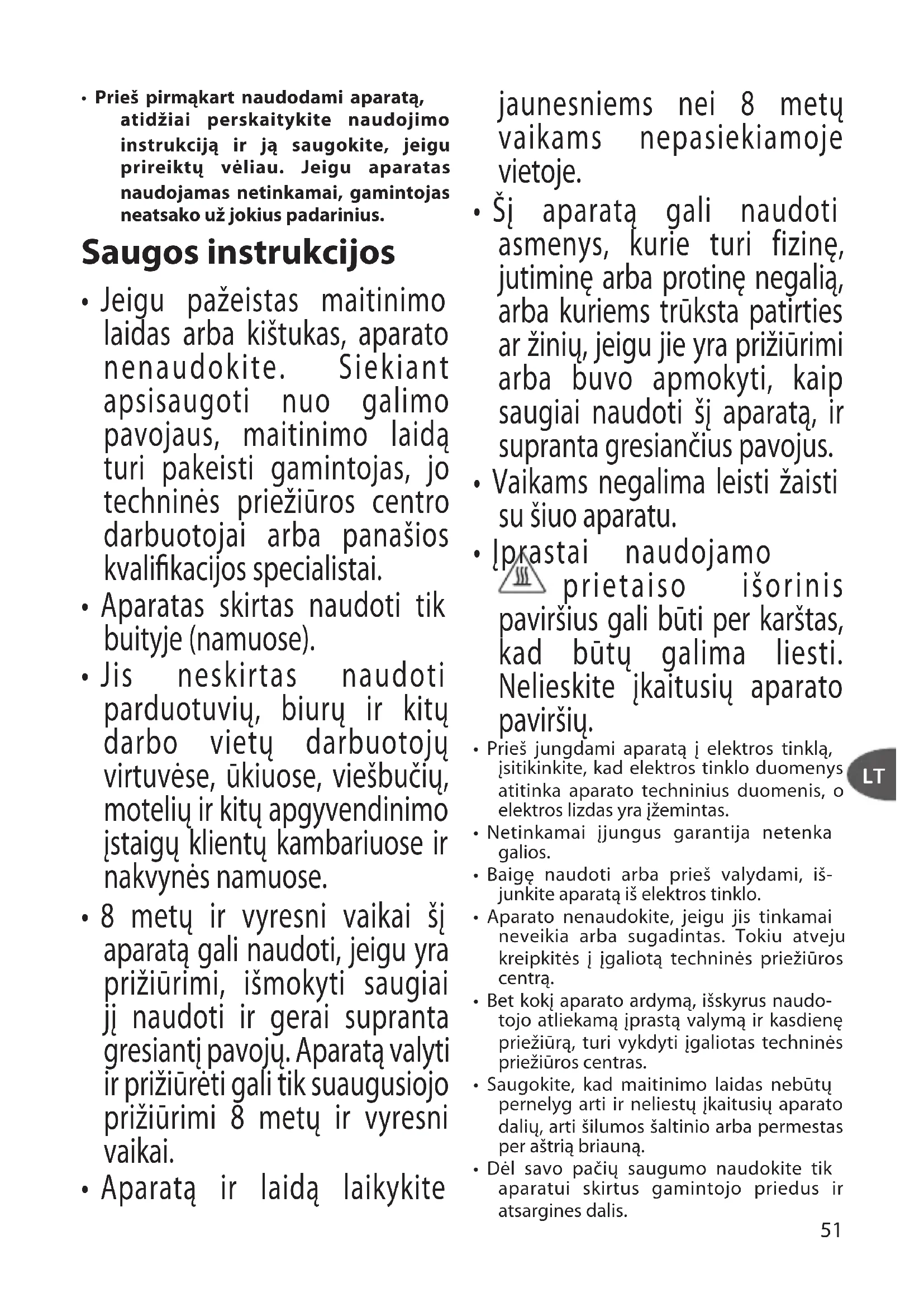 - 8 metų ir vyresni vaikai šį aparatą gali naudoti, jeigu yra prižiūrimi, išmokyti saugiai jį naudoti ir gerai supranta gresiantį pavojų. Aparatą valyti ir prižiūrėti gali tik suaugusiojo prižiūrimi 8 metų ir vyresni vaikai.