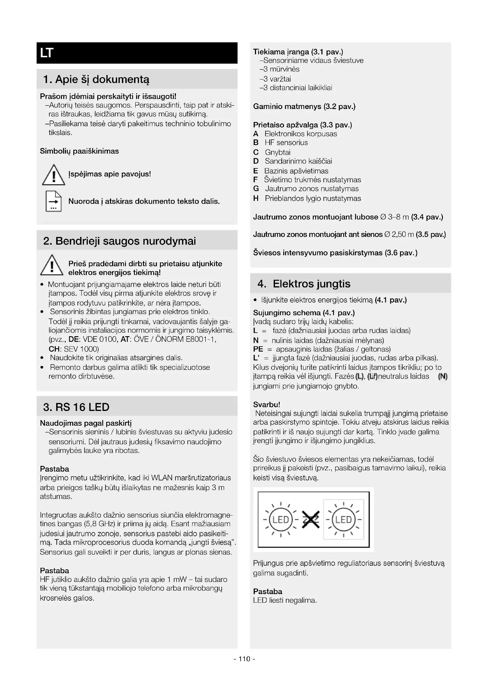 Naudojimas pagal paskirtį – Sensorinis sieninis / lubinis šviestuvas su aktyviu judesio sensoriumi. Dėl jautraus judesių fiksavimo naudojimo galimybės lauke yra ribotas. Pastaba Įrengimo metu užtikrinkite, kad iki WLAN maršrutizatoriaus arba prieigos taškų būtų išlaikytas ne mažesnis kaip 3 m atstumas. Integruotas aukšto dažnio sensorius siunčia elektromagne- tines bangas (5,8 GHz) ir priima jų aidą. Esant mažiausiam judesiui jautrumo zonoje, sensorius pastebi aido pasikeiti- mą. Tada mikroprocesorius duoda komandą „jungti šviesą”. Sensorius gali suveikti ir per duris, langus ar plonas sienas. Pastaba HF jutiklio aukšto dažnio galia yra apie 1 mW – tai sudaro tik vieną tūkstantąją mobiliojo telefono arba mikrobangų krosnelės galios.- 111 -
