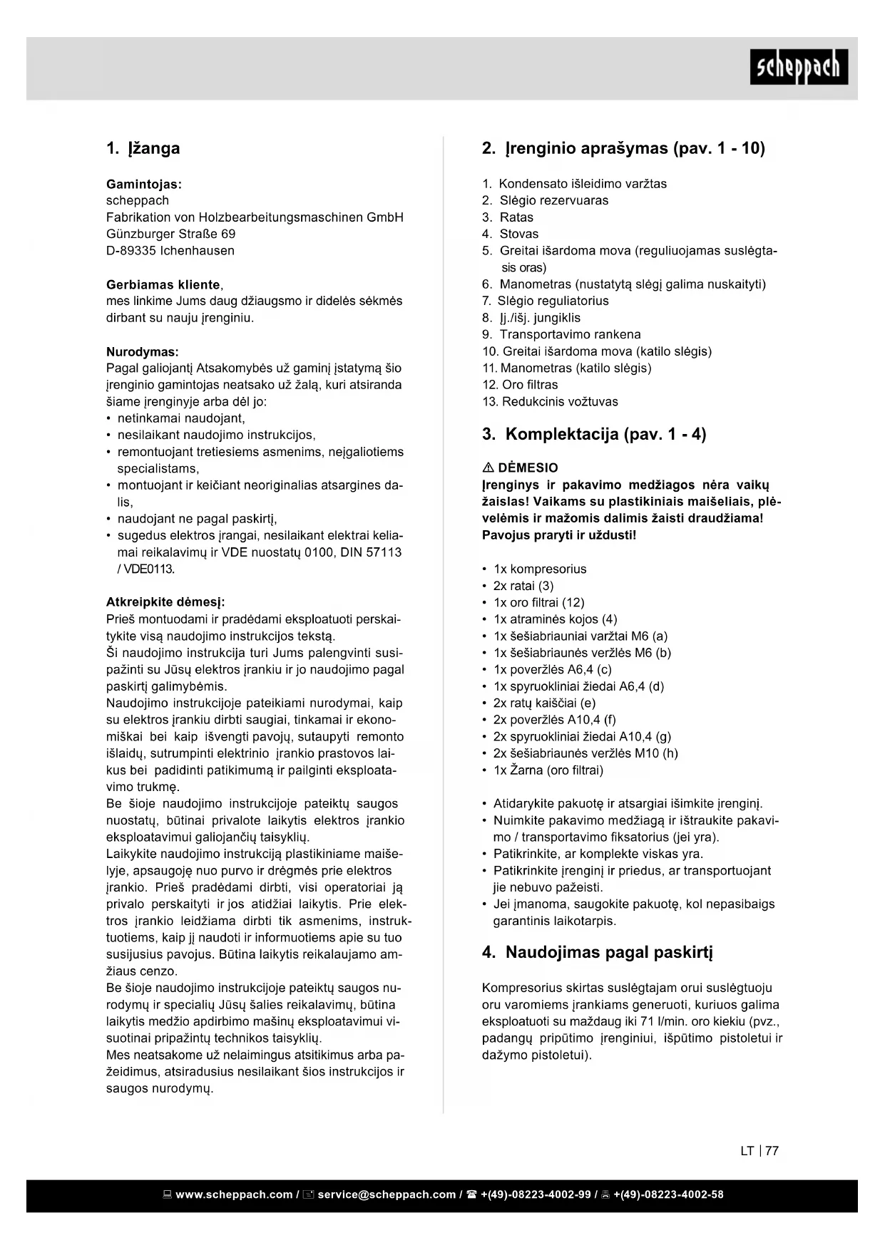 Gamintojas: scheppach Fabrikation von Holzbearbeitungsmaschinen GmbH Günzburger Straße 69 D-89335 Ichenhausen Gerbiamas kliente, mes linkime Jums daug džiaugsmo ir didelės sėkmės dirbant su nauju įrenginiu. Nurodymas: Pagal galiojantį Atsakomybės už gaminį įstatymą šio įrenginio gamintojas neatsako už žalą, kuri atsiranda šiame įrenginyje arba dėl jo: