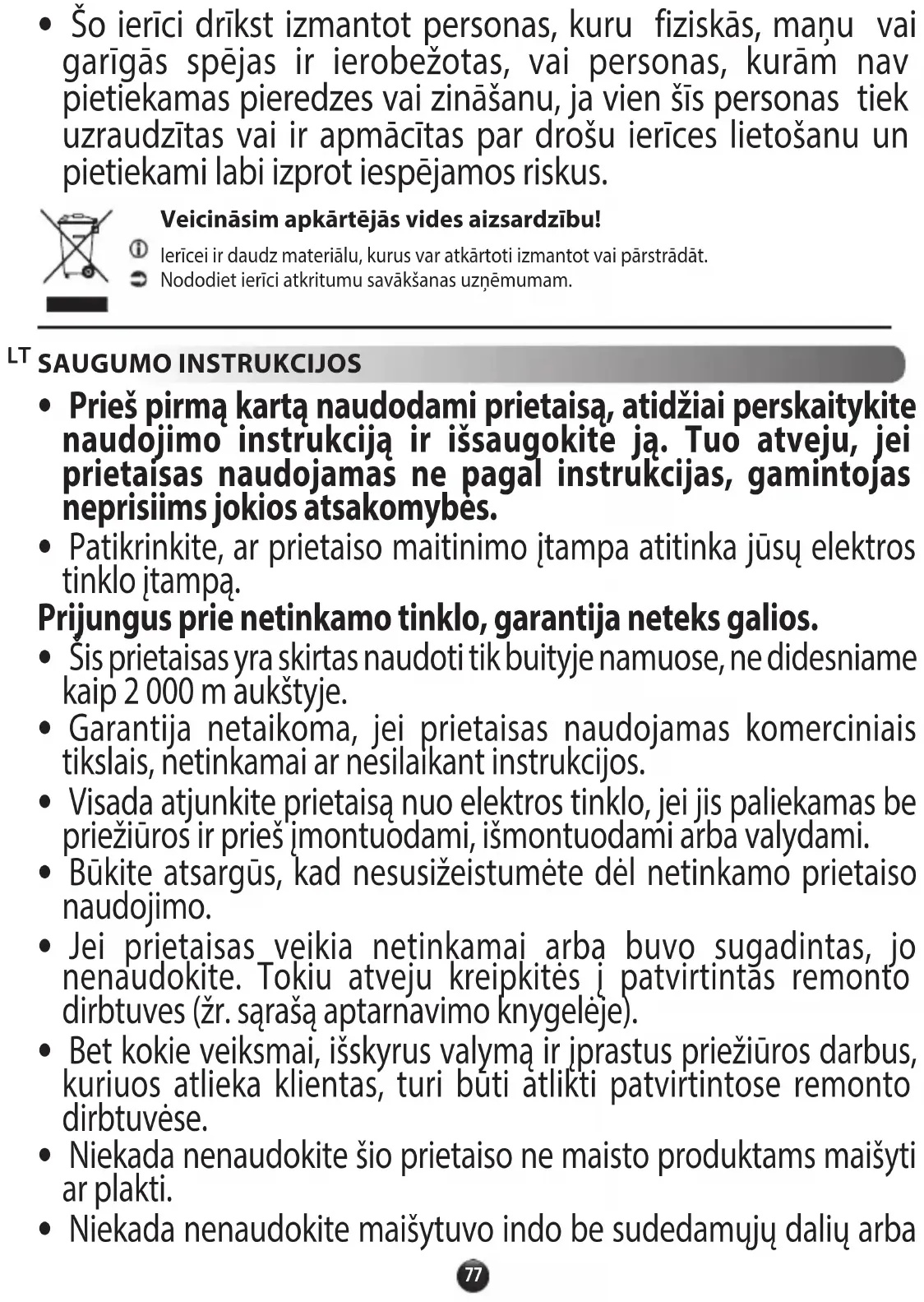 - Šį prietaisą gali naudoti asmenys, kurių fiziniai, jutiminiai ar protiniai gebėjimai sumažėję, arba asmenys, kurių patirtis ar žinios nėra pakankamos, jei juos prižiūri kitas asmuo arba jie išmokyti saugiai naudotis prietaisu ir puikiai supranta galimus pavojus. Saugokime aplinką! Šiame prietaise yra įvairių vertingų arba tinkamų perdirbti medžiagų.Pristatykite jas į surinkimo skyrių perdirbti.