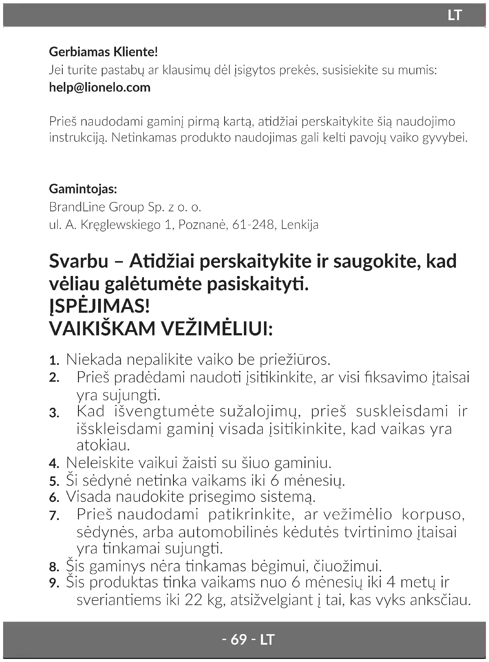 Gerbiamas Kliente! Jei turite pastabų ar klausimų dėl įsigytos prekės, susisiekite su mumis: help@lionelo.com Prieš naudodami gaminį pirmą kartą, adžiai perskaitykite šią naudojimo instrukciją. Nenkamas produkto naudojimas gali kel pavojų vaiko gyvybei. Gamintojas: BrandLine Group Sp. z o. o. ul. A. Kręglewskiego 1, Poznanė, 61-248, Lenkija Svarbu – Adžiai perskaitykite ir saugokite, kad vėliau galėtumėte pasiskaity. ĮSPĖJIMAS! VAIKIŠKAM VEŽIMĖLIUI: