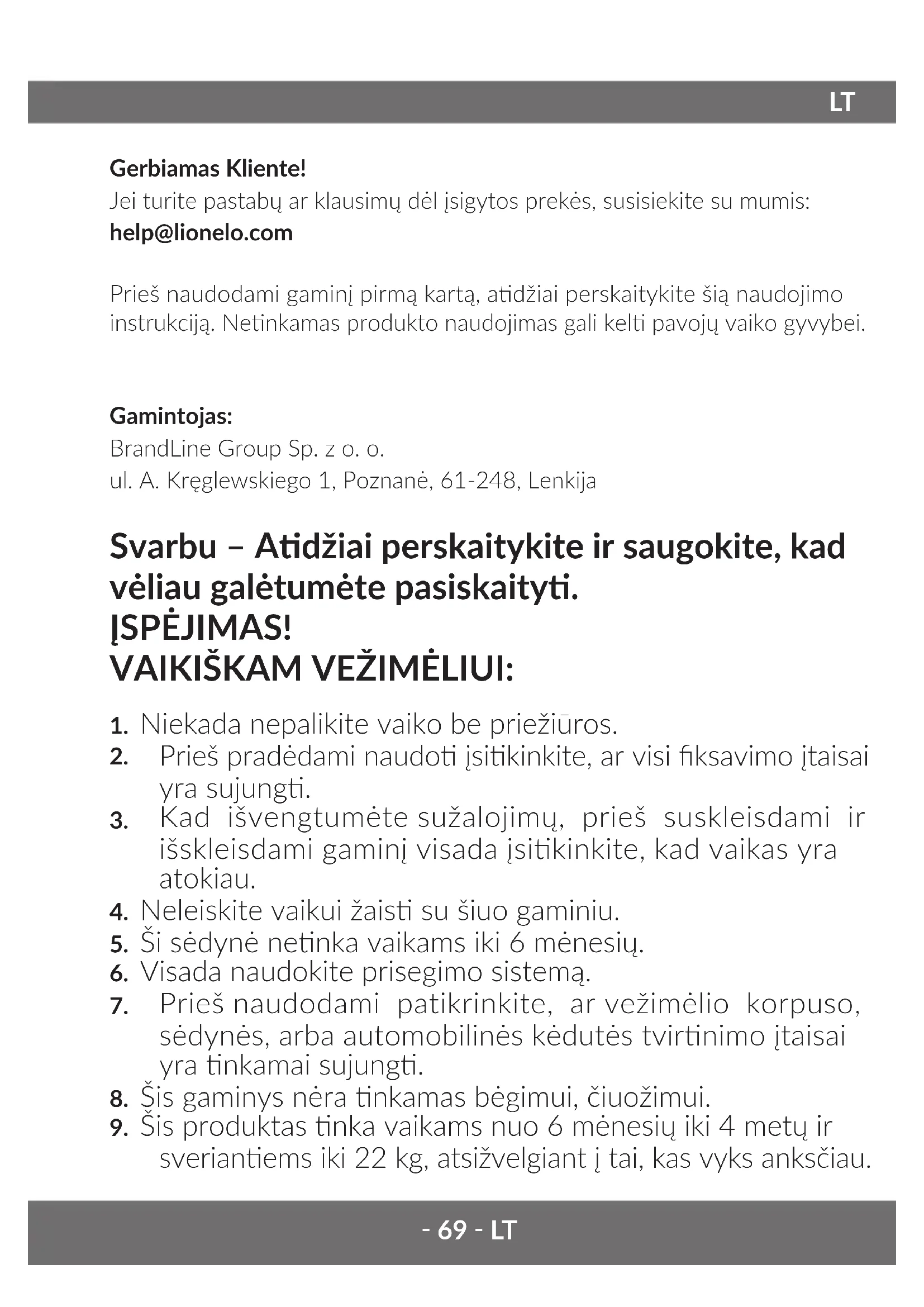 Gerbiamas Kliente! Jei turite pastabų ar klausimų dėl įsigytos prekės, susisiekite su mumis: help@lionelo.com Prieš naudodami gaminį pirmą kartą, adžiai perskaitykite šią naudojimo instrukciją. Nenkamas produkto naudojimas gali kel pavojų vaiko gyvybei. Gamintojas: BrandLine Group Sp. z o. o. ul. A. Kręglewskiego 1, Poznanė, 61-248, Lenkija Svarbu – Adžiai perskaitykite ir saugokite, kad vėliau galėtumėte pasiskaity. ĮSPĖJIMAS! VAIKIŠKAM VEŽIMĖLIUI: