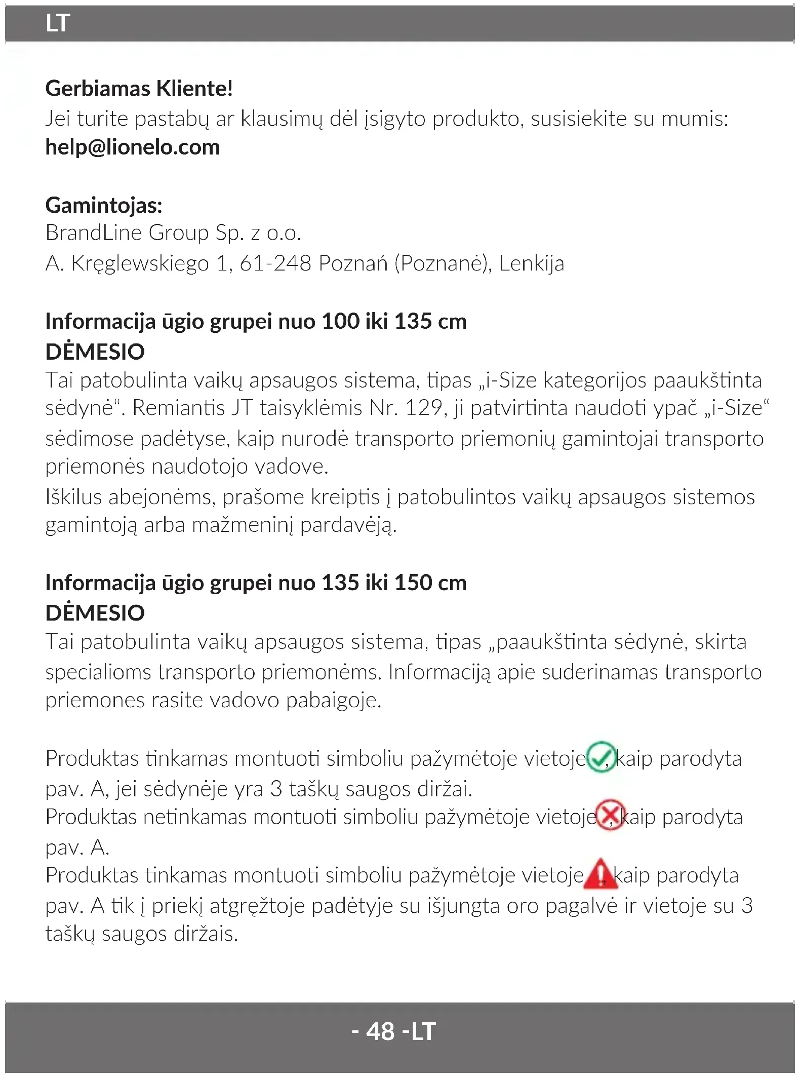 De hoes kan worden gewassen op max. 30° C. Niet in de wasdroger drogen. De hoes niet blootstellen aan zonlicht om te drogen. De kunststof onderdelen kunnen worden gereinigd met vocht doekje en een mild schoonmaakmiddel. Gebruik geen sterke schoonmaakmiddelen of bleekmiddelen. De aeeldingen dienen alleen ter illustrae, het werkelijke uiterlijk van de producten kan van het uiterlijk op de aeeldingen verschillen.‑ 48 ‑LT Gerbiamas Kliente! Jei turite pastabų ar klausimų dėl įsigyto produkto, susisiekite su mumis: help@lionelo.com Gamintojas: BrandLine Group Sp. z o.o. A. Kręglewskiego 1, 61-248 Poznań (Poznanė), Lenkija Informacija ūgio grupei nuo 100 iki 135 cm DĖMESIO Tai patobulinta vaikų apsaugos sistema, pas „i-Size kategorijos paaukšnta sėdynė“. Remians JT taisyklėmis Nr. 129, ji patvirnta naudo ypač „i-Size“ sėdimose padėtyse, kaip nurodė transporto priemonių gamintojai transporto priemonės naudotojo vadove. Iškilus abejonėms, prašome kreips į patobulintos vaikų apsaugos sistemos gamintoją arba mažmeninį pardavėją. Informacija ūgio grupei nuo 135 iki 150 cm DĖMESIO Tai patobulinta vaikų apsaugos sistema, pas „paaukšnta sėdynė, skirta specialioms transporto priemonėms. Informaciją apie suderinamas transporto priemones rasite vadovo pabaigoje. Produktas nkamas montuo simboliu pažymėtoje vietoje , kaip parodyta pav. A, jei sėdynėje yra 3 taškų saugos diržai. Produktas nenkamas montuo simboliu pažymėtoje vietoje , kaip parodyta pav. A. Produktas nkamas montuo simboliu pažymėtoje vietoje , kaip parodyta pav. A k į priekį atgręžtoje padėtyje su išjungta oro pagalvė ir vietoje su 3 taškų saugos diržais. LT‑ 49 ‑ LT ĮSPĖJIMAI