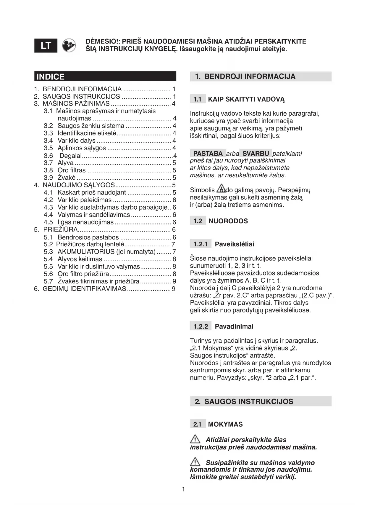 Atidžiai perskaitykite šias instrukcijas prieš naudodamiesi mašina. Susipažinkite su mašinos valdymo komandomis ir tinkamu jos naudojimu. Išmokite greitai sustabdyti variklį. DĖMESIO!: PRIEŠ NAUDODAMIESI MAŠINA ATIDŽIAI PERSKAITYKITE ŠIĄ INSTRUKCIJŲ KNYGELĘ. Išsaugokite ją naudojimui ateityje.