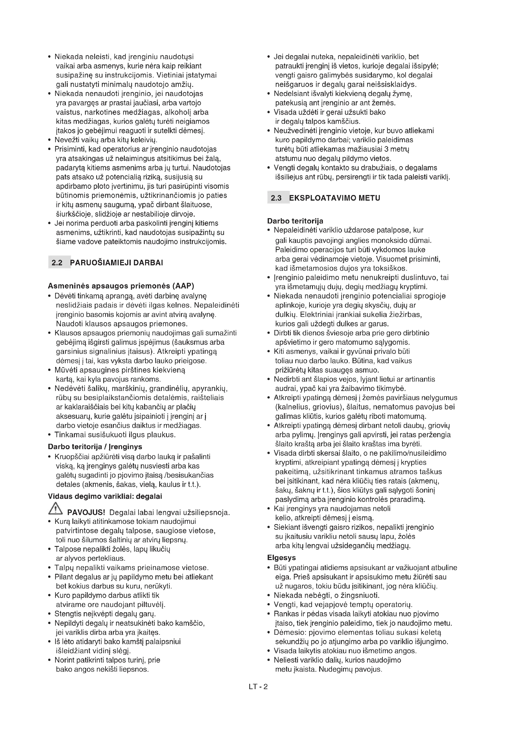 - Neliesti variklio dalių, kurios naudojimo metu įkaista. Nudegimų pavojus.LT - 3 Gedimų arba nelaimingų atsitikimų darbo metu atveju, nedelsiant išjungti variklį ir patraukti įrenginį taip, kad nebūtų padaryta dar didesnė žala; nelaimingų atsitikimų, susijusių su asmens ar trečiosios šalies sužalojimais atveju, nedelsiant imtis tinkamiausių pirmosios pagalbos veiksmų bei kreiptis į sveikatos priežiūros įstaigą tolesniam gydymui. Kruopščiai pašalinti galimas sankaupas, kurios galėtų padaryti žalos arba sužaloti asmenis ar be priežiūros paliktus gyvūnus. Naudojimo apribojimai
