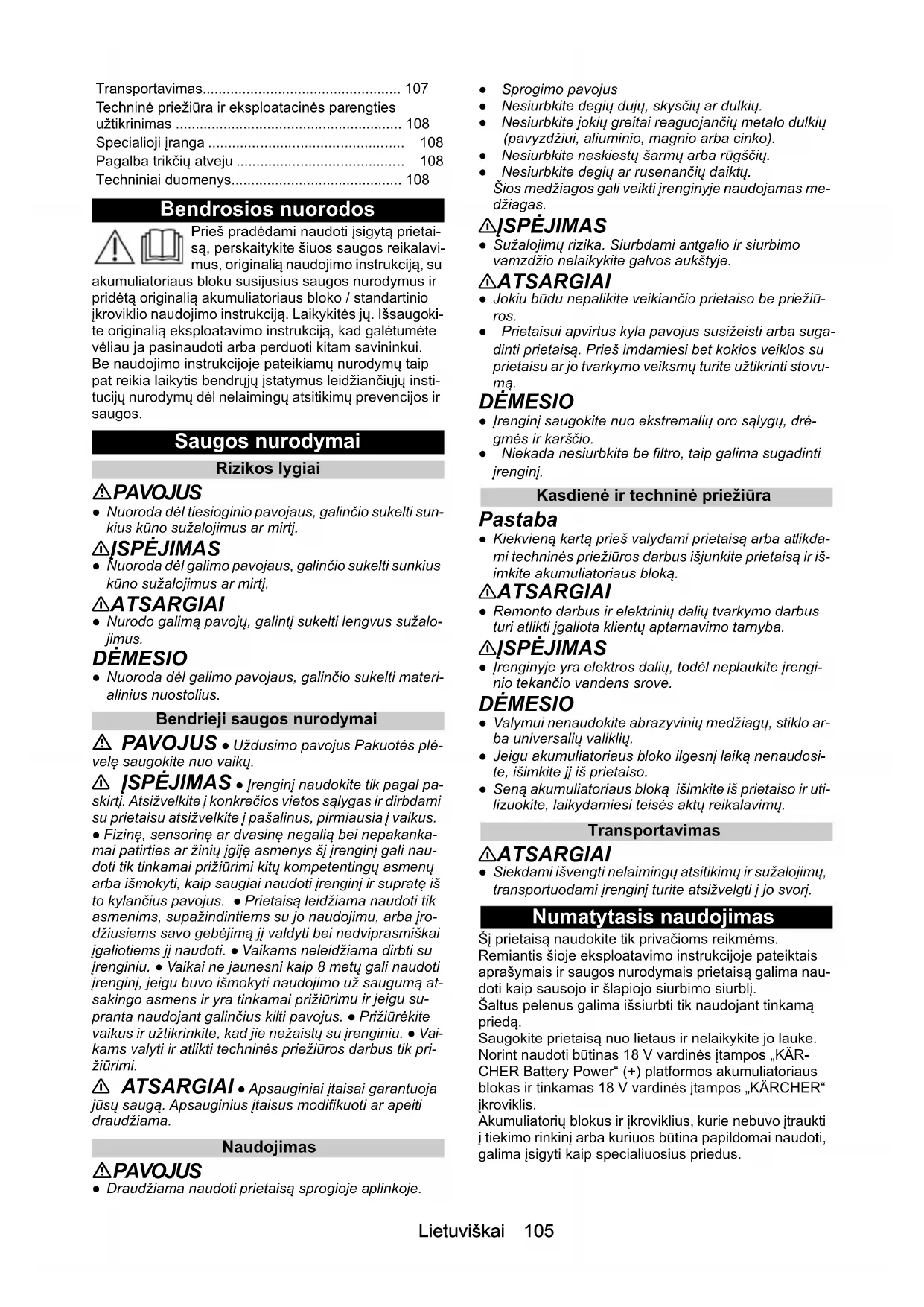 - Lietuviškai 105 Bendrosios nuorodos Prieš pradėdami naudoti įsigytą prietai- są, perskaitykite šiuos saugos reikalavi- mus, originalią naudojimo instrukciją, su akumuliatoriaus bloku susijusius saugos nurodymus ir pridėtą originalią akumuliatoriaus bloko / standartinio įkroviklio naudojimo instrukciją. Laikykitės jų. Išsaugoki- te originalią eksploatavimo instrukciją, kad galėtumėte vėliau ja pasinaudoti arba perduoti kitam savininkui. Be naudojimo instrukcijoje pateikiamų nurodymų taip pat reikia laikytis bendrųjų įstatymus leidžiančiųjų insti- tucijų nurodymų dėl nelaimingų atsitikimų prevencijos ir saugos. Saugos nurodymai Rizikos lygiai PAVOJUS ● Nuoroda dėl tiesioginio pavojaus, galinčio sukelti sun- kius kūno sužalojimus ar mirtį. 몇 ĮSPĖJIMAS ● Nuoroda dėl galimo pavojaus, galinčio sukelti sunkius kūno sužalojimus ar mirtį. 몇 ATSARGIAI ● Nurodo galimą pavojų, galintį sukelti lengvus sužalo- jimus. DĖMESIO ● Nuoroda dėl galimo pavojaus, galinčio sukelti materi- alinius nuostolius. Bendrieji saugos nurodymai PAVOJUS ● Uždusimo pavojus Pakuotės plė- velę saugokite nuo vaikų. 몇 ĮSPĖJIMAS ● Įrenginį naudokite tik pagal pa- skirtį. Atsižvelkite į konkrečios vietos sąlygas ir dirbdami su prietaisu atsižvelkite į pašalinus, pirmiausia į vaikus. ● Fizinę, sensorinę ar dvasinę negalią bei nepakanka- mai patirties ar žinių įgiję asmenys šį įrenginį gali nau- doti tik tinkamai prižiūrimi kitų kompetentingų asmenų arba išmokyti, kaip saugiai naudoti įrenginį ir supratę iš to kylančius pavojus. ● Prietaisą leidžiama naudoti tik asmenims, supažindintiems su jo naudojimu, arba įro- džiusiems savo gebėjimą jį valdyti bei nedviprasmiškai įgaliotiems jį naudoti. ● Vaikams neleidžiama dirbti su įrenginiu. ● Vaikai ne jaunesni kaip 8 metų gali naudoti įrenginį, jeigu buvo išmokyti naudojimo už saugumą at- sakingo asmens ir yra tinkamai prižiū rimu ir jeigu su- pranta naudojant galinčius kilti pavojus. ● Prižiūrėkite vaikus ir užtikrinkite, kad jie nežaistų su įrenginiu. ● Vai- kams valyti ir atlikti techninės priežiūros darbus tik pri- žiūrimi. 몇 ATSARGIAI ● Apsauginiai įtaisai garantuoja jūsų saugą. Apsauginius įtaisus modifikuoti ar apeiti draudžiama. Naudojimas PAVOJUS ● Draudžiama naudoti prietaisą sprogioje aplinkoje. ● Sprogimo pavojus ● Nesiurbkite degių dujų, skysčių ar dulkių. ● Nesiurbkite jokių greitai reaguojančių metalo dulkių (pavyzdžiui, aliuminio, magnio arba cinko). ● Nesiurbkite neskiestų šarmų arba rūgščių. ● Nesiurbkite degių ar rusenančių daiktų. Šios medžiagos gali veikti įrenginyje naudojamas me- džiagas. 몇 ĮSPĖJIMAS ● Sužalojimų rizika. Siurbdami antgalio ir siurbimo vamzdžio nelaikykite galvos aukštyje. 몇 ATSARGIAI ● Jokiu būdu nepalikite veikiančio prietaiso be priežiū- ros. ● Prietaisui apvirtus kyla pavojus susižeisti arba suga- dinti prietaisą. Prieš imdamiesi bet kokios veiklos su prietaisu ar jo tvarkymo veiksmų turite užtikrinti stovu- mą. DĖMESIO ● Įrenginį saugokite nuo ekstremalių oro sąlygų, drė- gmės ir karščio. ● Niekada nesiurbkite be filtro, taip galima sugadinti įrenginį. Kasdienė ir techninė priežiūra Pastaba ● Kiekvieną kartą prieš valydami prietaisą arba atlikda- mi techninės priežiūros darbus išjunkite prietaisą ir iš- imkite akumuliatoriaus bloką. 몇 ATSARGIAI ● Remonto darbus ir elektrinių dalių tvarkymo darbus turi atlikti įgaliota klientų aptarnavimo tarnyba. 몇 ĮSPĖJIMAS ● Įrenginyje yra elektros dalių, todėl neplaukite įrengi- nio tekančio vandens srove. DĖMESIO ● Valymui nenaudokite abrazyvinių medžiagų, stiklo ar- ba universalių valiklių. ● Jeigu akumuliatoriaus bloko ilgesnį laiką nenaudosi- te, išimkite jį iš prietaiso. ● Seną akumuliatoriaus bloką išimkite iš prietaiso ir uti- lizuokite, laikydamiesi teisės aktų reikalavimų. Transportavimas 몇 ATSARGIAI ● Siekdami išvengti nelaimingų atsitikimų ir sužalojimų, transportuodami įrenginį turite atsižvelgti į jo svorį. Numatytasis naudojimas Šį prietaisą naudokite tik privačioms reikmėms. Remiantis šioje eksploatavimo instrukcijoje pateiktais aprašymais ir saugos nurodymais prietaisą galima nau- doti kaip sausojo ir šlapiojo siurbimo siurblį. Šaltus pelenus galima išsiurbti tik naudojant tinkamą priedą. Saugokite prietaisą nuo lietaus ir nelaikykite jo lauke. Norint naudoti būtinas 18 V vardinės įtampos „KÄR- CHER Battery Power“ (+) platformos akumuliatoriaus blokas ir tinkamas 18 V vardinės įtampos „KÄRCHER“ įkroviklis. Akumuliatorių blokus ir įkroviklius, kurie nebuvo įtraukti į tiekimo rinkinį arba kuriuos būtina papildomai naudoti, galima įsigyti kaip specialiuosius priedus. Transportavimas p. 107
