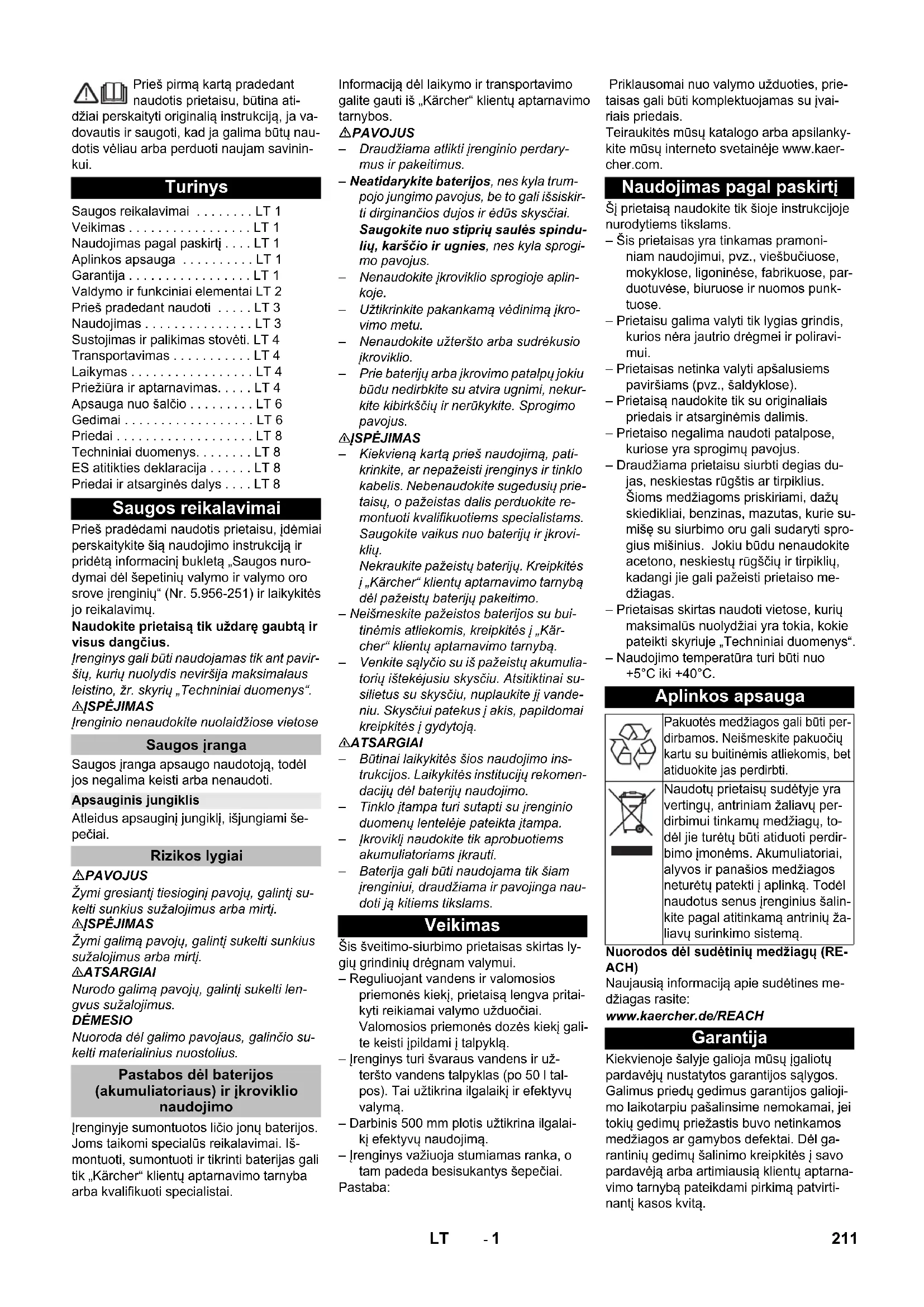 Chairman of the Board of Management Director Regulatory Affairs & Certification Piederumi un rezerves daļas 210 LV- 1 Prieš pirmą kartą pradedant naudotis prietaisu, būtina ati- džiai perskaityti originalią instrukciją, ja va- dovautis ir saugoti, kad ja galima būtų nau- dotis vėliau arba perduoti naujam savinin- kui. Prieš pradėdami naudotis prietaisu, įdėmiai perskaitykite šią naudojimo instrukciją ir pridėtą informacinį bukletą „Saugos nuro- dymai dėl šepetinių valymo ir valymo oro srove įrenginių“ (Nr. 5.956-251) ir laikykitės jo reikalavimų. Naudokite prietaisą tik uždarę gaubtą ir visus dangčius. Įrenginys gali būti naudojamas tik ant pavir- šių, kurių nuolydis neviršija maksimalaus leistino, žr. skyrių „Techniniai duomenys“. 몇 ĮSPĖJIMAS Įrenginio nenaudokite nuolaidžiose vietose Saugos įranga apsaugo naudotoją, todėl jos negalima keisti arba nenaudoti. Atleidus apsauginį jungiklį, išjungiami še- pečiai. PAVOJUS Žymi gresiantį tiesioginį pavojų, galintį su- kelti sunkius sužalojimus arba mirtį. 몇 ĮSPĖJIMAS Žymi galimą pavojų, galintį sukelti sunkius sužalojimus arba mirtį. 몇 ATSARGIAI Nurodo galimą pavojų, galintį sukelti len- gvus sužalojimus. DĖMESIO Nuoroda dėl galimo pavojaus, galinčio su- kelti materialinius nuostolius. Įrenginyje sumontuotos ličio jonų baterijos. Joms taikomi specialūs reikalavimai. Iš- montuoti, sumontuoti ir tikrinti baterijas gali tik „Kärcher“ klientų aptarnavimo tarnyba arba kvalifikuoti specialistai. Informaciją dėl laikymo ir transportavimo galite gauti iš „Kärcher“ klientų aptarnavimo tarnybos. PAVOJUS – Draudžiama atlikti įrenginio perdary- mus ir pakeitimus. – Neatidarykite baterijos, nes kyla trum- pojo jungimo pavojus, be to gali išsiskir- ti dirginančios dujos ir ėdūs skysčiai. Saugokite nuo stiprių saulės spindu- lių, karščio ir ugnies, nes kyla sprogi- mo pavojus. – Nenaudokite įkroviklio sprogioje aplin- koje. – Užtikrinkite pakankamą vėdinimą įkro- vimo metu. – Nenaudokite užteršto arba sudrėkusio įkroviklio. – Prie baterijų arba įkrovimo patalpų jokiu būdu nedirbkite su atvira ugnimi, nekur- kite kibirkščių ir nerūkykite. Sprogimo pavojus. 몇 ĮSPĖJIMAS – Kiekvieną kartą prieš naudojimą, pati- krinkite, ar nepažeisti įrenginys ir tinklo kabelis. Nebenaudokite sugedusių prie- taisų, o pažeistas dalis perduokite re- montuoti kvalifikuotiems specialistams. Saugokite vaikus nuo baterijų ir įkrovi- klių. Nekraukite pažeistų baterijų. Kreipkit