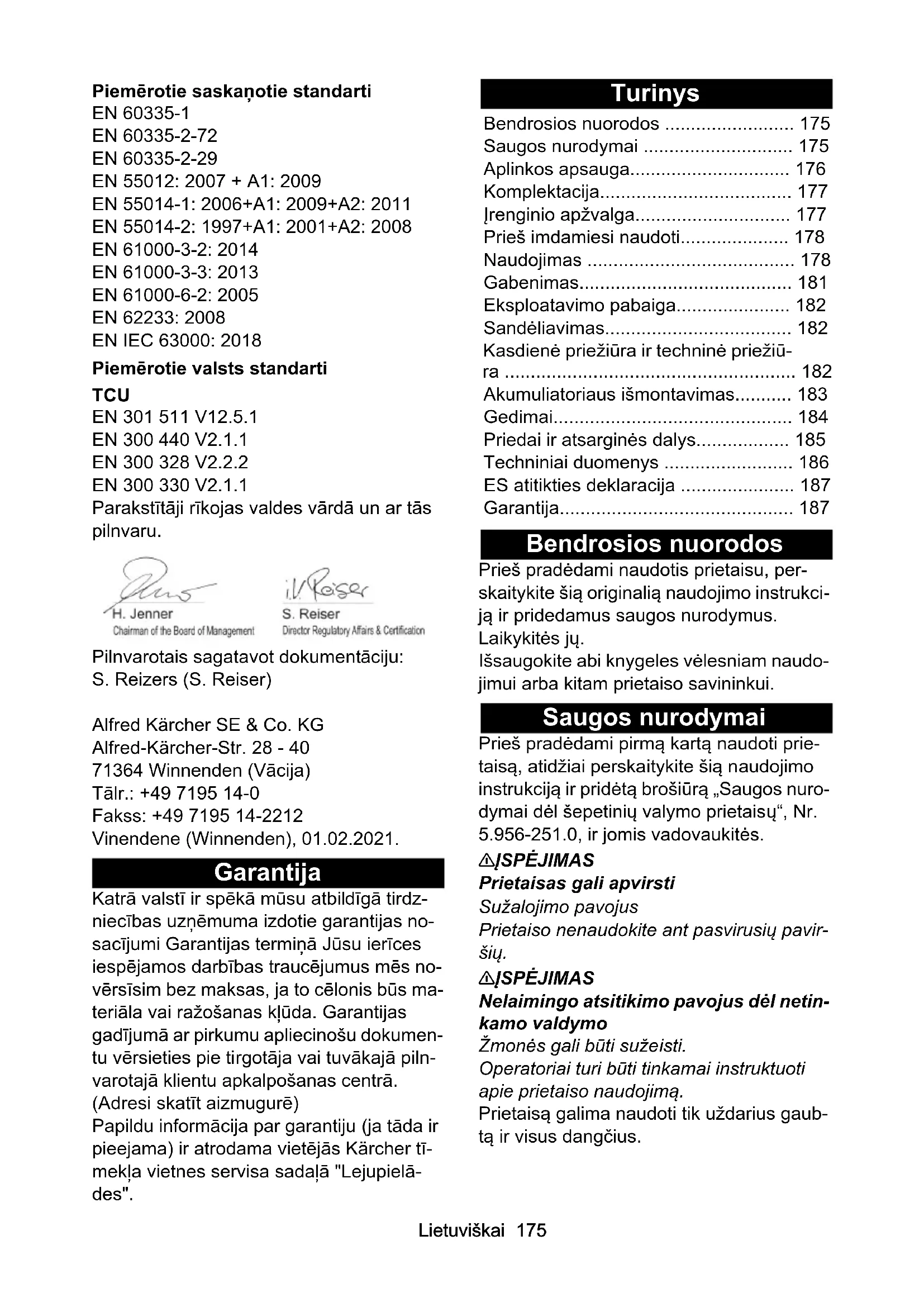 - dB(A) 85Lietuviškai 175 Piemērotie saskaņotie standarti EN 60335-1 EN 60335-2-72 EN 60335-2-29 EN 55012: 2007 + A1: 2009 EN 55014-1: 2006+A1: 2009+A2: 2011 EN 55014-2: 1997+A1: 2001+A2: 2008 EN 61000-3-2: 2014 EN 61000-3-3: 2013 EN 61000-6-2: 2005 EN 62233: 2008 EN IEC 63000: 2018 Piemērotie valsts standarti TCU EN 301 511 V12.5.1 EN 300 440 V2.1.1 EN 300 328 V2.2.2 EN 300 330 V2.1.1 Parakstītāji rīkojas valdes vārdā un ar tās pilnvaru. Pilnvarotais sagatavot dokumentāciju: S. Reizers (S. Reiser) Alfred Kärcher SE & Co. KG Alfred-Kärcher-Str. 28 - 40 71364 Winnenden (Vācija) Tālr.: +49 7195 14-0 Fakss: +49 7195 14-2212 Vinendene (Winnenden), 01.02.2021. Garantija Katrā valstī ir spēkā mūsu atbildīgā tirdz- niecības uzņēmuma izdotie garantijas no- sacījumi Garantijas termiņā Jūsu ierīces iespējamos darbības traucējumus mēs no- vērsīsim bez maksas, ja to cēlonis būs ma- teriāla vai ražošanas kļūda. Garantijas gadījumā ar pirkumu apliecinošu dokumen- tu vērsieties pie tirgotāja vai tuvākajā piln- varotajā klientu apkalpošanas centrā. (Adresi skatīt aizmugurē) Papildu informācija par garantiju (ja tāda ir pieejama) ir atrodama vietējās Kärcher tī- mekļa vietnes servisa sadaļā "Lejupielā- des". Turinys Bendrosios nuorodos Prieš pradėdami naudotis prietaisu, per- skaitykite šią originalią naudojimo instrukci- ją ir pridedamus saugos nurodymus. Laikykitės jų. Išsaugokite abi knygeles vėlesniam naudo- jimui arba kitam prietaiso savininkui. Saugos nurodymai Prieš pradėdami pirmą kartą naudoti prie- taisą, atidžiai perskaitykite šią naudojimo instrukciją ir pridėtą brošiūrą „Saugos nuro- dymai dėl šepetinių valymo prietaisų“, Nr. 5.956-251.0, ir jomis vadovaukitės. 몇 ĮSPĖJIMAS Prietaisas gali apvirsti Sužalojimo pavojus Prietaiso nenaudokite ant pasvirusių pavir- šių. 몇 ĮSPĖJIMAS Nelaimingo atsitikimo pavojus dėl netin- kamo valdymo Žmonės gali būti sužeisti. Operatoriai turi būti tinkamai instruktuoti apie prietaiso naudojimą. Prietaisą galima naudoti tik uždarius gaub- tą ir visus dangčius. Bendrosios nuorodos p. 175