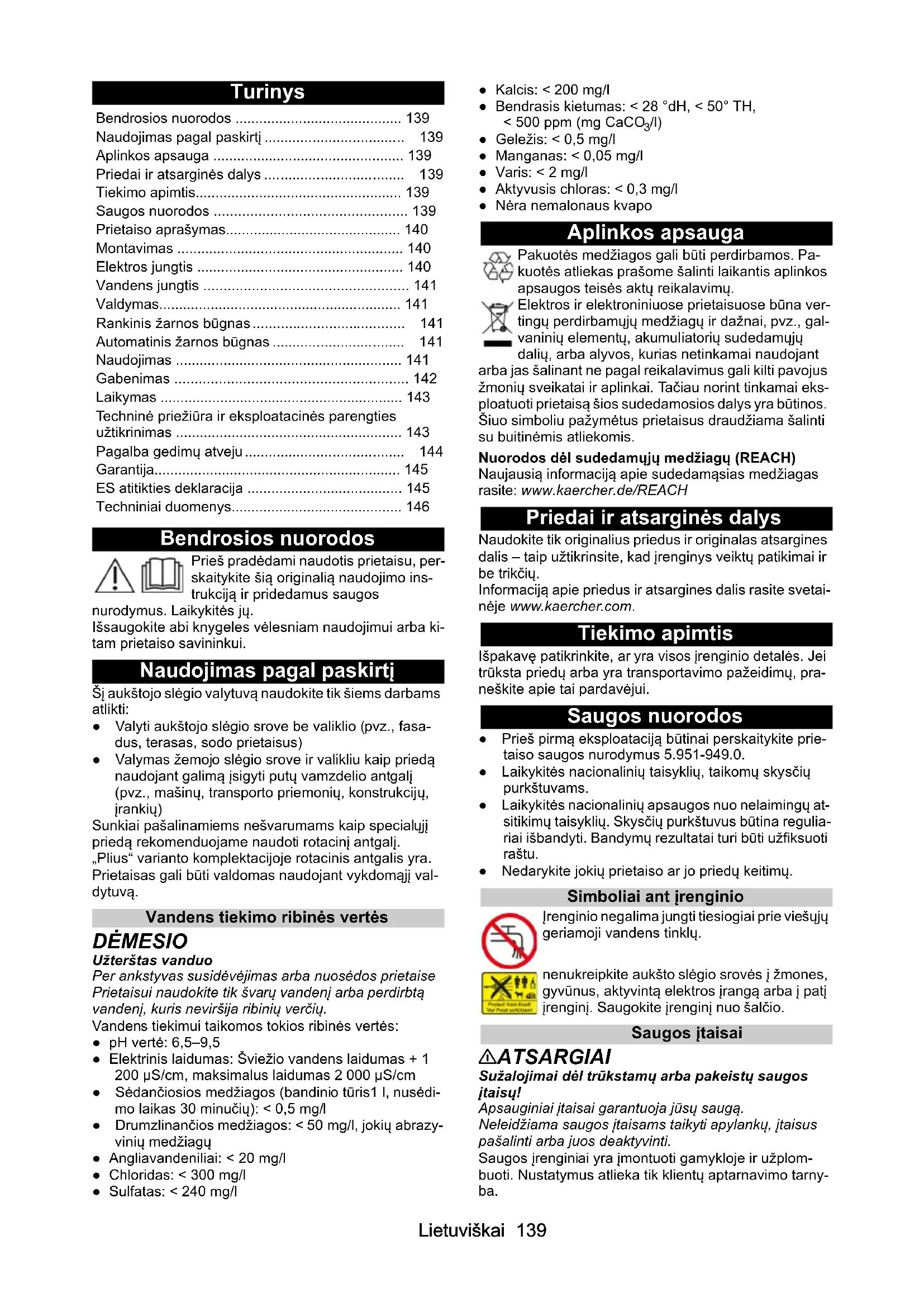 - /l) ● Geležis: < 0,5 mg/l ● Manganas: < 0,05 mg/l ● Varis: < 2 mg/l ● Aktyvusis chloras: < 0,3 mg/l ● Nėra nemalonaus kvapo Aplinkos apsauga Pakuotės medžiagos gali būti perdirbamos. Pa- kuotės atliekas prašome šalinti laikantis aplinkos apsaugos teisės aktų reikalavimų. Elektros ir elektroniniuose prietaisuose būna ver- tingų perdirbamųjų medžiagų ir dažnai, pvz., gal- vaninių elementų, akumuliatorių sudedamųjų dalių, arba alyvos, kurias netinkamai naudojant arba jas šalinant ne pagal reikalavimus gali kilti pavojus žmonių sveikatai ir aplinkai. Tačiau norint tinkamai eks- ploatuoti prietaisą šios sudedamosios dalys yra būtinos. Šiuo simboliu pažymėtus prietaisus draudžiama šalinti su buitinėmis atliekomis. Nuorodos dėl sudedamųjų medžiagų (REACH) Naujausią informaciją apie sudedamąsias medžiagas rasite: www.kaercher.de/REACH Priedai ir atsarginės dalys Naudokite tik originalius priedus ir originalas atsargines dalis – taip užtikrinsite, kad įrenginys veiktų patikimai ir be trikčių. Informaciją apie priedus ir atsargines dalis rasite svetai- nėje www.kaercher.com. Tiekimo apimtis Išpakavę patikrinkite, ar yra visos įrenginio detalės. Jei trūksta priedų arba yra transportavimo pažeidimų, pra- neškite apie tai pardavėjui. Saugos nuorodos ● Prieš pirmą eksploataciją būtinai perskaitykite prie- taiso saugos nurodymus 5.951-949.0. ● Laikykitės nacionalinių taisyklių, taikomų skysčių purkštuvams. ● Laikykitės nacionalinių apsaugos nuo nelaimingų at- sitikimų taisyklių. Skysčių purkštuvus būtina regulia- riai išbandyti. Bandymų rezultatai turi būti užfiksuoti raštu. ● Nedarykite jokių prietaiso ar jo priedų keitimų. Simboliai ant įrenginio Įrenginio negalima jungti tiesiogiai prie viešųjų geriamoji vandens tinklų. nenukreipkite aukšto slėgio srovės į žmones, gyvūnus, aktyvintą elektros įrangą arba į patį įrenginį. Saugokite įrenginį nuo šalčio. Saugos įtaisai 몇 ATSARGIAI Sužalojimai dėl trūkstamų arba pakeistų saugos įtaisų! Apsauginiai įtaisai garantuoja jūsų saugą. Neleidžiama saugos įtaisams taikyti apylankų, įtaisus pašalinti arba juos deaktyvinti. Saugos įrenginiai yra įmontuoti gamykloje ir užplom- buoti. Nustatymus atlieka tik klientų aptarnavimo tarny- ba. Bendrosios nuorodos p. 139