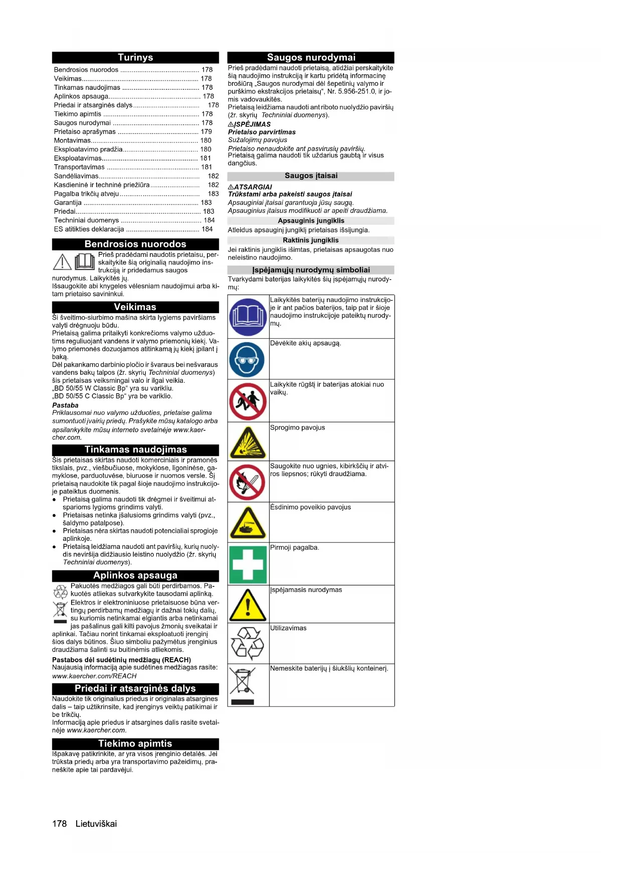 - dB(A) 84,1 84,1 BD 50/55 W Classic Bp BD 50/55 C Classic Bp Chairman of the Board of Management Director Regulatory Affairs & Certification H. Jenner S. Reiser178 Lietuviškai Turinys Bendrosios nuorodos Prieš pradėdami naudotis prietaisu, per- skaitykite šią originalią naudojimo ins- trukciją ir pridedamus saugos nurodymus. Laikykitės jų. Išsaugokite abi knygeles vėlesniam naudojimui arba ki- tam prietaiso savininkui. Veikimas Ši šveitimo-siurbimo mašina skirta lygiems paviršiams valyti drėgnuoju būdu. Prietaisą galima pritaikyti konkrečioms valymo užduo- tims reguliuojant vandens ir valymo priemonių kiekį. Va- lymo priemonės dozuojamos atitinkamą jų kiekį įpilant į baką. Dėl pakankamo darbinio pločio ir švaraus bei nešvaraus vandens bakų talpos (žr. skyrių Techniniai duomenys) šis prietaisas veiksmingai valo ir ilgai veikia. „BD 50/55 W Classic Bp“ yra su varikliu. „BD 50/55 C Classic Bp“ yra be variklio. Pastaba Priklausomai nuo valymo užduoties, prietaise galima sumontuoti įvairių priedų. Prašykite mūsų katalogo arba apsilankykite mūsų interneto svetainėje www.kaer- cher.com. Tinkamas naudojimas Šis prietaisas skirtas naudoti komerciniais ir pramonės tikslais, pvz., viešbučiuose, mokyklose, ligoninėse, ga- myklose, parduotuvėse, biuruose ir nuomos versle. Šį prietaisą naudokite tik pagal šioje naudojimo instrukcijo- je pateiktus duomenis. ● Prietaisą galima naudoti tik drėgmei ir šveitimui at- sparioms lygioms grindims valyti. ● Prietaisas netinka įšalusioms grindims valyti (pvz., šaldymo patalpose). ● Prietaisas nėra skirtas naudoti potencialiai sprogioje aplinkoje. ● Prietaisą leidžiama naudoti ant paviršių, kurių nuoly- dis neviršija didžiausio leistino nuolydžio (žr. skyrių Techniniai duomenys). Aplinkos apsauga Pakuotės medžiagos gali būti perdirbamos. Pa- kuotės atliekas sutvarkykite tausodami aplinką. Elektros ir elektroniniuose prietaisuose būna ver- tingų perdirbamų medžiagų ir dažnai tokių dalių, su kuriomis netinkamai elgiantis arba netinkamai jas pašalinus gali kilti pavojus žmonių sveikatai ir aplinkai. Tačiau norint tinkamai eksploatuoti įrenginį šios dalys būtinos. Šiuo simboliu pažymėtus įrenginius draudžiama šalinti su buitinėmis atliekomis. Pastabos dėl sudėtinių medžiagų (REACH) Naujausią informaciją apie sudėtines medžiagas rasite: www.kaercher.com/REACH Priedai ir atsarginės dalys Naudokite tik originalius priedus ir originalas atsargines dalis – taip užtikrinsite, kad įrenginys veiktų patikimai ir be trikčių. Informaciją apie priedus ir atsargines dalis rasite svetai- nėje www.kaercher.com. Tiekimo apimtis Išpakavę patikrinkite, ar yra visos įrenginio detalės. Jei trūksta priedų arba yra transportavimo pažeidimų, pra- neškite apie tai pardavėjui. Saugos nurodymai Prieš pradėdami naudoti prietaisą, atidžiai perskaitykite šią naudojimo instrukciją ir kartu pridėtą informacinę brošiūrą „Saugos nurodymai dėl šepetinių valymo ir purškimo ekstrakcijos prietaisų“, Nr. 5.956-251.0, ir jo- mis vadovaukitės. Prietaisą leidžiama naudoti ant riboto nuolydžio paviršių (žr. skyrių Techniniai duomenys). 몇 ĮSPĖJIMAS Prietaiso parvirtimas Sužalojimų pavojus Prietaiso nenaudokite ant pasvirusių paviršių. Prietaisą galima naudoti tik uždarius gaubtą ir visus dangčius. Saugos įtaisai 몇 ATSARGIAI Trūkstami arba pakeisti saugos įtaisai Apsauginiai įtaisai garantuoja jūsų saugą. Apsauginius įtaisus modifikuoti ar apeiti draudžiama. Apsauginis jungiklis Atleidus apsauginį jungiklį prietaisas išsijungia. Raktinis jungiklis Jei raktinis jungiklis išimtas, prietaisas apsaugotas nuo neleistino naudojimo. Įspėjamųjų nurodymų simboliai Tvarkydami baterijas laikykitės šių įspėjamųjų nurody- mų: Bendrosios nuorodos p. 178