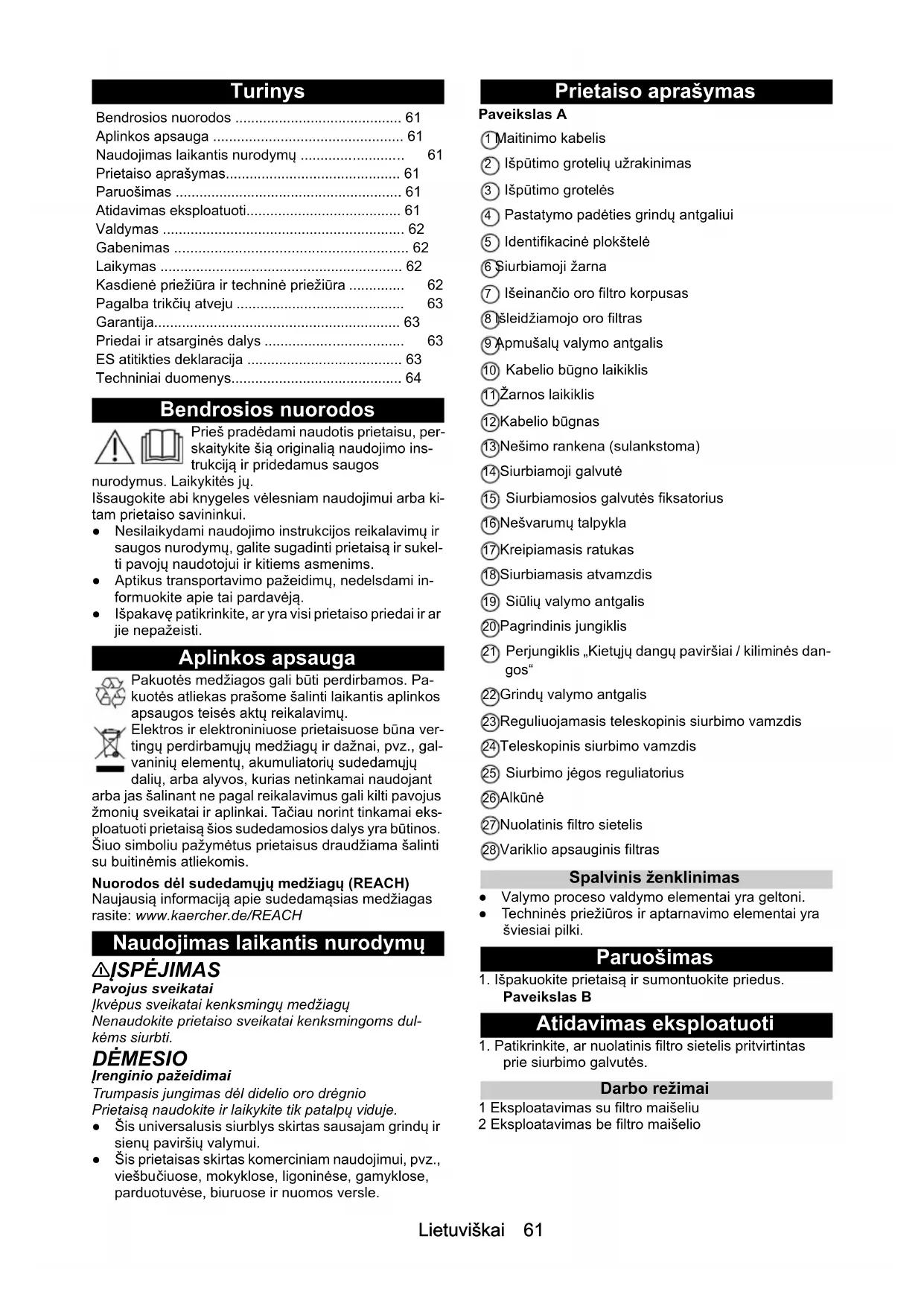 H05VV 2x1,0 GF H05VV 2x1,0 GF Daļas numurs (EU) 6.650-915.0 6.650-915.0 Daļas numurs (GB) 6.652-282.0 6.652-282.0 Daļas numurs (CH) 6.652-281.0 6.652-281.0 Kabeļu garums m 12 12Lietuviškai 61 Turinys Bendrosios nuorodos Prieš pradėdami naudotis prietaisu, per- skaitykite šią originalią naudojimo ins- trukciją ir pridedamus saugos nurodymus. Laikykitės jų. Išsaugokite abi knygeles vėlesniam naudojimui arba ki- tam prietaiso savininkui. ● Nesilaikydami naudojimo instrukcijos reikalavimų ir saugos nurodymų, galite sugadinti prietaisą ir sukel- ti pavojų naudotojui ir kitiems asmenims. ● Aptikus transportavimo pažeidimų, nedelsdami in- formuokite apie tai pardavėją. ● Išpakavę patikrinkite, ar yra visi prietaiso priedai ir ar jie nepažeisti. Aplinkos apsauga Pakuotės medžiagos gali būti perdirbamos. Pa- kuotės atliekas prašome šalinti laikantis aplinkos apsaugos teisės aktų reikalavimų. Elektros ir elektroniniuose prietaisuose būna ver- tingų perdirbamųjų medžiagų ir dažnai, pvz., gal- vaninių elementų, akumuliatorių sudedamųjų dalių, arba alyvos, kurias netinkamai naudojant arba jas šalinant ne pagal reikalavimus gali kilti pavojus žmonių sveikatai ir aplinkai. Tačiau norint tinkamai eks- ploatuoti prietaisą šios sudedamosios dalys yra būtinos. Šiuo simboliu pažymėtus prietaisus draudžiama šalinti su buitinėmis atliekomis. Nuorodos dėl sudedamųjų medžiagų (REACH) Naujausią informaciją apie sudedamąsias medžiagas rasite: www.kaercher.de/REACH Naudojimas laikantis nurodymų 몇 ĮSPĖJIMAS Pavojus sveikatai Įkvėpus sveikatai kenksmingų medžiagų Nenaudokite prietaiso sveikatai kenksmingoms dul- kėms siurbti. DĖMESIO Įrenginio pažeidimai Trumpasis jungimas dėl didelio oro drėgnio Prietaisą naudokite ir laikykite tik patalpų viduje. ● Šis universalusis siurblys skirtas sausajam grindų ir sienų paviršių valymui. ● Šis prietaisas skirtas komerciniam naudojimui, pvz., viešbučiuose, mokyklose, ligoninėse, gamyklose, parduotuvėse, biuruose ir nuomos versle. Prietaiso aprašymas Paveikslas A 1 Maitinimo kabelis 2 Išpūtimo grotelių užrakinimas 3 Išpūtimo grotelės 4 Pastatymo padėties grindų antgaliui 5 Identifikacinė plokštelė 6 Siurbiamoji žarna 7 Išeinančio oro filtro korpusas 8 Išleidžiamojo oro filtras 9 Apmušalų valymo antgalis 10 Kabelio būgno laikiklis 11 Žarnos laikiklis 12 Kabelio būgnas 13 Nešimo rankena (sulankstoma) 14 Siurbiamoji galvutė 15 Siurbiamosios galvutės fiksatorius 16 Nešvarumų talpykla 17 Kreipiamasis ratukas 18 Siurbiamasis atvamzdis 19 Siūlių valymo antgalis 20 Pagrindinis jungiklis 21 Perjungiklis „Kietųjų dangų paviršiai / kiliminės dan- gos“ 22 Grindų valymo antgalis 23 Reguliuojamasis teleskopinis siurbimo vamzdis 24 Teleskopinis siurbimo vamzdis 25 Siurbimo jėgos reguliatorius 26 Alkūnė 27 Nuolatinis filtro sietelis 28 Variklio apsauginis filtras Spalvinis ženklinimas ● Valymo proceso valdymo elementai yra geltoni. ● Techninės priežiūros ir aptarnavimo elementai yra šviesiai pilki. Paruošimas