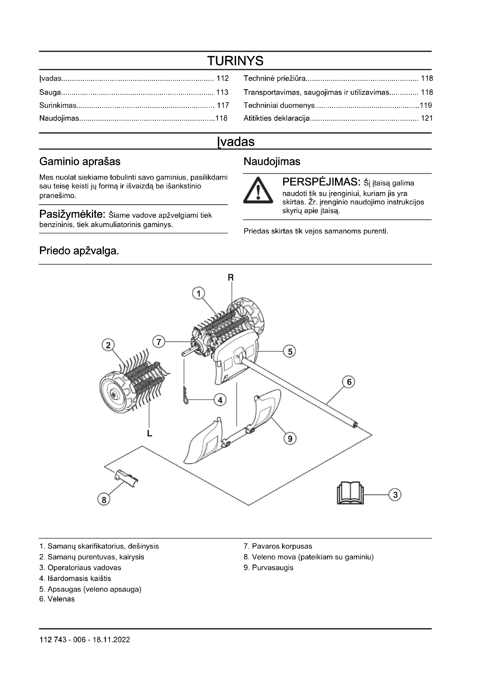 - Atitikties deklaracija Įvadas Gaminio aprašas Mes nuolat siekiame tobulinti savo gaminius, pasilikdami sau teisę keisti jų formą ir išvaizdą be išankstinio pranešimo. Pasižymėkite: Šiame vadove apžvelgiami tiek benzininis, tiek akumuliatorinis gaminys. Naudojimas PERSPĖJIMAS: Šį įtaisą galima naudoti tik su įrenginiui, kuriam jis yra skirtas. Žr. įrenginio naudojimo instrukcijos skyrių apie įtaisą. Priedas skirtas tik vejos samanoms purenti. Priedo apžvalga. p. 121
