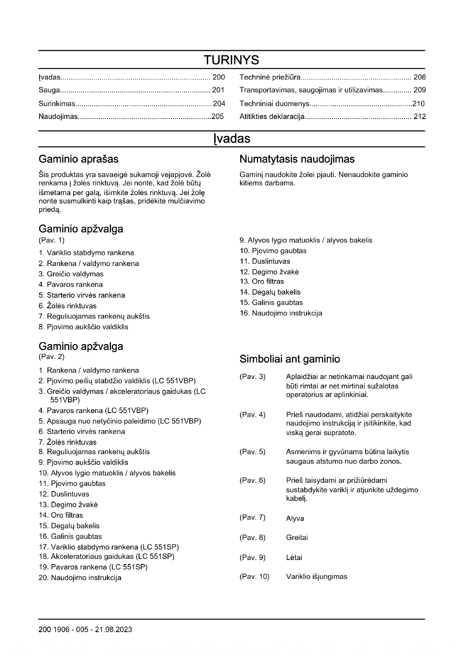 Simboliai ant gaminio (Pav. 3) Aplaidžiai ar netinkamai naudojant gali būti rimtai ar net mirtinai sužalotas operatorius ar aplinkiniai. (Pav. 4) Prieš naudodami, atidžiai perskaitykite naudojimo instrukciją ir įsitikinkite, kad viską gerai supratote. (Pav. 5) Asmenims ir gyvūnams būtina laikytis saugaus atstumo nuo darbo zonos. (Pav. 6) Prieš taisydami ar prižiūrėdami sustabdykite variklį ir atjunkite uždegimo kabelį. (Pav. 7) Alyva (Pav. 8) Greitai (Pav. 9) Lėtai (Pav. 10) Variklio išjungimas 200 1906 - 005 - 21.08.2023(Pav. 11) Oro sklendė (Pav. 12) Disko sankaba (Pav. 13) Saugokitės išmetamų ir rikošetu atšokusių daiktų. (Pav. 14) Saugokite rankas bei kojas ir nekiškite jų prie besisukančio peilio. (Pav. 15) Saugokite rankas bei kojas ir nekiškite jų prie besisukančių dalių. (Pav. 16) Šis įrenginys atitinka jam taikomas EU direktyvas. (Pav. 17) Šis gaminys atitinka taikytinų JK reglamentų nuostatas. (Pav. 18) Triukšmo emisijos į aplinką ženklinimas atitinka ES ir Jungtinės Karalystės direktyvas bei reglamentus ir Naujojo Pietų Velso įstatymą „2017m. aplinkos apsaugos (triukšmo kontrolės) reglamentas“. Gaminio garantuotasis garso galios lygis nurodytas Techniniai duomenys psl. 210 ir etiketėje (Pav. 19) Variklio išmetamosiose dujose yra anglies monoksido – nuodingų, bekvapių ir labai pavojingų dujų. Nenaudokite įrenginio patalpose ar uždarose erdvėse. (Pav. 20) Nenaudokite įrenginio patalpose ar uždarose erdvėse. (Pav. 21) Sprogimo pavojus. (Pav. 22) Karštas paviršius (Pav. 23) Variklis pristatomas be alyvos. (Pav. 24) Prieš naudodami įrenginį, pripilkite alyvos. (Pav. 25) Nenaudokite E85 degalų. (Pav. 26) Saugokite gaminį nuo atviros liepsnos. (Pav. 27) Nuskaitomas kodas. Pasižymėkite: Kiti ant gaminio esantys simboliai / atvaizdai atitinka konkrečios rinkos teisinius reikalavimus. „Euro V“ standartas PERSPĖJIMAS: Variklio modifikavimas panaikina šio produkto ES tipo patvirtinimą. Atsakomybė už gaminį Kaip nurodyta atsakomybės už gaminį įstatymuose, mes nesame atsakingi už mūsų gaminio sukeltą žalą, jei: