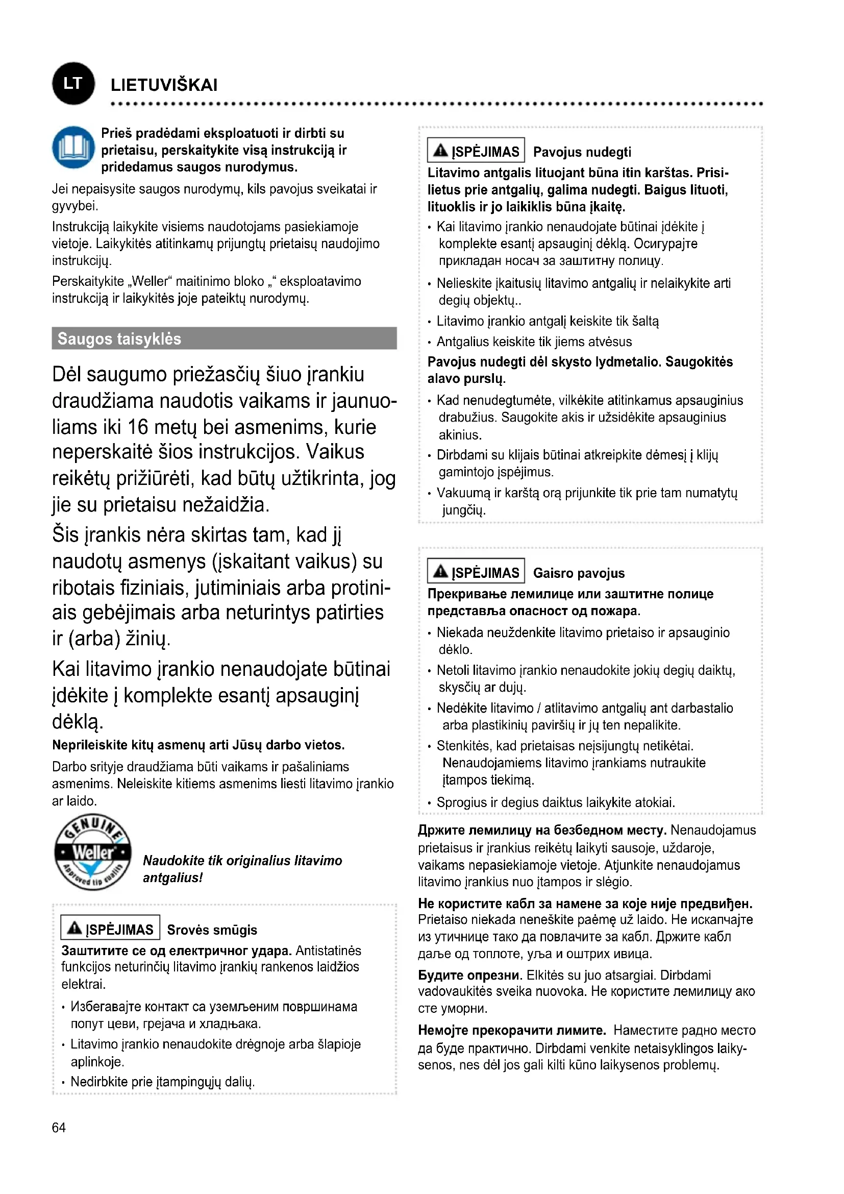 LATVISKI64 Prieš pradėdami eksploatuoti ir dirbti su prietaisu, perskaitykite visą instrukciją ir pridedamus saugos nurodymus. Jei nepaisysite saugos nurodymų, kils pavojus sveikatai ir gyvybei. Instrukciją laikykite visiems naudotojams pasiekiamoje vietoje. Laikykitės atitinkamų prijungtų prietaisų naudojimo instrukcijų. Perskaitykite „Weller“ maitinimo bloko „“ eksploatavimo instrukciją ir laikykitės joje pateiktų nurodymų. Saugos taisyklės Dėl saugumo priežasčių šiuo įrankiu draudžiama naudotis vaikams ir jaunuo- liams iki 16 metų bei asmenims, kurie neperskaitė šios instrukcijos. Vaikus reikėtų prižiūrėti, kad būtų užtikrinta, jog jie su prietaisu nežaidžia. Šis įrankis nėra skirtas tam, kad jį naudotų asmenys (įskaitant vaikus) su ribotais ziniais, jutiminiais arba protini