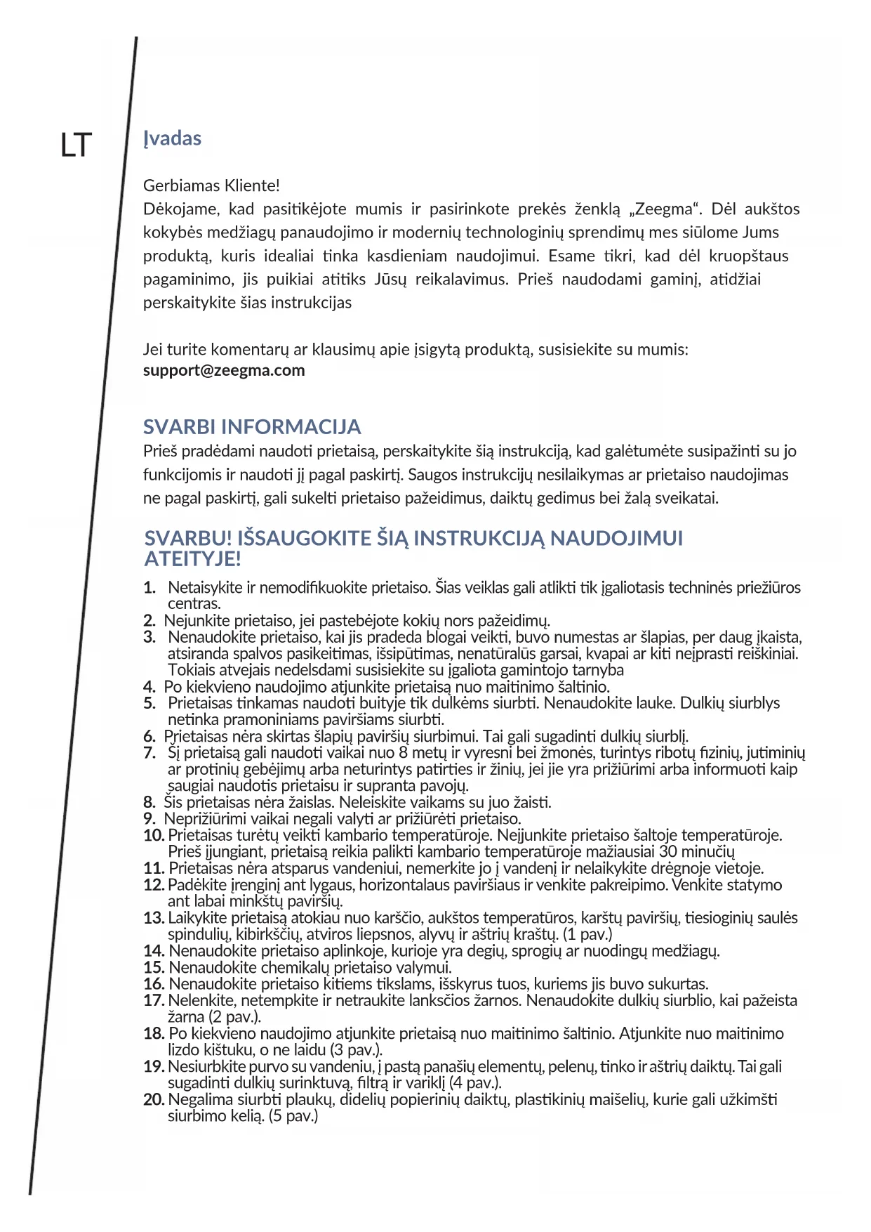 килимів у ручку пилососа Фотографії служать лише для ілюстрації, фактичний зовнішній вигляд продуку може відрізнятися від представленого на фото. Кнопка змотування 1LT Įvadas Gerbiamas Kliente! Dėkojame, kad pasikėjote mumis ir pasirinkote prekės ženklą „Zeegma“. Dėl aukštos kokybės medžiagų panaudojimo ir modernių technologinių sprendimų mes siūlome Jums produktą, kuris idealiai nka kasdieniam naudojimui. Esame kri, kad dėl kruopštaus pagaminimo, jis puikiai aks Jūsų reikalavimus. Prieš naudodami gaminį, adžiai perskaitykite šias instrukcijas Jei turite komentarų ar klausimų apie įsigytą produktą, susisiekite su mumis: support@zeegma.com SVARBI INFORMACIJA Prieš pradėdami naudo prietaisą, perskaitykite šią instrukciją, kad galėtumėte susipažin su jo funkcijomis ir naudo jį pagal paskir. Saugos instrukcijų nesilaikymas ar prietaiso naudojimas ne pagal paskir, gali sukel prietaiso pažeidimus, daiktų gedimus bei žalą sveikatai.