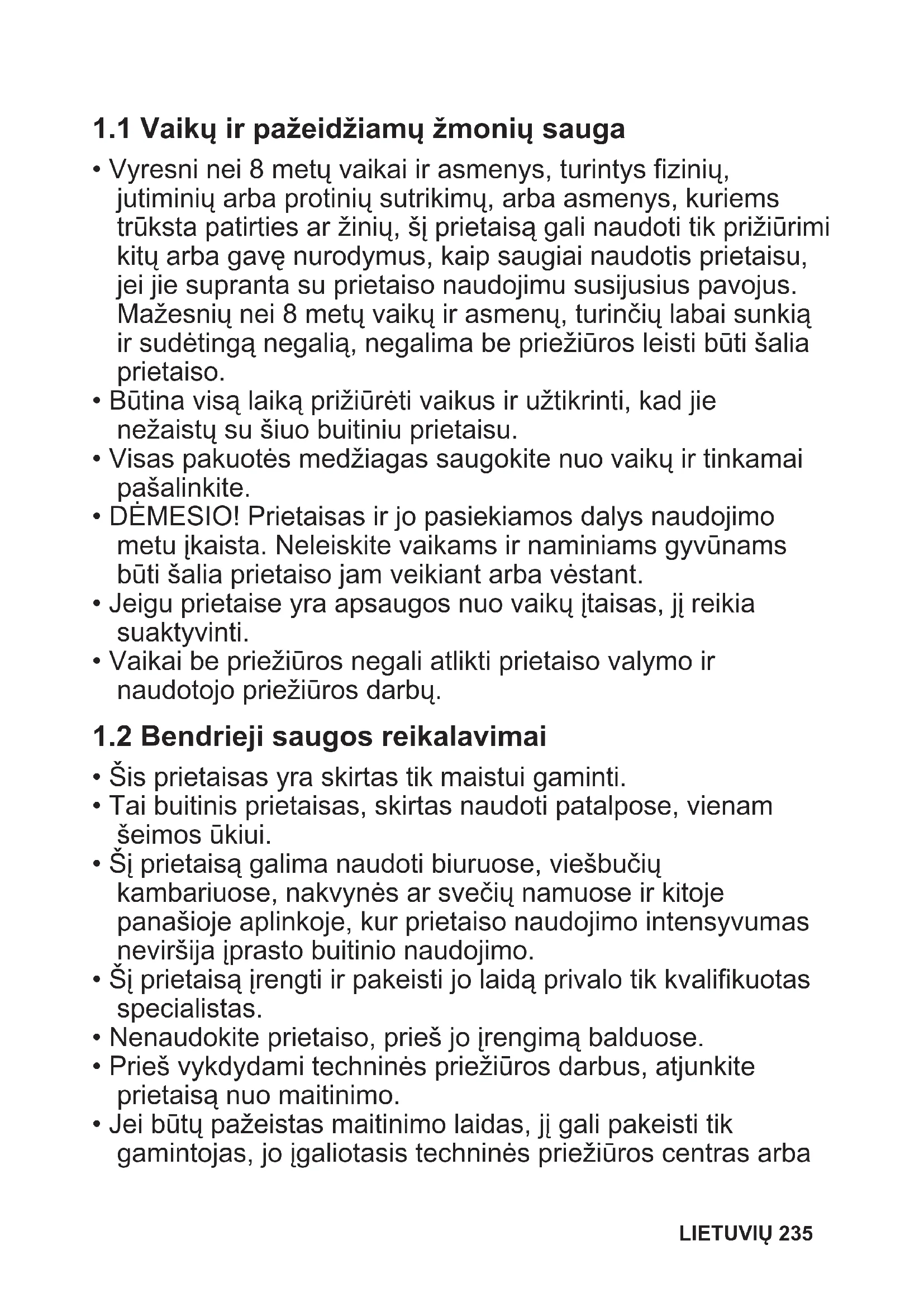 Prieš įrengdami ir naudodami šį prietaisą, atidžiai perskaitykite pateiktą instrukciją. Gamintojas neatsako už sužalojimus ar žalą, patirtą dėl netinkamo prietaiso įrengimo ar naudojimo. Instrukciją visada laikykite saugioje ir pasiekiamoje vietoje, kad prireikus galėtumėte pasižiūrėti. 234 LIETUVIŲ1.1 Vaikų ir pažeidžiamų žmonių sauga