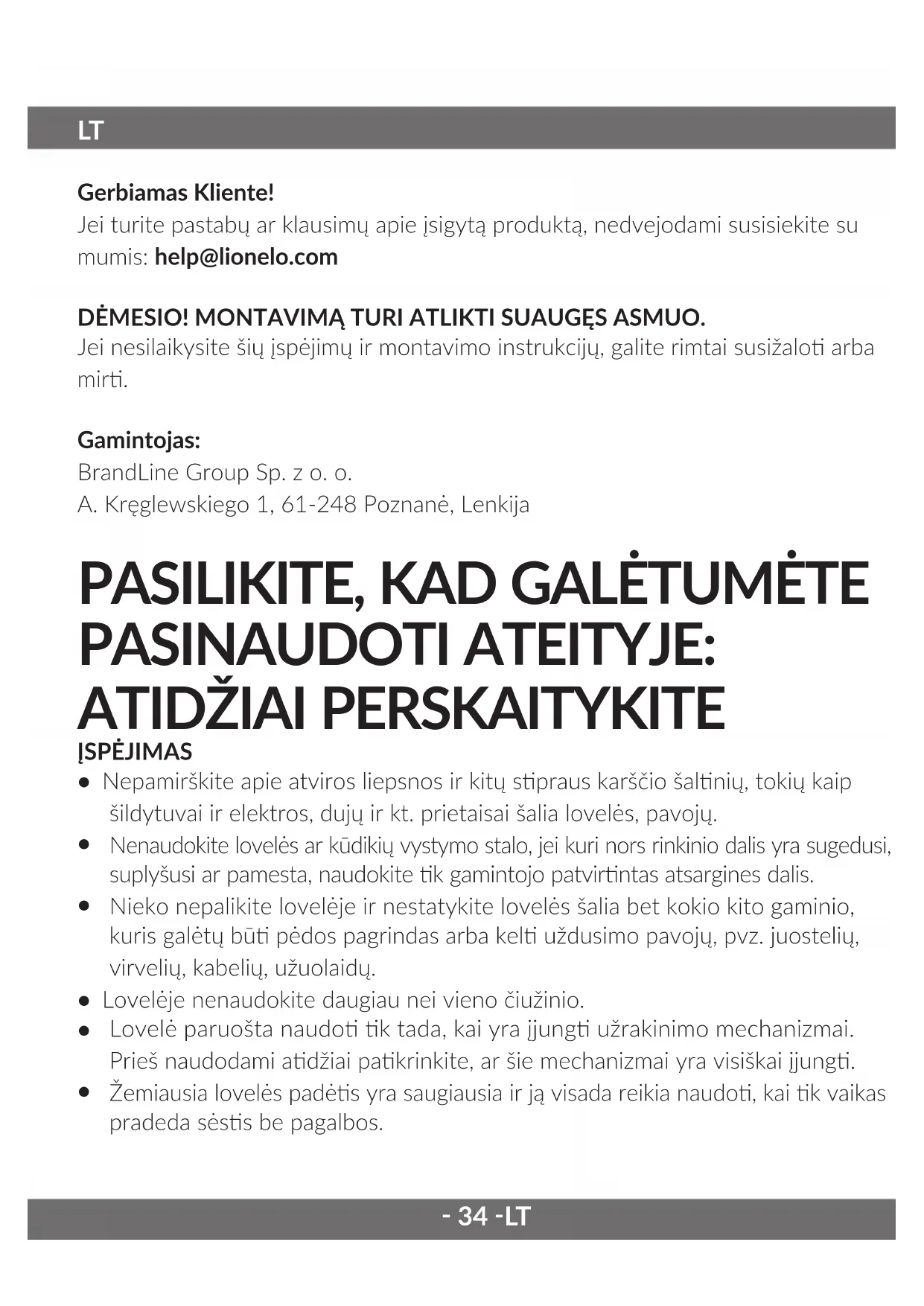 Gerbiamas Kliente! Jei turite pastabų ar klausimų apie įsigytą produktą, nedvejodami susisiekite su mumis: help@lionelo.com DĖMESIO! MONTAVIMĄ TURI ATLIKTI SUAUGĘS ASMUO. Jei nesilaikysite šių įspėjimų ir montavimo instrukcijų, galite rimtai susižalo arba mir. Gamintojas: BrandLine Group Sp. z o. o. A. Kręglewskiego 1, 61-248 Poznanė, Lenkija