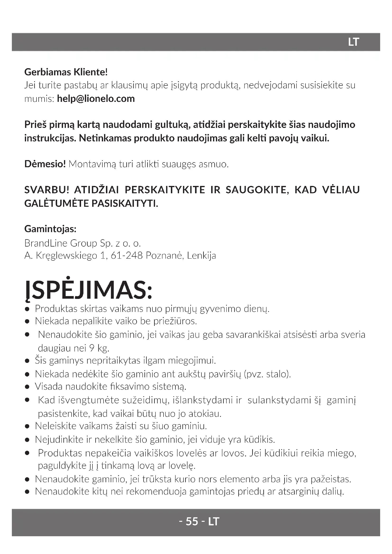Problemų sprendimas Problema Galima priežass Sprendimas Papildoma informacija Mirksi indika- toriaus lemputė Silpnos baterijos arba pažeistas mai- nimo adapteris. Baterijų arba adapterio keimas. Staiga nustoja supti. Praėjo nustatytas laikas. Išjunkite sūpynes rankenėle ir vėl įjunkite. Išjunkite supimo laiko nustatymą. Kiekvienas iš šių spren- dimų privers gaminį vėl veik, bus pakeistas k darbo laikas ir supimo greis. Nepradeda sup. Neteisingai įdėtos baterijos. Pažeistas mainimo adapteris. Mainimo adapteris nenkamai prijungtas. Lizde nėra elektros. Įdėkite baterijas dar kartą. Ypangą dėmesį atkreipkite į jų poliškumą. Pakrinkite, ar nkamai prijungtas mainimo adapteris ir kabelis. Pakrinkite, ar mainimo šalnis nkamai įkištas į lizdą. Supimas mažesniu kampu nei pasirinktas. Gultukui paprastai reikia apie 20–45 sekundžių, kad pradėtų sups. Esant žemai įtampai ir esant didelei apkrovai, sūpynėms gali prireik iki 50 sekundžių, kad nkamai pradėtų sups. Iškreipta muzika. Baterijos išsekusios. Pakeiskite baterijas.‑ 60 ‑LT | CS Muzika staiga nustoja gro. Praėjo nustatytas laikas. Dar kartą paspauskite muzikos atkūrimo mygtuką. Sūpavimo laiko ir muzikos grojimo laiko nustatymai nėra tarpusavyje susiję. Galite pakoreguo nustatymus, kad muzika nustotų gro, o gaminys toliau siūbuotų kūdikį, arba atvirkščiai. Šis veiksmas yra tyčinis ir skirtas suteik vartotojui daugiau laisvės keičiant nustatymus. Valymas ir priežiūra Pagalvė, sėdynės užvalkalas – plaukite rankomis ne aukštesnėje kaip 40 ° C temperatūroje. Produkto lankas ir rėmai – nuplaukite drėgnu, minkštu skudurėliu ir švelniu muilu. Po to nusausinkite. Nuotraukos skirtos k iliustracijai, kroji gaminių išvaizda gali skirs nuo pateiktos nuotraukose. Vážení zákazníci! Máte-li jakékoli připomínky nebo dotazy týkající se zakoupeného výrobku, kontaktujte nás: help@lionelo.com Před prvním použim lehátka si prosím pečlivě přečtěte tento návod k použi. Nesprávné používání výrobku může představovat nebezpečí pro dítě. Upozornění! Montáž musí provést dospělá osoba. DŮLEŽITÉ! POKYNY SI POZORNĚ PŘEČTĚTE A USCHOVEJTE PRO POZDĚJŠÍ POUŽITÍ. CS‑ 61 ‑ CS Výrobce: BrandLine Group Sp. z o. o. ul. A. Kręglewskiego 1, 61-248 Poznaň, POLSKO Varování: