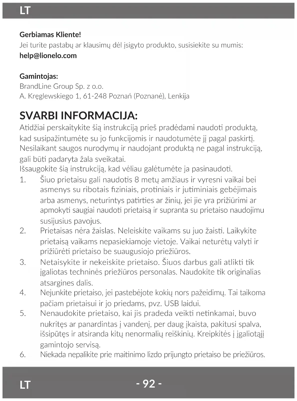 Gerbiamas Kliente! Jei turite pastabų ar klausimų dėl įsigyto produkto, susisiekite su mumis: help@lionelo.com Gamintojas: BrandLine Group Sp. z o.o. A. Kręglewskiego 1, 61-248 Poznań (Poznanė), Lenkija SVARBI INFORMACIJA: Adžiai perskaitykite šią instrukciją prieš pradėdami naudo produktą, kad susipažintumėte su jo funkcijomis ir naudotumėte jį pagal paskir. Nesilaikant saugos nurodymų ir naudojant produktą ne pagal instrukciją, gali bū padaryta žala sveikatai. Išsaugokite šią instrukciją, kad vėliau galėtumėte ja pasinaudo.