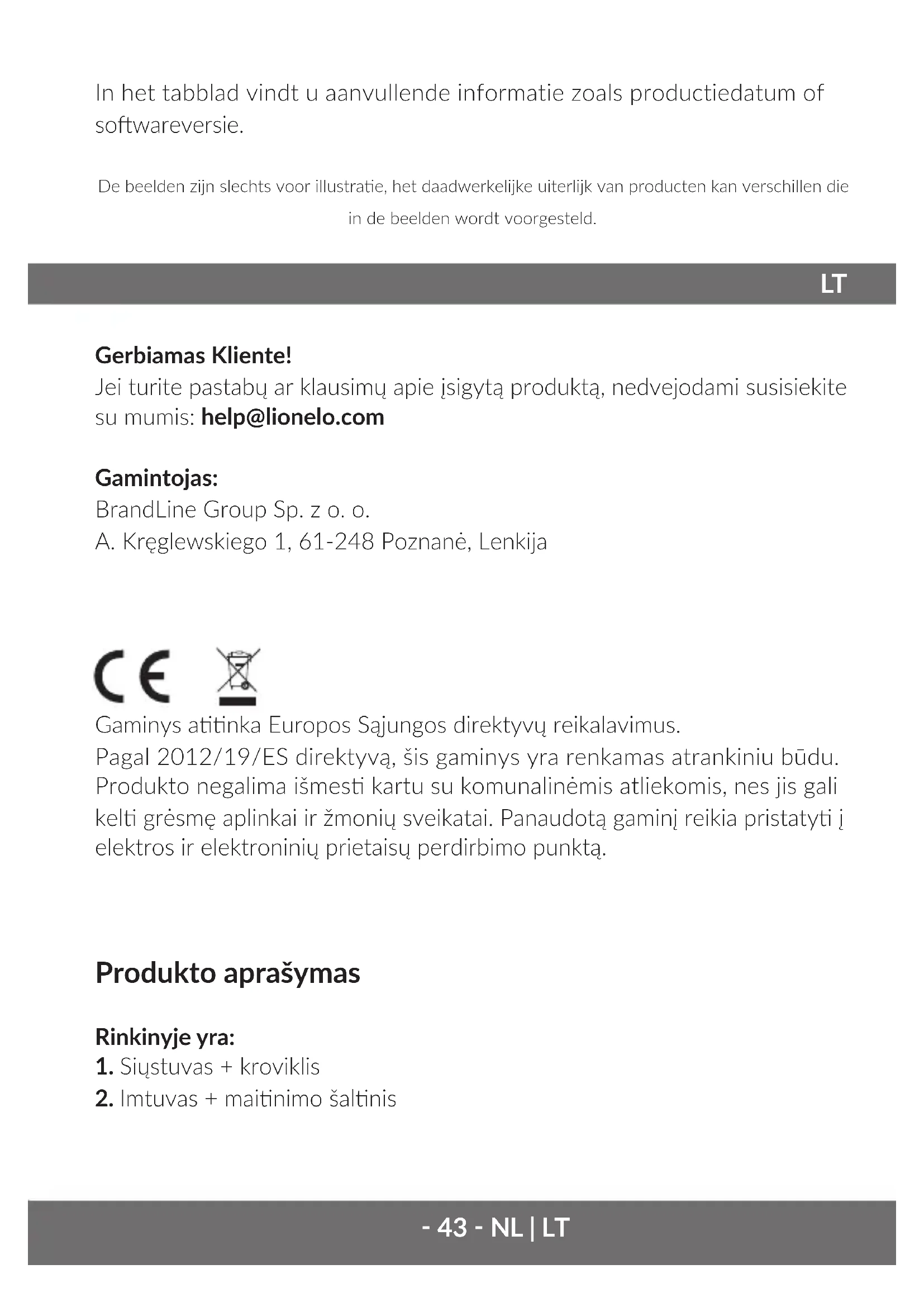 Gerbiamas Kliente! Jei turite pastabų ar klausimų apie įsigytą produktą, nedvejodami susisiekite su mumis: help@lionelo.com Gamintojas: BrandLine Group Sp. z o. o. A. Kręglewskiego 1, 61-248 Poznanė, Lenkija Gaminys anka Europos Sąjungos direktyvų reikalavimus. Pagal 2012/19/ES direktyvą, šis gaminys yra renkamas atrankiniu būdu. Produkto negalima išmes kartu su komunalinėmis atliekomis, nes jis gali kel grėsmę aplinkai ir žmonių sveikatai. Panaudotą gaminį reikia pristaty į elektros ir elektroninių prietaisų perdirbimo punktą. Produkto aprašymas Rinkinyje yra: