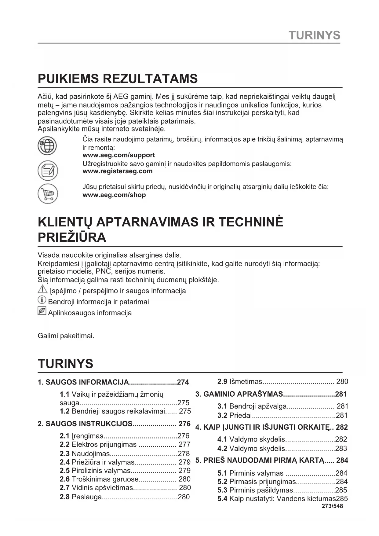 Ačiū, kad pasirinkote šį AEG gaminį. Mes jį sukūrėme taip, kad nepriekaištingai veiktų daugelį metų – jame naudojamos pažangios technologijos ir naudingos unikalios funkcijos, kurios palengvins jūsų kasdienybę. Skirkite kelias minutes šiai instrukcijai perskaityti, kad pasinaudotumėte visais joje pateiktais patarimais. Apsilankykite mūsų interneto svetainėje. Čia rasite naudojimo patarimų, brošiūrų, informacijos apie trikčių šalinimą, aptarnavimą ir remontą: www.aeg.com/support Užregistruokite savo gaminį ir naudokitės papildomomis paslaugomis: www.registeraeg.com Jūsų prietaisui skirtų priedų, nusidėvinčių ir originalių atsarginių dalių ieškokite čia: www.aeg.com/shop