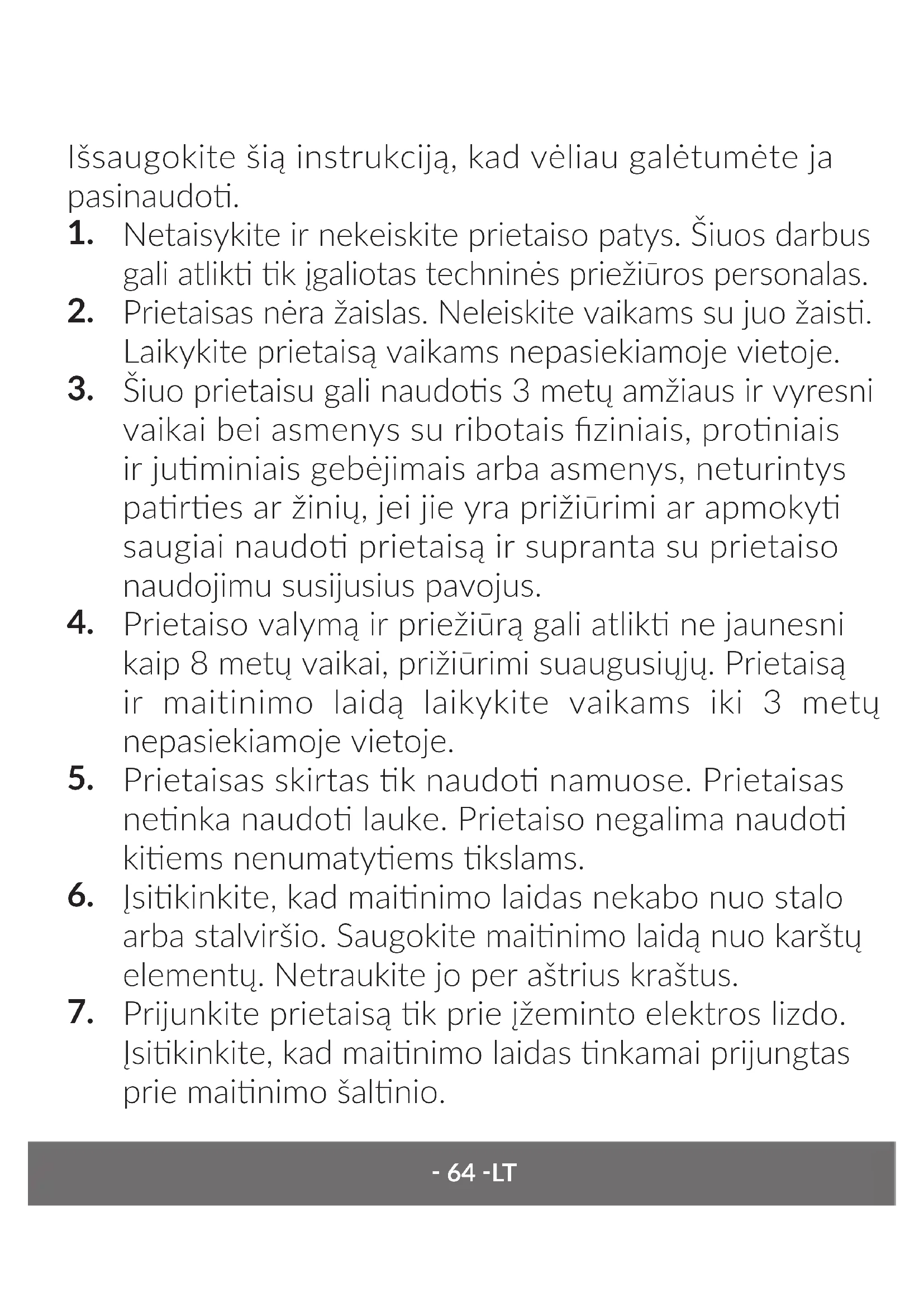 Prietaiso valymą ir priežiūrą gali atlik ne jaunesni kaip 8 metų vaikai, prižiūrimi suaugusiųjų. Prietaisą ir maitinimo laidą laikykite vaikams iki 3 metų nepasiekiamoje vietoje.