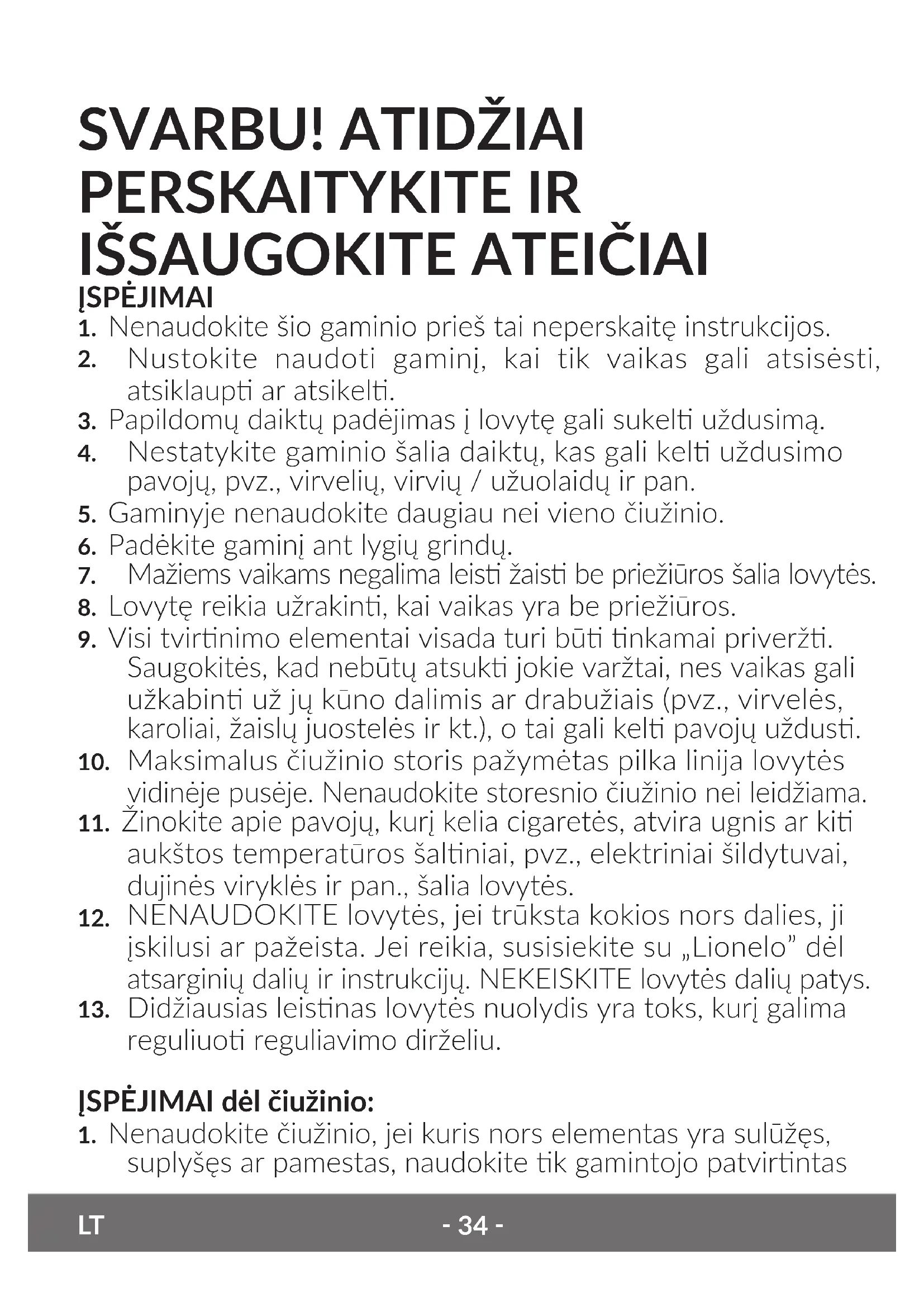 Gerbiamas Kliente! Jei turite pastabų ar klausimų apie įsigytą produktą, nedvejodami susisiekite su mumis: help@lionelo.com Produktas buvo išbandytas ir anka standartą: EN 1130: 2019 + AC: 2020, EN 16890: 2017+A1:2021. Prieš naudodami gaminį, adžiai perskaitykite toliau pateiktą naudojimo instrukciją. Gamintojas: BrandLine Group Sp. z o. o. A. Kręglewskiego 1, 61-248 Poznanė, Lenkija NL | LT‑ 34 ‑
