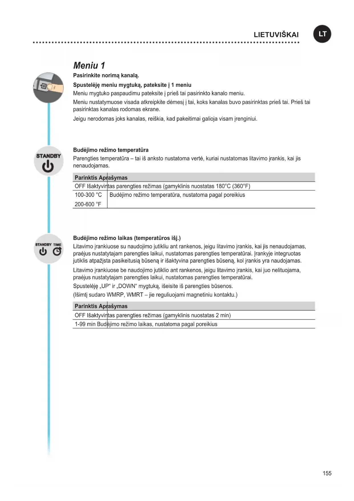 - Pārbaudiet saskarnes iestatījumus155 Meniu 1 Pasirinkite norimą kanalą. Spustelėję meniu mygtuką, pateksite į 1 meniu Meniu mygtuko paspaudimu pateksite į prieš tai pasirinkto kanalo meniu. Meniu nustatymuose visada atkreipkite dėmesį į tai, koks kanalas buvo pasirinktas prieš tai. Prieš tai pasirinktas kanalas rodomas ekrane. Jeigu nerodomas joks kanalas, reiškia, kad pakeitimai galioja visam įrenginiui. Budėjimo režimo temperatūra Parengties temperatūra – tai iš anksto nustatoma vertė, kuriai nustatomas litavimo įrankis, kai jis nenaudojamas. Parinktis Apraymas OFF Išaktyvintas parengties režimas (gamyklinis nuostatas 180°C (360°F) 100-300 °C 200-600 °F Budėjimo režimo temperatūra, nustatoma pagal poreikius Budėjimo režimo laikas (temperatūros ij.) Litavimo įrankiuose su naudojimo jutikliu ant rankenos, jeigu litavimo įrankis, kai jis nenaudojamas, praėjus nustatytajam parengties laikui, nustatomas parengties temperatūrai. Įrankyje integruotas jutiklis atpažįsta pasikeitusią būseną ir išaktyvina parengties būseną, kol įrankis yra naudojamas. Litavimo įrankiuose be naudojimo jutiklio ant rankenos, jeigu litavimo įrankis, kai juo nelituojama, praėjus nustatytajam parengties laikui, nustatomas parengties temperatūrai. Spustelėję „UP“ ir „DOWN“ mygtuką, išeisite iš parengties būsenos. (Išimtį sudaro WMRP, WMRT – jie reguliuojami magnetiniu kontaktu.) Parinktis Apraymas OFF Išaktyvintas parengties režimas (gamyklinis nuostatas 2 min) 1-99 min Budėjimo režimo laikas, nustatoma pagal poreikius