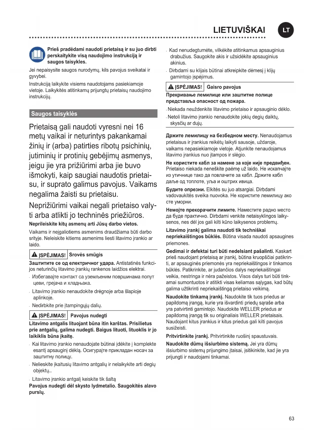 - Netoli litavimo įrankio nenaudokite jokių degių daiktų, skysčių ar dujų. Држите лемилицу на безбедном месту. Nenaudojamus prietaisus ir įrankius reikėtų laikyti sausoje, uždaroje, vaikams nepasiekiamoje vietoje. Atjunkite nenaudojamus litavimo įrankius nuo įtampos ir slėgio. Не користите кабл за намене за које није предвиђен. Prietaiso niekada neneškite paėmę už laido. Не искапчајте из утичнице тако да повлачите за кабл. Држите кабл даље од топлоте, уља и оштрих ивица. Будите опрезни. Elkitės su juo atsargiai. Dirbdami vadovaukitės sveika nuovoka. Не користите лемилицу ако сте уморни. Немојте прекорачити лимите. Наместите радно место да буде практично. Dirbdami venkite netaisyklingos laiky- senos, nes dėl jos gali kilti kūno laikysenos problemų. Litavimo įrankį galima naudoti tik techniškai nepriekaištingos būklės. Būtina visada naudoti apsaugines priemones. Gedimai ir defektai turi būti nedelsiant pašalinti. Kaskart prieš naudojant prietaisą ar įrankį, būtina kruopščiai patikrin- ti, ar apsauginės priemonės yra nepriekaištingos ir tinkamos būklės. Patikrinkite, ar judančios dalys nepriekaištingai veikia, nestringa ir nėra pažeistos. Visos dalys turi būti tink- amai sumontuotos ir atitikti visas keliamas sąlygas, kad būtų galima užtikrinti nepriekaištingą prietaiso veikimą. Naudokite tinkamą įrankį. Naudokite tik tuos priedus ar papildomą įrangą, kurie yra išvardinti priedų sąraše arba yra patvirtinti gamintojo. Naudokite WELLER priedus ar papildomą įrangą tik su originaliais WELLER prietaisais. Naudojant kitus įrankius ir kitus priedus gali kilti pavojus susižeisti. Pritvirtinkite įrankį. Pritvirtinkite ruošinį spaustuvais. Naudokite dūmų išsiurbimo sistemą. Jei yra dūmų išsiurbimo sistemų prijungimo įtaisai, įsitikinkite, kad jie yra prijungti ir naudojami tinkamai.