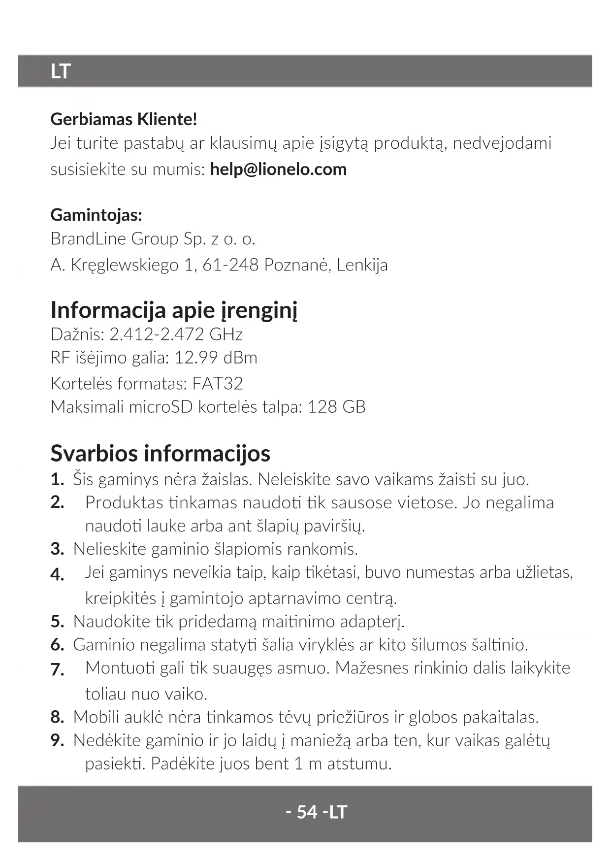 Gerbiamas Kliente! Jei turite pastabų ar klausimų apie įsigytą produktą, nedvejodami susisiekite su mumis: help@lionelo.com Gamintojas: BrandLine Group Sp. z o. o. A. Kręglewskiego 1, 61-248 Poznanė, Lenkija Informacija apie įrenginį Dažnis: 2.412-2.472 GHz RF išėjimo galia: 12.99 dBm Kortelės formatas: FAT32 Maksimali microSD kortelės talpa: 128 GB Svarbios informacijos