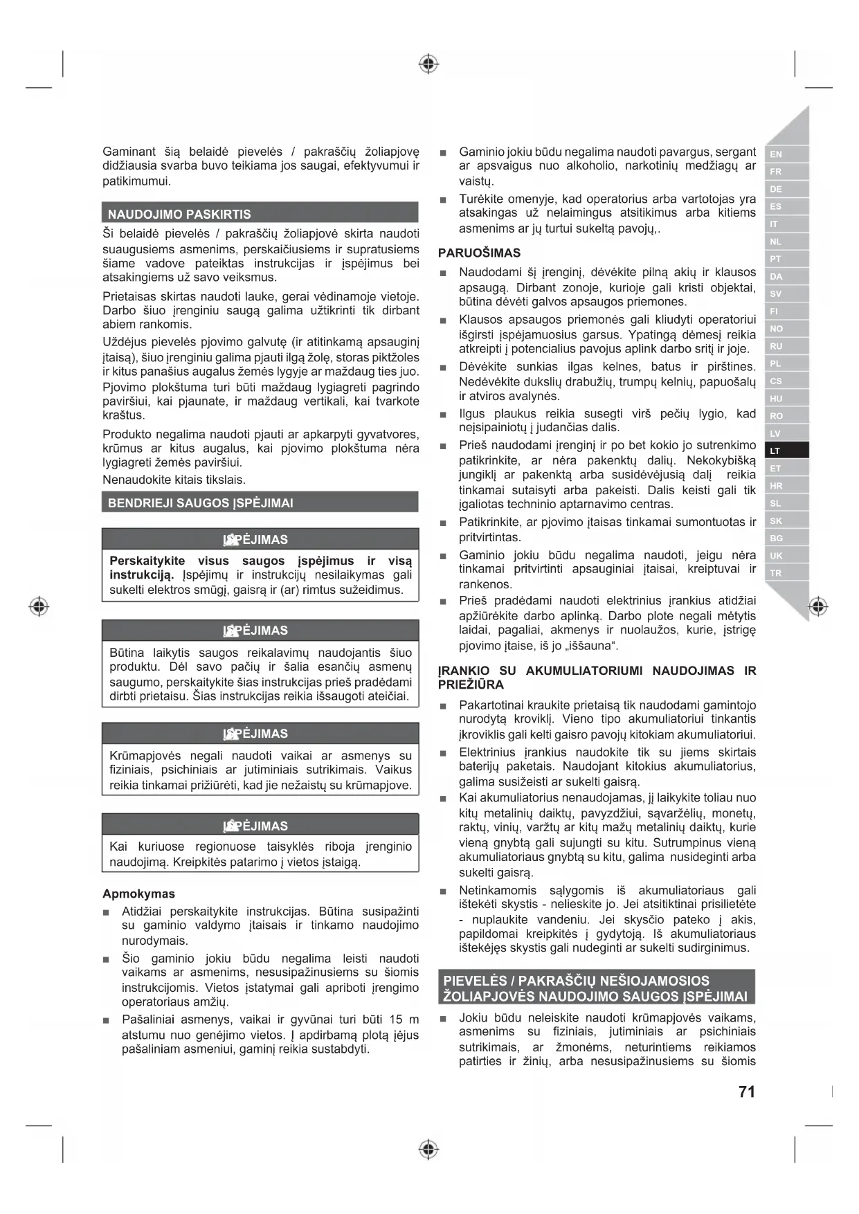 ĮSPĖJIMAS Perskaitykite visus saugos įspėjimus ir visą instrukciją. Įspėjimų ir instrukcijų nesilaikymas gali sukelti elektros smūgį, gaisrą ir (ar) rimtus sužeidimus. ĮSPĖJIMAS Būtina laikytis saugos reikalavimų naudojantis šiuo produktu. Dėl savo pačių ir šalia esančių asmenų saugumo, perskaitykite šias instrukcijas prieš pradėdami dirbti prietaisu. Šias instrukcijas reikia išsaugoti ateičiai. ĮSPĖJIMAS Krūmapjovės negali naudoti vaikai ar asmenys su fiziniais, psichiniais ar jutiminiais sutrikimais. Vaikus reikia tinkamai prižiūrėti, kad jie nežaistų su krūmapjove. ĮSPĖJIMAS Kai kuriuose regionuose taisyklės riboja įrenginio naudojimą. Kreipkitės patarimo į vietos įstaigą. Apmokymas ■ Atidžiai perskaitykite instrukcijas. Būtina susipažinti su gaminio valdymo įtaisais ir tinkamo naudojimo nurodymais. ■ Šio gaminio jokiu būdu negalima leisti naudoti vaikams ar asmenims, nesusipažinusiems su šiomis instrukcijomis. Vietos įstatymai gali apriboti įrengimo operatoriaus amžių. ■ Pašaliniai asmenys, vaikai ir gyvūnai turi būti 15 m atstumu nuo genėjimo vietos. Į apdirbamą plotą įėjus pašaliniam asmeniui, gaminį reikia sustabdyti. ■ Gaminio jokiu būdu negalima naudoti pavargus, sergant ar apsvaigus nuo alkoholio, narkotinių medžiagų ar vaistų. ■ Turėkite omenyje, kad operatorius arba vartotojas yra atsakingas už nelaimingus atsitikimus arba kitiems asmenims ar jų turtui sukeltą pavojų,. PARUOŠIMAS ■ Naudodami šį įrenginį, dėvėkite pilną akių ir klausos apsaugą. Dirbant zonoje, kurioje gali kristi objektai, būtina dėvėti galvos apsaugos priemones. ■ Klausos apsaugos priemonės gali kliudyti operatoriui išgirsti įspėjamuosius garsus. Ypatingą dėmesį reikia atkreipti į potencialius pavojus aplink darbo sritį ir joje. ■ Dėvėkite sunkias ilgas kelnes, batus ir pirštines. Nedėvėkite dukslių drabužių, trumpų kelnių, papuošalų ir atviros avalynės. ■ Ilgus plaukus reikia susegti virš pečių lygio, kad neįsipainiotų į judančias dalis. ■ Prieš naudodami įrenginį ir po bet kokio jo sutrenkimo patikrinkite, ar nėra pakenktų dalių. Nekokybišką jungiklį ar pakenktą arba susidėvėjusią dalį reikia tinkamai sutaisyti arba pakeisti. Dalis keisti gali tik įgaliotas techninio aptarnavimo centras. ■ Patikrinkite, ar pjovimo įtaisas tinkamai sumontuotas ir pritvirtintas. ■ Gaminio jokiu būdu negalima naudoti, jeigu nėra tinkamai pritvirtinti apsauginiai įtaisai, kreiptuvai ir rankenos. ■ Prieš pradėdami naudoti elektrinius įrankius atidžiai apžiūrėkite darbo aplinką. Darbo plote negali mėtytis laidai, pagaliai, akmenys ir nuolaužos, kurie, įstrigę pjovimo įtaise, iš jo „iššauna“.