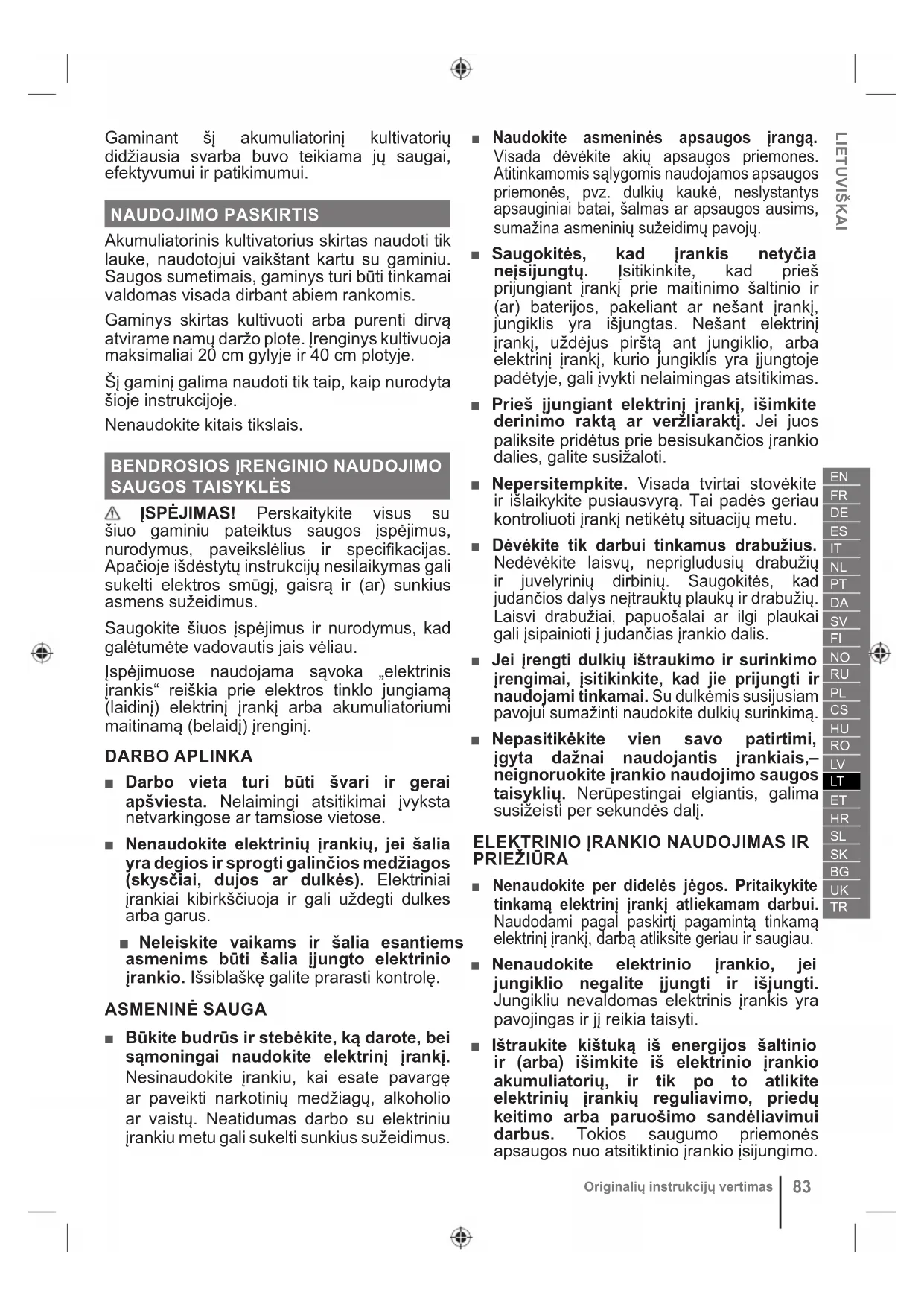 ■ Pakartotinai kraukite prietaisą tik naudodami gamintojo nurodytą kroviklį. Vieno tipo akumuliatoriui tinkantis įkroviklis gali kelti gaisro pavojų kitokiam akumuliatoriui. ■ Elektrinius įrankius naudokite tik su jiems skirtais baterijų paketais. Naudojant kitokius akumuliatorius, galima susižeisti ar sukelti gaisrą. ■ Kai akumuliatorius nenaudojamas, jį laikykite toliau nuo kitų metalinių daiktų, pavyzdžiui, sąvaržėlių, monetų, raktų, vinių, varžtų ar kitų mažų metalinių daiktų, kurie vieną gnybtą gali sujungti su kitu. Sutrumpinus vieną akumuliatoriaus gnybtą su kitu, galima nusideginti arba sukelti gaisrą. ■ Netinkamomis sąlygomis iš akumuliatoriaus gali ištekėti skystis - nelieskite jo. Jei atsitiktinai prisilietėte - nuplaukite vandeniu. Jei skysčio pateko į akis, nedelsiant kreipkitės į gydytoją. Iš akumuliatoriaus ištekėjęs skystis gali nudeginti ar sukelti sudirginimus. ■ Nenaudokite akumuliatorių bloko ar įrankio, kuris yra sugadintas arba pakeistas. Sugadinti arba pakeisti akumuliatoriai gali veikti neprognozuojamai ir dėl to gali kilti gaisras, sprogimas arba pavojus susižaloti. ■ Saugokite akumuliatorių nuo ugnies ir pernelyg aukštos temperatūros. Patekus į ugnį arba veikiant aukštesnei nei 130 °C temperatūrai gali kilti sprogimas. ■ Laikykitės visų įkrovimo instrukcijų ir neįkraukite akumuliatorių bloko ar įrankio jei temperatūra yra už instrukcijose nurodyto diapazono ribų. Netinkamai įkraunant arba jei temperatūra yra už nurodyto diapazono ribų gali būti sugadinti akumuliatoriai ir padidėti gaisro pavojus. TECHNINIS APTARNAVIMAS ■ Prietaisą turi remontuoti tik kvalifikuoti darbuotojai, kurie naudoja tik originalias atsargines detales. Tai užtikrins nuolatinį įrenginio saugumą. ■ Niekada neremontuokite pažeistų akumuliatorių. Akumuliatorius remontuoti gali tik jo gamintojai arba įgaliotieji techninės priežiūros paslaugų teikėjai. KULTIVATORIAUS NAUDOJIMO
