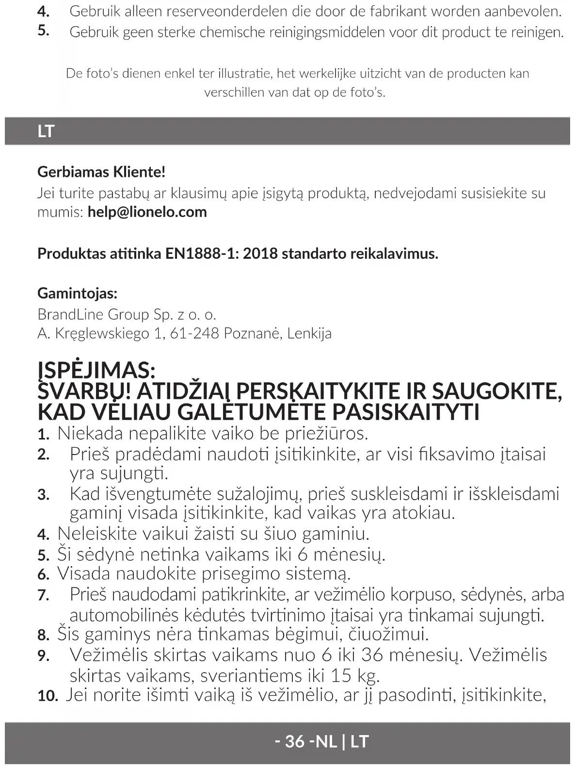 Norėdami nuleis atlošą, traukite už sėdynės atlošo kampo reguliavimo diržo esančią sag (7 pav.). Kojų atramos reguliavimas Norėdami nuleis kojų atramą, paspauskite mygtukus abiejose kojų atramų pusėse esančiose angose ir paspauskite kojų atramą žemyn. Norėdami pakel kojų atramą, pakelkite ją aukštyn, kol išgirsite spragtelėjimą (8 pav.). Tinklelio nuo uodų saugykla Tinklelio nuo uodų saugykla yra po kojų atrama. Stogelio reguliavimas‑ 39 ‑ LT | CS Vážení zákazníci! Máte-li jakékoli připomínky nebo dotazy týkající se zakoupeného výrobku, kontaktujte nás: help@lionelo.com Výrobek splňuje požadavky normy EN1888-1:2018. Výrobce: BrandLine Group Sp. z o.o. ul. A. Kręglewskiego 1, 61-248 Poznań, Polsko UPOZORNĚNÍ, DŮLEŽITÉ! POKYNY SI POZORNĚ PŘEČTĚTE A Norėdami sureguliuo stogelį, esiog pastumkite jį į priekį arba atgal ir nustatykite kaip norite (9 pav.). Lanko reguliavimas Norėdami nuim lanką, paspauskite atleidimo mygtukus (10 pav.), tada ištraukite lanką (10a pav.). Spustelėjimas parodys, kaip teisingai įdėtas lankas. Valymas ir priežiūra