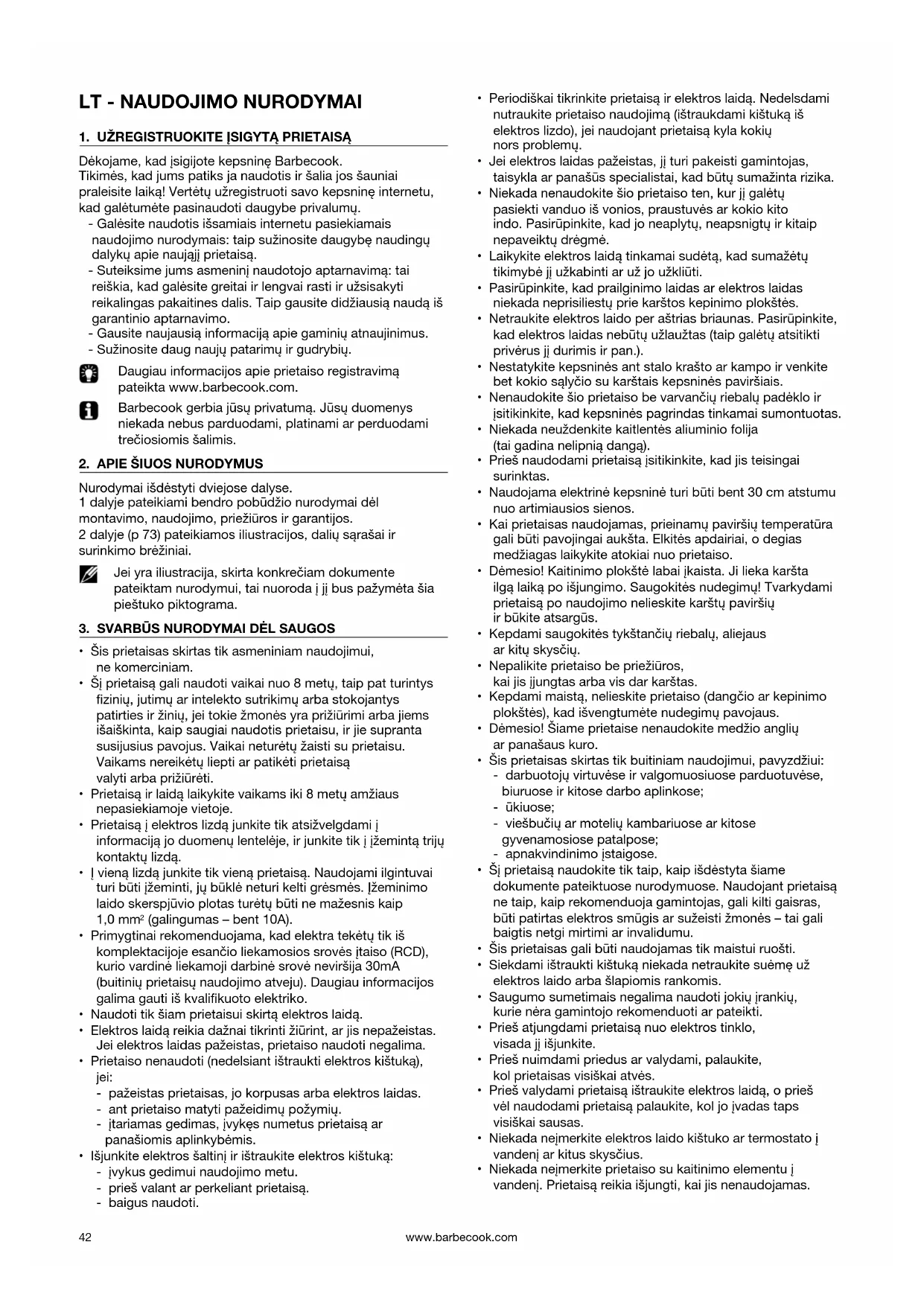 Dėkojame, kad įsigijote kepsninę Barbecook. Tikimės, kad jums patiks ja naudotis ir šalia jos šauniai praleisite laiką! Vertėtų užregistruoti savo kepsninę internetu, kad galėtumėte pasinaudoti daugybe privalumų. - Galėsite naudotis išsamiais internetu pasiekiamais naudojimo nurodymais: taip sužinosite daugybę naudingų dalykų apie naująjį prietaisą. - Suteiksime jums asmeninį naudotojo aptarnavimą: tai reiškia, kad galėsite greitai ir lengvai rasti ir užsisakyti reikalingas pakaitines dalis. Taip gausite didžiausią naudą iš garantinio aptarnavimo. - Gausite naujausią informaciją apie gaminių atnaujinimus. - Sužinosite daug naujų patarimų ir gudrybių. Daugiau informacijos apie prietaiso registravimą pateikta www.barbecook.com. Barbecook gerbia jūsų privatumą. Jūsų duomenys niekada nebus parduodami, platinami ar perduodami trečiosiomis šalimis.