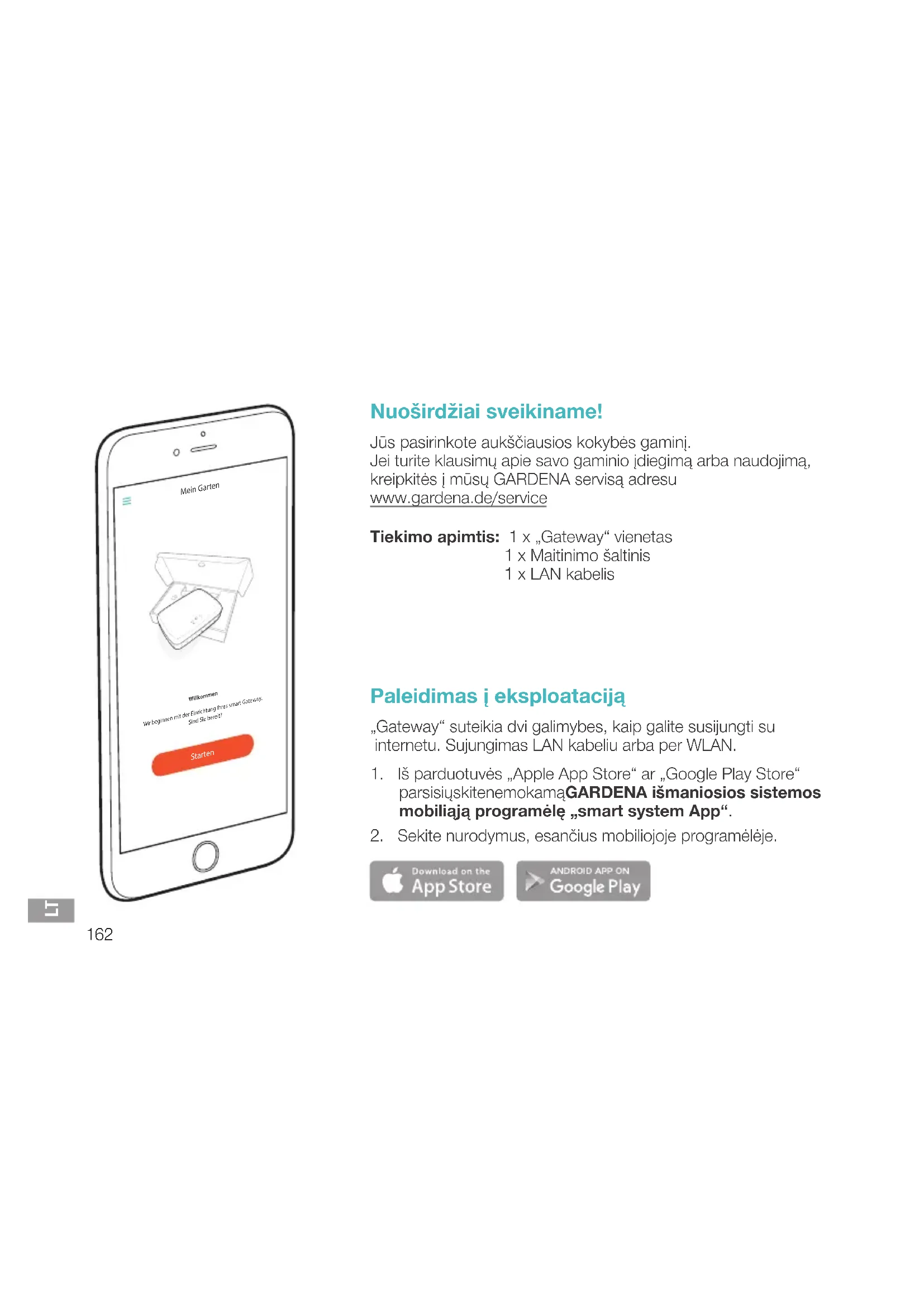 Nuoširdžiai sveikiname! Jūs pasirinkote aukščiausios kokybės gaminį. Jei turite klausimų apie savo gaminio įdiegimą arba naudojimą, kreipkitės į mūsų GARDENA servisą adresu www.gardena.de/service Tiekimo apimtis: 1 x „Gateway“ vienetas 1 x Maitinimo šaltinis 1 x LAN kabelis Paleidimas į eksploataciją „Gateway“ suteikia dvi galimybes, kaip galite susijungti su internetu. Sujungimas LAN kabeliu arba per WLAN.