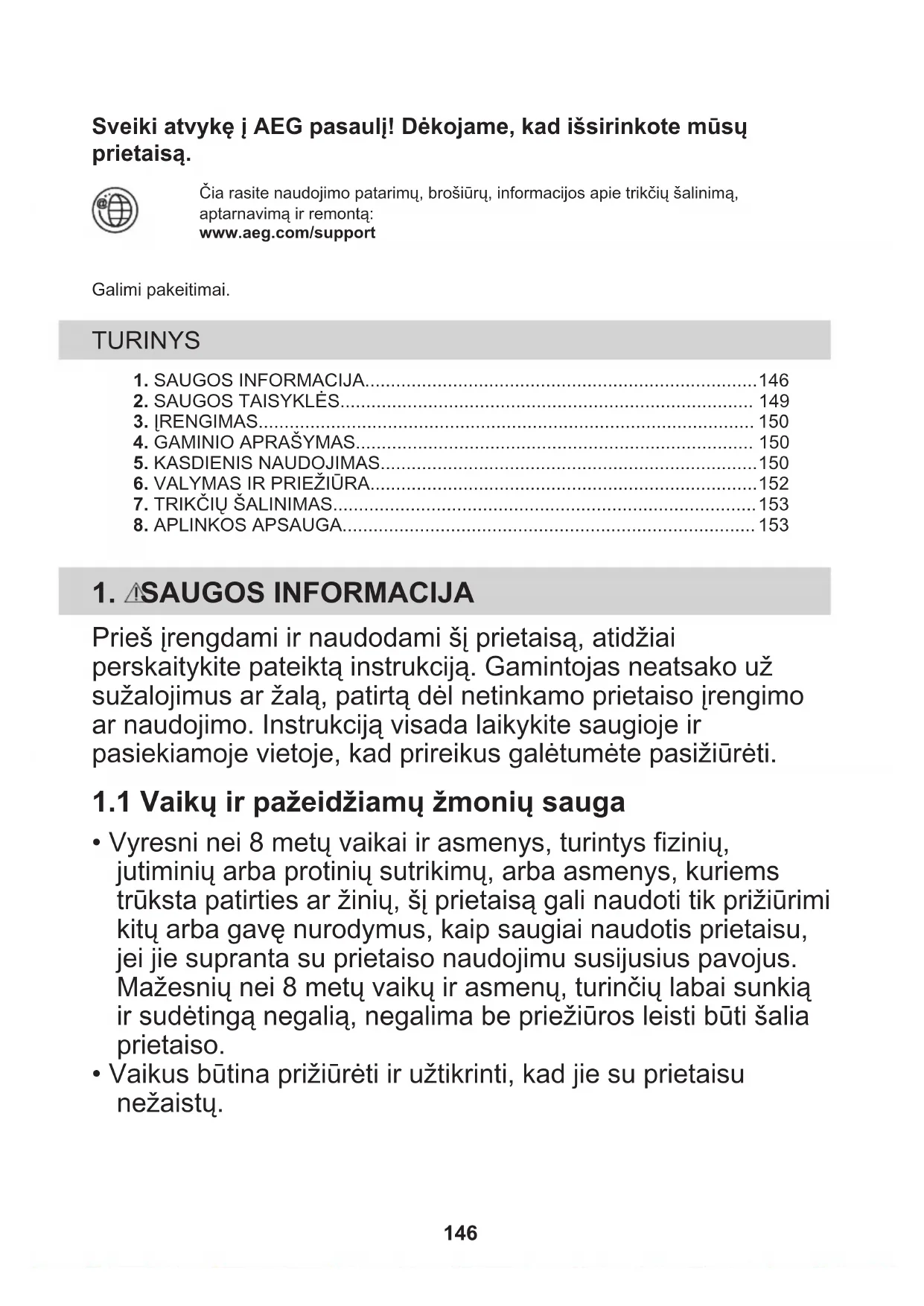 Atiduokite perdirbti medžiagas, pažymėtas šiuo ženklu . Išmeskite pakuotę į atitinkamą atliekų surinkimo konteinerį, kad ji būtų perdirbta. Padėkite saugoti aplinką bei žmonių sveikatą ir surinkti bei perdirbti elektros ir elektronikos prietaisų atliekas. Neišmeskite šiuo ženklu pažymėtų prietaisų kartu su kitomis buitinėmis atliekomis. Atiduokite šį gaminį į vietos atliekų surinkimo punktą arba susisiekite su vietos savivaldybe dėl papildomos informacijos. 153Esiet sveicināti AEG pasaulē! Pateicamies jums, ka iegādājāties mūsu ierīci. saņemtu lietošanas ieteikumus un brošūras, kā arī traucējummeklēšanas, servisa unremonta informāciju:www.aeg.com/supportIzmaiņu tiesības rezervētas. SATURS