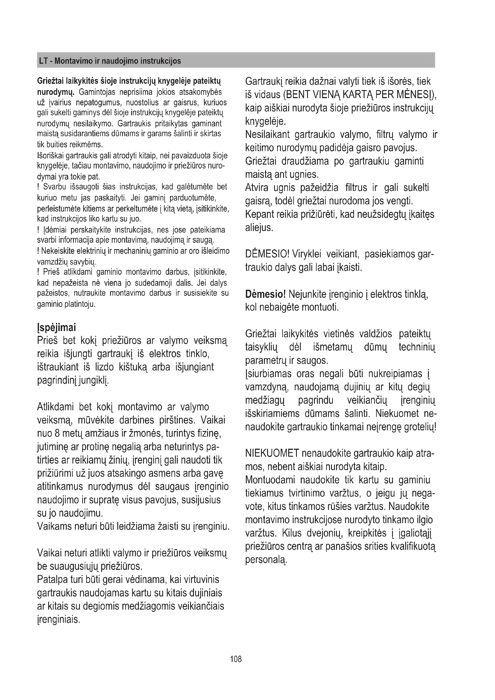- Paigutage elektroonilisi komponente sisaldav metallkarp kohta, kus see oleks võimalikeks parandustöödeks kergesti juurdepääsetav, ja ühendage selle elektrijuhtmed õhupuhastiga (joonis 11). Kasutamine Toote normaalseks toimimiseks tuleb avada väljatõmmatav paneel, toimides järgmiselt. Vajutage klaasi allapoole, nagu on näidatud joo- nisel 12. Klaas tuleb lahti ja tekib ava. Pärast väljatõmmatava paneeli avamist käivi- tage mootor, kasutades lülituspaneeli allpool kirjeldatud viisil. Paneeli sulgemiseks toimige samamoodi: vaju- tage klaasile, kuni paneel sulgub täielikult. T1. T2. T3. Sisse- ja väljalülitamine ja taimer: vajutage ja valige automaatse väljalülitumise aeg: Võimsus 1: 20 minutit Võimsus 2: 15 minutit Võimsus 3: 10 minutit Intensiivne võimsus: 5 minutit Tõmbevõimsuse vähendamine OFF 1: vajutage korduvalt, et vähendada tõmbe- võimsust kuni õhupuhasti väljalülitumiseni OFF 2: vajutage pikalt mistahes võimsusel Tõmbevõimsuse suurendamine (1-2-3-Intensiivne) Intensiivne võimsus kestab u 5 minutit, misjärel lüli- tub automaatselt sisse võimsus 2.107 Filtrite küllastumise näidik Õhupuhasti annab märku, kui on vaja ltreid hooldada. Rasvalter (u iga 40 kasutustunni järel): kõik sinised LED-tuled. Aktiivsöega lõhnalter (u iga 160 kasutustunni järel): kõik sinised LED-tuled, tuled L2 ja L3 vilguvad. Filtrite küllastumise näidiku nullimine Pärast ltrite hooldamist vajutage pikalt nuppe T1 ja T3. Tu- led L1, L2 ja L3 vilguvad lühikest aega siniselt ja seejärel kustuvad. Aktiivsöega lõhnaltri küllastumise näidiku aktiveeri- mine See näidik on tavaliselt deaktiveeritud. Näidiku aktiveerimi- seks toimige järgmiselt. Kui õhupuhasti on välja lülitatud, vajutage pikalt ja samaa- egselt nuppe T1 ja T2. Kõigepealt süttib tuli L1 ning seejärel ka L2 ja L3. Pärast vajutamise lõpetamist vilguvad L2 ja L3 lühikest aega, näidates, et aktiveerumine on toimunud. Söeltri küllastumise näidiku deaktiveerimine: korrake eespool kirjeldatud toimingut. Kõigepealt süttivad sama- aegselt tuled L1, L2 ja L3; pärast vajutamise lõpetamist tuled L2 ja L3 kustuvad, näidates, et deaktiveerumine on toimunud. HOOLDUS Rasvalter Eemaldab toiduvalmistamisel tekkivad rasvaosakesed. Puhastada kord kuus (või kui ltrite küllastumise näidik – juhul kui see on mudelil olemas – selleks märku annab) pehmetoimelise puhastusvahendiga kas käsitsi või madalal temperatuuril ja lühikese tsükliga nõudepesumasinas. Nõudepesumasinas pesemisel võib metallist rasvaltri värv tuhmuda, kuid selle ltreerimisomadused jäävad täielikult muutumatuks. Aktiivsöega lter (üksnes ltreerimisrežiimi korral) Eemaldab toiduvalmistamisel tekkiva ebameeldiva lõhna. Söeltri küllastumise aeg sõltub toiduvalmistamise viisist ja rasvaltri puhastamise korrapärasusest. Igal juhul tuleb ltrikassett asendada maksimaalselt iga nelja kuu tagant. Söeltrite paigaldamiseks tuleb rasvaltrid välja võtta (joo- nis 8).108 LT - Montavimo ir naudojimo instrukcijos Griežtai laikykitės šioje instrukcijų knygelėje pateiktų nurodymų. Gamintojas neprisiima jokios atsakomybės už įvairius nepatogumus, nuostolius ar gaisrus, kuriuos gali sukelti gaminys dėl šioje instrukcijų knygelėje pateiktų nurodymų nesilaikymo. Gartraukis pritaikytas gaminant maistą susidarantiems dūmams ir garams šalinti ir skirtas tik buities reikmėms. Išoriškai gartraukis gali atrodyti kitaip, nei pavaizduota šioje knygelėje, tačiau montavimo, naudojimo ir priežiūros nuro- dymai yra tokie pat. ! Svarbu išsaugoti šias instrukcijas, kad galėtumėte bet kuriuo metu jas paskaityti. Jei gaminį parduotumėte, perleistumėte kitiems ar perkeltumėte į kitą vietą, įsitikinkite, kad instrukcijos liko kartu su juo. ! Įdėmiai perskaitykite instrukcijas, nes jose pateikiama svarbi informacija apie montavimą, naudojimą ir saugą. ! Nekeiskite elektrinių ir mechaninių gaminio ar oro išleidimo vamzdžių savybių. ! Prieš atlikdami gaminio montavimo darbus, įsitikinkite, kad nepažeista nė viena jo sudedamoji dalis. Jei dalys pažeistos, nutraukite montavimo darbus ir susisiekite su gaminio platintoju. Įspėjimai Prieš bet kokį priežiūros ar valymo veiksmą reikia išjungti gartraukį iš elektros tinklo, ištraukiant iš lizdo kištuką arba išjungiant pagrindinį jungiklį. Atlikdami bet kokį montavimo ar valymo veiksmą, mūvėkite darbines pirštines. Vaikai nuo 8 metų amžiaus ir žmonės, turintys zinę, jutiminę ar protinę negalią arba neturintys pa- tirties ar reikiamų žinių, įrenginį gali naudoti tik prižiūrimi už juos atsakingo asmens arba gavę atitinkamus nurodymus dėl saugaus įrenginio naudojimo ir supratę visus pavojus, susijusius su jo naudojimu. Vaikams neturi būti leidžiama žaisti su įrenginiu. Vaikai neturi atlikti valymo ir priežiūros veiksmų be suaugusiųjų priežiūros. Patalpa turi būti gerai vėdinama, kai virtuvinis gartraukis naudojamas kartu su kitais dujiniais ar kitais su degiomis medžiagomis veikiančiais įrenginiais. Gartraukį reikia dažnai valyti tiek iš išorės, tiek iš vidaus (BENT VIENĄ KARTĄ PER MĖNESĮ), kaip aiškiai nurodyta šioje priežiūros instrukcijų knygelėje. Nesilaikant gartraukio valymo, ltrų valymo ir keitimo nurodymų padidėja gaisro pavojus. Griežtai draudžiama po gartraukiu gaminti maistą ant ugnies. Atvira ugnis pažeidžia ltrus ir gali sukelti gaisrą, todėl griežtai nurodoma jos vengti. Kepant reikia prižiūrėti, kad neužsidegtų įkaitęs aliejus. DĖMESIO! Viryklei veikiant, pasiekiamos gar- traukio dalys gali labai įkaisti. Dėmesio! Nejunkite įrenginio į elektros tinklą, kol nebaigėte montuoti. Griežtai laikykitės vietinės valdžios pateiktų taisyklių dėl išmetamų dūmų techninių parametrų ir saugos. Įsiurbiamas oras negali būti nukreipiamas į vamzdyną, naudojamą dujinių ar kitų degių medžiagų pagrindu veikiančių įrenginių išskiria