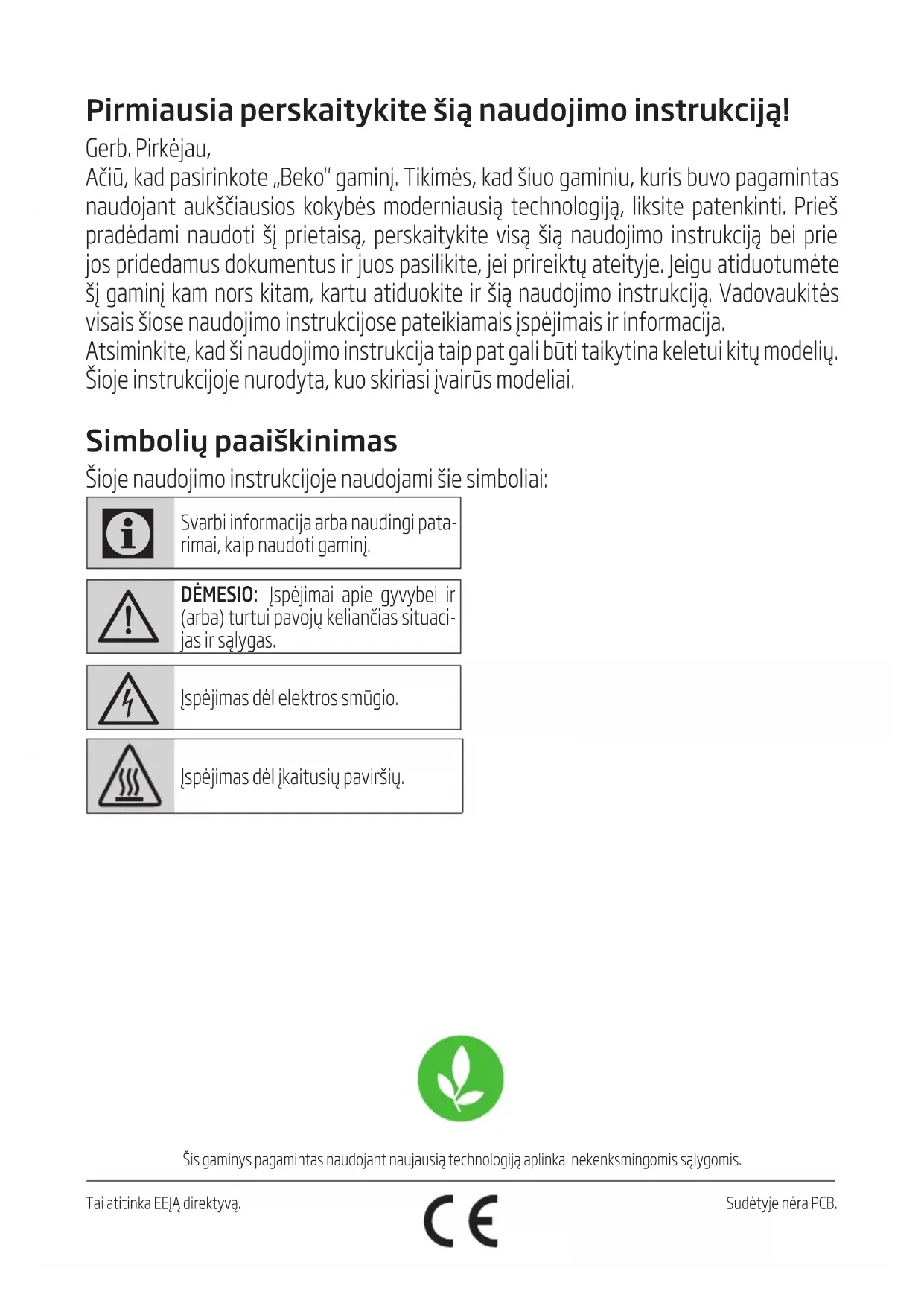 - Pakendage seade nii, et see ei saa transportimi- sel kahjustusi.Tai atitinka EEĮĄ direktyvą.Šis gaminys pagamintas naudojant naujausią technologiją aplinkai nekenksmingomis sąlygomis. Pirmiausia perskaitykite šią naudojimo instrukciją! Gerb. Pirkėjau, Ačiū, kad pasirinkote „Beko" gaminį. Tikimės, kad šiuo gaminiu, kuris buvo pagamintas naudojant aukščiausios kokybės moderniausią technologiją, liksite patenkinti. Prieš pradėdami naudoti šį prietaisą, perskaitykite visą šią naudojimo instrukciją bei prie jos pridedamus dokumentus ir juos pasilikite, jei prireiktų ateityje. Jeigu atiduotumėte šį gaminį kam nors kitam, kartu atiduokite ir šią naudojimo instrukciją. Vadovaukitės visais šiose naudojimo instrukcijose pateikiamais įspėjimais ir informacija. Atsiminkite, kad ši naudojimo instrukcija taip pat gali būti taikytina keletui kitų modelių. Šioje instrukcijoje nurodyta, kuo skiriasi įvairūs modeliai. Simbolių paaiškinimas Šioje naudojimo instrukcijoje naudojami šie simboliai: