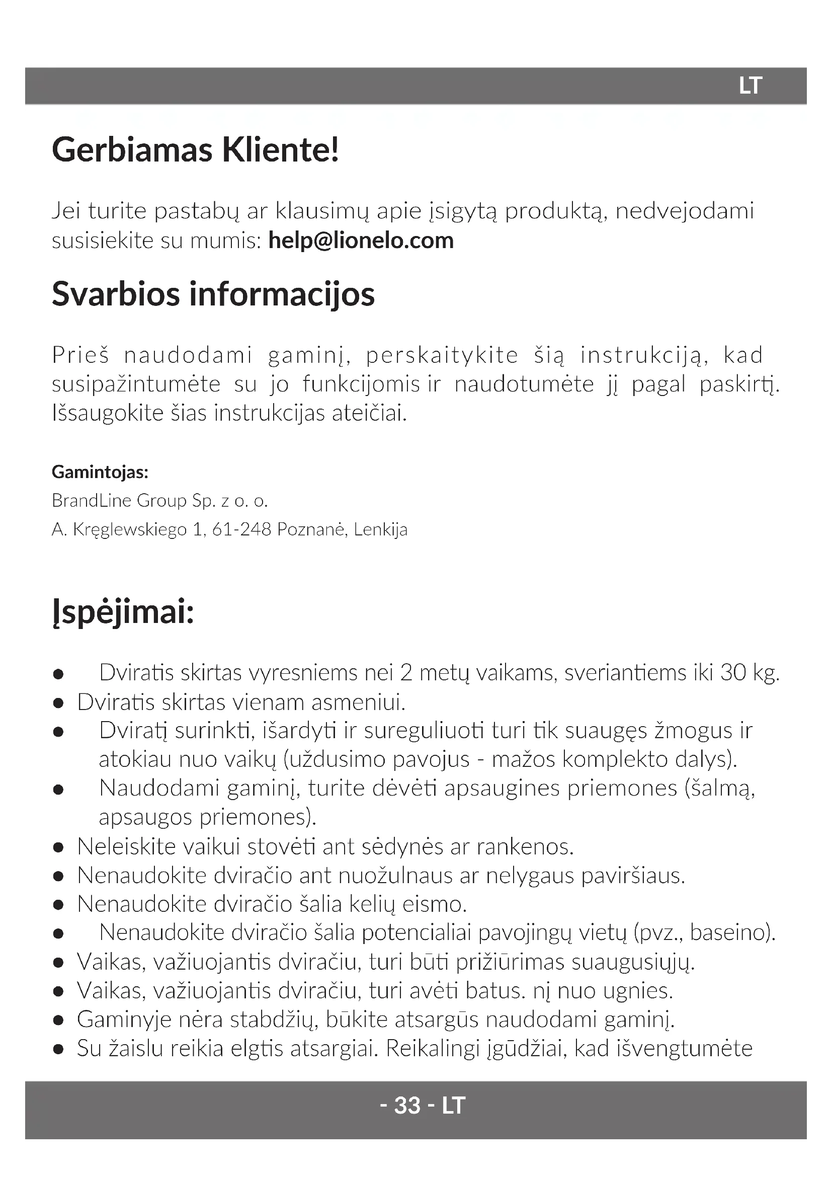 - Gaminyje nėra stabdžių, būkite atsargūs naudodami gaminį.