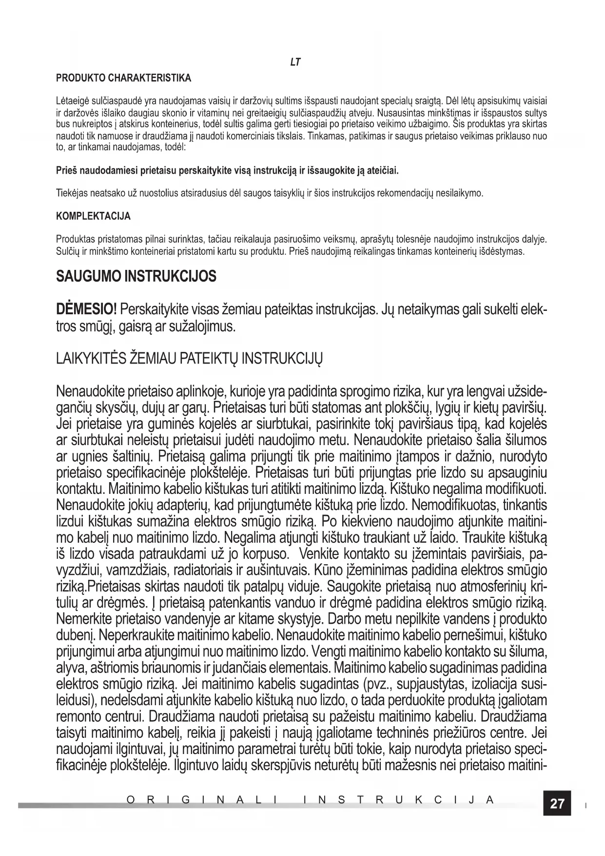 Nenaudokite prietaiso aplinkoje, kurioje yra padidinta sprogimo rizika, kur yra lengvai užside- gančių skysčių, dujų ar garų. Prietaisas turi būti statomas ant plokščių, lygių ir kietų paviršių. Jei prietaise yra guminės kojelės ar siurbtukai, pasirinkite tokį paviršiaus tipą, kad kojelės ar siurbtukai neleistų prietaisui judėti naudojimo metu. Nenaudokite prietaiso šalia šilumos ar ugnies šaltinių. Prietaisą galima prijungti tik prie maitinimo įtampos ir dažnio, nurodyto prietaiso specifi kacinėje plokštelėje. Prietaisas turi būti prijungtas prie lizdo su apsauginiu kontaktu. Maitinimo kabelio kištukas turi atitikti maitinimo lizdą. Kištuko negalima modifi kuoti. Nenaudokite jokių adapterių, kad prijungtumėte kištuką prie lizdo. Nemodifi kuotas, tinkantis lizdui kištukas sumažina elektros smūgio riziką. Po kiekvieno naudojimo atjunkite maitini- mo kabelį nuo maitinimo lizdo. Negalima atjungti kištuko traukiant už laido. Traukite kištuką iš lizdo visada patraukdami už jo korpuso. Venkite kontakto su įžemintais paviršiais, pa- vyzdžiui, vamzdžiais, radiatoriais ir aušintuvais. Kūno įžeminimas padidina elektros smūgio riziką.Prietaisas skirtas naudoti tik patalpų viduje. Saugokite prietaisą nuo atmosferinių kri- tulių ar drėgmės. Į prietaisą patenkantis vanduo ir drėgmė padidina elektros smūgio riziką. Nemerkite prietaiso vandenyje ar kitame skystyje. Darbo metu nepilkite vandens į produkto dubenį. Neperkraukite maitinimo kabelio. Nenaudokite maitinimo kabelio pernešimui, kištuko prijungimui arba atjungimui nuo maitinimo lizdo. Vengti maitinimo kabelio kontakto su šiluma, alyva, aštriomis briaunomis ir judančiais elementais. Maitinimo kabelio sugadinimas padidina elektros smūgio riziką. Jei maitinimo kabelis sugadintas (pvz., supjaustytas, izoliacija susi- leidusi), nedelsdami atjunkite kabelio kištuką nuo lizdo, o tada perduokite produktą įgaliotam remonto centrui. Draudžiama naudoti prietaisą su pažeistu maitinimo kabeliu. Draudžiama taisyti maitinimo kabelį, reikia jį pakeisti į naują įgaliotame techninės priežiūros centre. Jei naudojami ilgintuvai, jų maitinimo parametrai turėtų būti tokie, kaip nurodyta prietaiso speci- fi kacinėje plokštelėje. Ilgintuvo laidų skerspjūvis neturėtų būti mažesnis nei prietaiso maitini-28 ORIGINALI INSTRUKCIJA