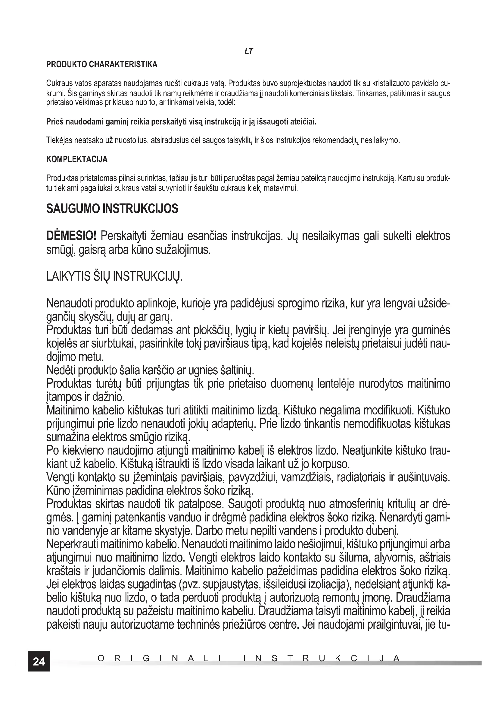 PRODUKTO CHARAKTERISTIKA Cukraus vatos aparatas naudojamas ruošti cukraus vatą. Produktas buvo suprojektuotas naudoti tik su kristalizuoto pavidalo cu- krumi. Šis gaminys skirtas naudoti tik namų reikmėms ir draudžiama jį naudoti komerciniais tikslais. Tinkamas, patikimas ir saugus prietaiso veikimas priklauso nuo to, ar tinkamai veikia, todėl: Prieš naudodami gaminį reikia perskaityti visą instrukciją ir ją išsaugoti ateičiai. Tiekėjas neatsako už nuostolius, atsiradusius dėl saugos taisyklių ir šios instrukcijos rekomendacijų nesilaikymo. KOMPLEKTACIJA Produktas pristatomas pilnai surinktas, tačiau jis turi būti paruoštas pagal žemiau pateiktą naudojimo instrukciją. Kartu su produk- tu tiekiami pagaliukai cukraus vatai suvynioti ir šaukštu cukraus kiekį matavimui. SAUGUMO INSTRUKCIJOS DĖMESIO! Perskaityti žemiau esančias instrukcijas. Jų nesilaikymas gali sukelti elektros smūgį, gaisrą arba kūno sužalojimus. LAIKYTIS ŠIŲ INSTRUKCIJŲ. Nenaudoti produkto aplinkoje, kurioje yra padidėjusi sprogimo rizika, kur yra lengvai užside- gančių skysčių, dujų ar garų. Produktas turi būti dedamas ant plokščių, lygių ir kietų paviršių. Jei įrenginyje yra guminės kojelės ar siurbtukai, pasirinkite tokį paviršiaus tipą, kad kojelės neleistų prietaisui judėti nau- dojimo metu. Nedėti produkto šalia karščio ar ugnies šaltinių. Produktas turėtų būti prijungtas tik prie prietaiso duomenų lentelėje nurodytos maitinimo įtampos ir dažnio. Maitinimo kabelio kištukas turi atitikti maitinimo lizdą. Kištuko negalima modifi kuoti. Kištuko prijungimui prie lizdo nenaudoti jokių adapterių. Prie lizdo tinkantis nemodifi kuotas kištukas sumažina elektros smūgio riziką. Po kiekvieno naudojimo atjungti maitinimo kabelį iš elektros lizdo. Neatjunkite kištuko trau- kiant už kabelio. Kištuką ištraukti iš lizdo visada laikant už jo korpuso. Vengti kontakto su įžemintais paviršiais, pavyzdžiui, vamzdžiais, radiatoriais ir aušintuvais. Kūno įžeminimas padidina elektros šoko riziką. Produktas skirtas naudoti tik patalpose. Saugoti produktą nuo atmosferinių kritulių ar drė- gmės. Į gaminį patenkantis vanduo ir drėgmė padidina elektros šoko riziką. Nenardyti gami- nio vandenyje ar kitame skystyje. Darbo metu nepilti vandens i produkto dubenį. Neperkrauti maitinimo kabelio. Nenaudoti maitinimo laido nešiojimui, kištuko prijungimui arba atjungimui nuo maitinimo lizdo. Vengti elektros laido kontakto su šiluma, alyvomis, aštriais kraštais ir judančiomis dalimis. Maitinimo kabelio pažeidimas padidina elektros šoko riziką. Jei elektros laidas sugadintas (pvz. supjaustytas, išsileidusi izoliacija), nedelsiant atjunkti ka- belio kištuką nuo lizdo, o tada perduoti produktą į autorizuotą remontų įmonę. Draudžiama naudoti produktą su pažeistu maitinimo kabeliu. Draudžiama taisyti maitinimo kabelį, jį reikia pakeisti nauju autorizuotame techninės priežiūros centre. Jei naudojami prailgintuvai, jie tu-25 ORIGINALI INSTRUKCIJA