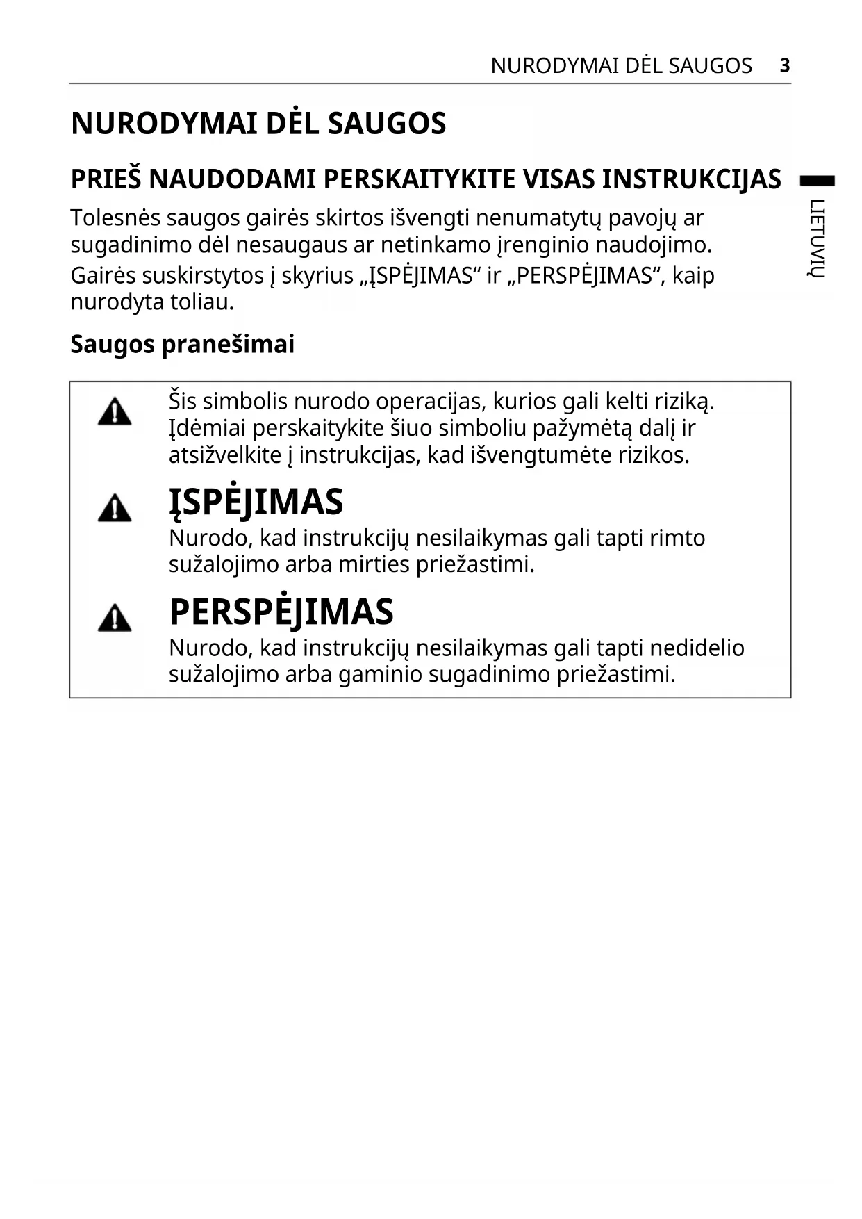 Tolesnės saugos gairės skirtos išvengti nenumatytų pavojų ar sugadinimo dėl nesaugaus ar netinkamo įrenginio naudojimo. Gairės suskirstytos į skyrius „ĮSPĖJIMAS“ ir „PERSPĖJIMAS“, kaip nurodyta toliau. Saugos pranešimai Šis simbolis nurodo operacijas, kurios gali kelti riziką. Įdėmiai perskaitykite šiuo simboliu pažymėtą dalį ir atsižvelkite į instrukcijas, kad išvengtumėte rizikos. ĮSPĖJIMAS Nurodo, kad instrukcijų nesilaikymas gali tapti rimto sužalojimo arba mirties priežastimi. PERSPĖJIMAS Nurodo, kad instrukcijų nesilaikymas gali tapti nedidelio sužalojimo arba gaminio sugadinimo priežastimi.4