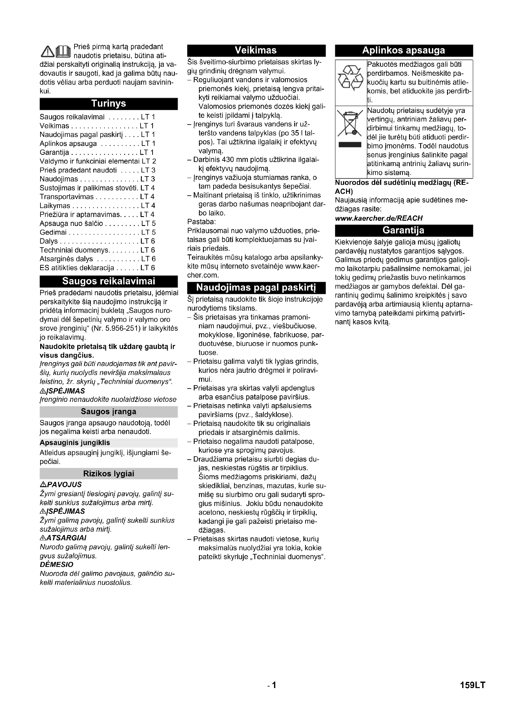 Chairman of the Board of Management Director Regulatory Affairs & Certification 158 LV- 1 Prieš pirmą kartą pradedant naudotis prietaisu, būtina ati- džiai perskaityti originalią instrukciją, ja va- dovautis ir saugoti, kad ja galima būtų nau- dotis vėliau arba perduoti naujam savinin- kui. Prieš pradėdami naudotis prietaisu, įdėmiai perskaitykite šią naudojimo instrukciją ir pridėtą informacinį bukletą „Saugos nuro- dymai dėl šepetinių valymo ir valymo oro srove įrenginių“ (Nr. 5.956-251) ir laikykitės jo reikalavimų. Naudokite prietaisą tik uždarę gaubtą ir visus dangčius. Įrenginys gali būti naudojamas tik ant pavir- šių, kurių nuolydis neviršija maksimalaus leistino, žr. skyrių „Techniniai duomenys“. 몇 ĮSPĖJIMAS Įrenginio nenaudokite nuolaidžiose vietose Saugos įranga apsaugo naudotoją, todėl jos negalima keisti arba nenaudoti. Atleidus apsauginį jungiklį, išjungiami še- pečiai. PAVOJUS Žymi gresiantį tiesioginį pavojų, galintį su- kelti sunkius sužalojimus arba mirtį. 몇 ĮSPĖJIMAS Žymi galimą pavojų, galintį sukelti sunkius sužalojimus arba mirtį. 몇 ATSARGIAI Nurodo galimą pavojų, galintį sukelti len- gvus sužalojimus. DĖMESIO Nuoroda dėl galimo pavojaus, galinčio su- kelti materialinius nuostolius. Šis šveitimo-siurbimo prietaisas skirtas ly- gių grindinių drėgnam valymui. – Reguliuojant vandens ir valomosios priemonės kiekį, prietaisą lengva pritai- kyti reikiamai valymo užduočiai. Valomosios priemonės dozės kiekį gali- te keisti įpildami į talpyklą. – Įrenginys turi švaraus vandens ir už- teršto vandens talpyklas (po 35 l tal- pos). Tai užtikrina ilgalaikį ir efektyvų valymą. – Darbinis 430 mm plotis užtikrina ilgalai- kį efektyvų naudojimą. – Įrenginys važiuoja stumiamas ranka, o tam padeda besisukantys šepečiai. – Maitinant prietaisą iš tinklo, užtikrinimas geras darbo našumas neapribojant dar- bo laiko. Pastaba: Priklausomai nuo valymo užduoties, prie- taisas gali būti komplektuojamas su įvai- riais priedais. Teiraukitės mūsų katalogo arba apsilanky- kite mūsų interneto svetainėje www.kaer- cher.com. Šį prietaisą naudokite tik šioje instrukcijoje nurodytiems tikslams. – Šis prietaisas yra tinkamas pramoni- niam naudojimui, pvz., viešbučiuose, mokyklose, ligoninėse, fabrikuose, par- duotuvėse, biuruose ir nuomos punk- tuose. – Prietaisu galima valyti tik lygias grindis, kurios nėra jautrio drėgmei ir poliravi- mui. – Prietaisas yra skirtas valyti apdengtus arba esančius patalpose paviršius. – Prietaisas netinka valyti apšalusiems paviršiams (pvz., šaldyklose). – Prietaisą naudokite tik su originaliais priedais ir atsarginėmis dalimis. – Prietaiso negalima naudoti patalpose, kuriose yra sprogimų pavojus. – Draudžiama prietaisu siurbti degias du- jas, neskiestas rūgštis ar tirpiklius. Šioms medžiagoms priskiriami, dažų skiedikliai, benzinas, mazutas, kurie su- mišę su siurbimo oru gali sudaryti spro- gius mišinius. Jokiu būdu nenaudokite acetono, neskiestų rūgščių ir tirpiklių, kadangi jie gali pažeisti prietaiso me- džiagas. – Prietaisas skirtas naudoti vietose, kurių maksimalūs nuolydžiai yra tokia, kokie pateikti skyriuje „Techniniai duomenys“. Nuorodos dėl sudėtinių medžiagų (RE- ACH) Naujausią informaciją apie sudėtines me- džiagas rasite: www.kaercher.de/REACH Kiekvienoje šalyje galioja mūsų įgaliotų pardavėjų nustatytos garantijos sąlygos. Galimus priedų gedimus garantijos galioji- mo laikotarpiu pašalinsime nemokamai, jei tokių gedimų priežastis buvo netinkamos medžiagos ar gamybos defektai. Dėl ga- rantinių gedimų šalinimo kreipkitės į savo pardavėją arba artimiausią klientų aptarna- vimo tarnybą pateikdami pirkimą patvirti- nantį kasos kvitą. Turinys Saugos reikalavimai . . . . . . . . LT 1 Veikimas . . . . . . . . . . . . . . . . . LT 1 Naudojimas pagal paskirtį . . . . LT 1 Aplinkos apsauga . . . . . . . . . . LT 1 Garantija . . . . . . . . . . . . . . . . . LT 1 Valdymo ir funkciniai elementai LT 2 Prieš pradedant naudoti . . . . . LT 3 Naudojimas . . . . . . . . . . . . . . . LT 3 Sustojimas ir palikimas stovėti. LT 4 Transportavimas . . . . . . . . . . . LT 4 Laikymas . . . . . . . . . . . . . . . . . LT 4 Priežiūra ir aptarnavimas. . . . . LT 4 Apsauga nuo šalčio . . . . . . . . . LT 5 Gedimai . . . . . . . . . . . . . . . . . . LT 5 Dalys . . . . . . . . . . . . . . . . . . . . LT 6 Techniniai duomenys. . . . . . . . LT 6 Atsarginės dalys . . . . . . . . . . . LT 6 ES atitikties deklaracija . . . . . . LT 6 Saugos reikalavimai Saugos įranga Apsauginis jungiklis Rizikos lygiai Veikimas Naudojimas pagal paskirtį Aplinkos apsauga Pakuotės medžiagos gali būti perdirbamos. Neišmeskite pa- kuočių kartu su buitinėmis atlie- komis, bet atiduokite jas perdirb- ti. Naudotų prietaisų sudėtyje yra vertingų, antriniam žaliavų per- dirbimui tinkamų medžiagų, to- dėl jie turėtų būti atiduoti perdir- bimo įmonėms. Todėl naudotus senus įrenginius šalinkite pagal atitinkamą antrinių žaliavų surin- kimo sistemą. Garantija 159LT- 2 1 Filtro tinklelis 2 Apsauginis jungiklis 3 Nešvaraus vandens išleidimo žarna su dozatoriumi 4 Homebase laikomasis bėgelis 5 Plūduras 6 Švaraus vandens bakas 7 Švaraus vandens bako dangtelis 8 Rankenos įduba 9 Valymo galva 10 Diskinis šepetys 11 Švaraus vandens bako pildymo anga 12 Šepečio keitimas svirtis 13 Užteršto vandens bakas 14 Švaraus vandens lygio indikatorius 15 Sukamoji rankena, skirta siurbimo rė- meliui pakreipti 16 Siurbimo rėmelio aukščio reguliavimas * 17 Sparninės veržlės, skirtos siurbimo rė- meliui pritvirtinti 18 Siurbimo rėmelis* 19 Siurbimo žarna 20 Vandens kiekio reguliavimo mygtukas 21 Maitinimo kabelis su kištuku 22 Siurbimo rėmelio nuleidimo svirtelė 23 Valdymo pultas 24 Stūmimo rankena 25 Valymo rinkinio „Homebase Box“ p